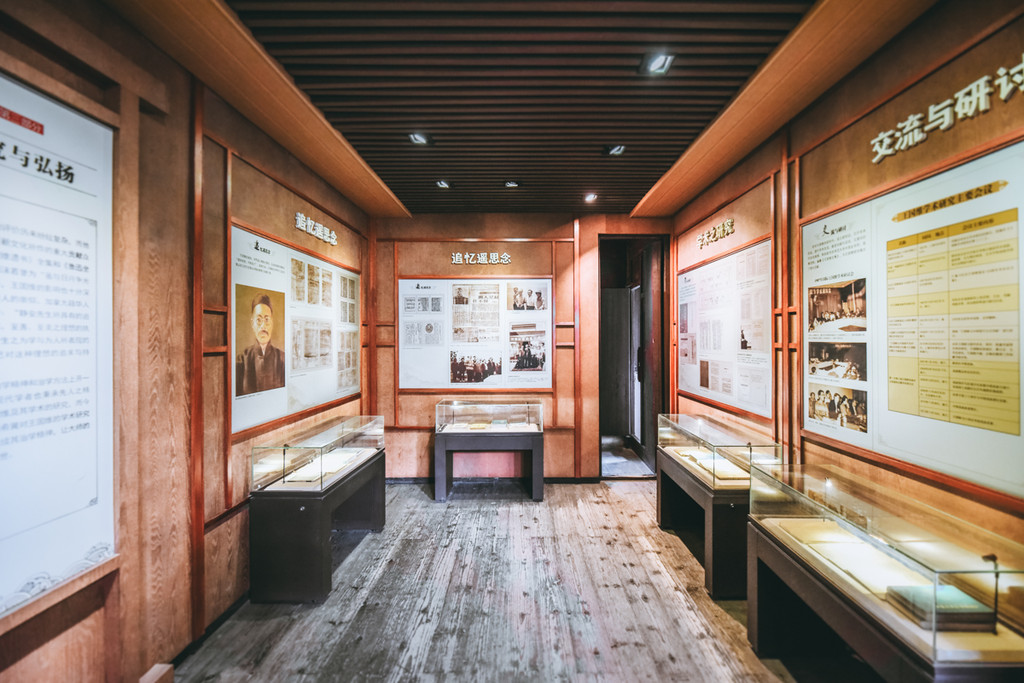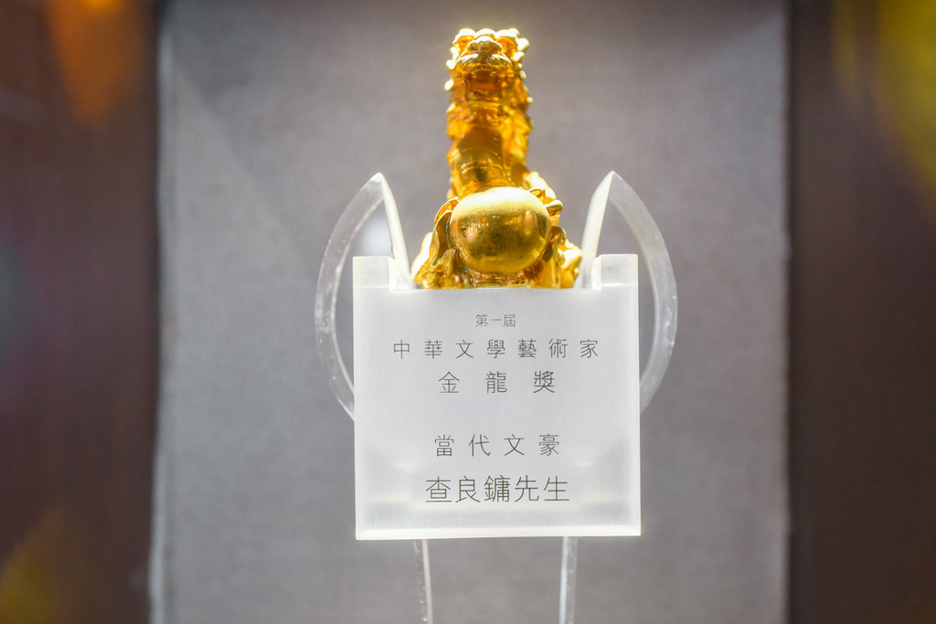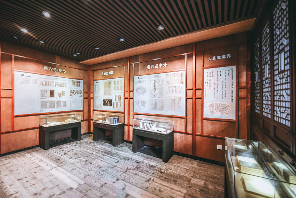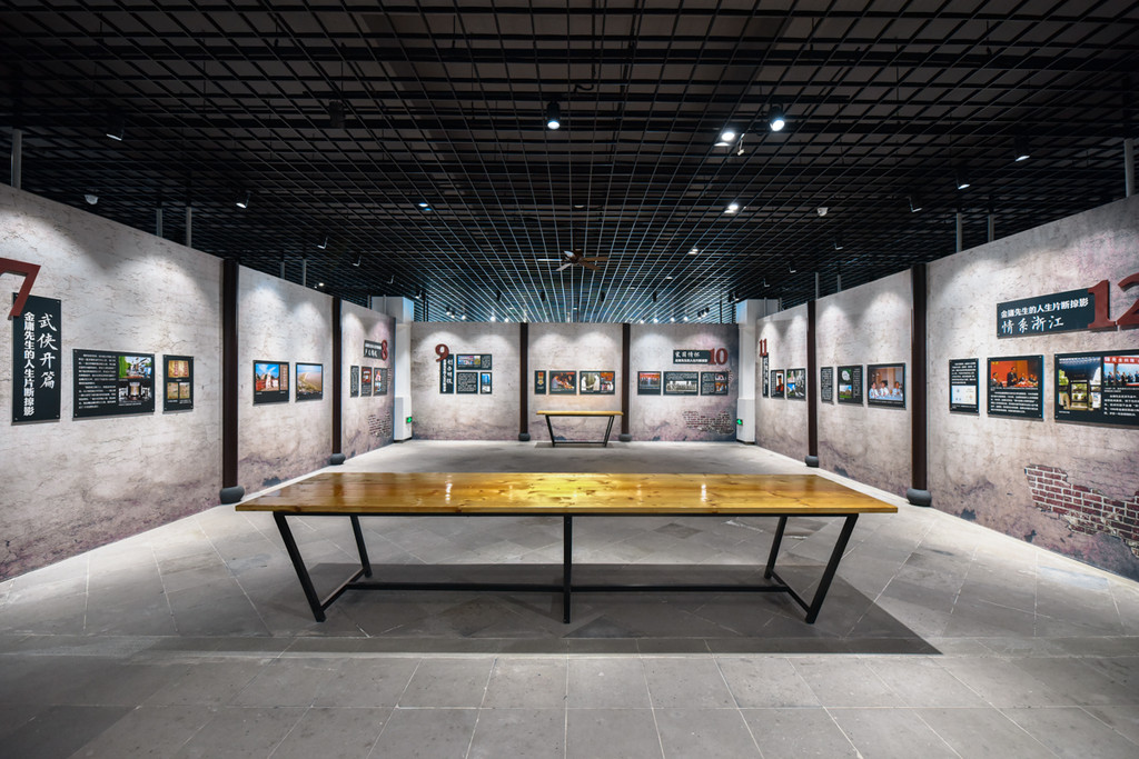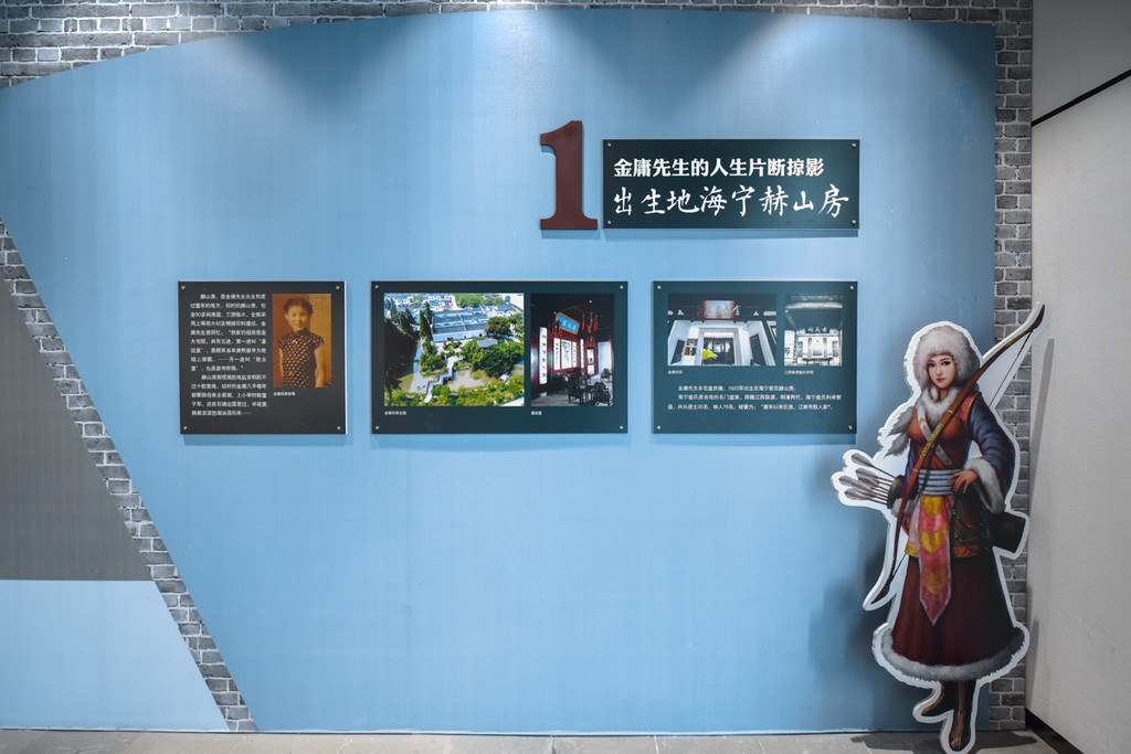 地面采用文化清水砖错拼,烘托出展厅的古朴沉稳。顶部黑色的格栅内镶有活动的轨道射灯,这样既便于照射展板,也渲染了展厅的气氛。底楼展示的是金庸的成就-“儒侠金庸陈列”,展厅正中的玻璃展柜里有金庸先生佩剑。在展厅灯光的照射下,即使剑未出鞘,也让人深深感受到了一种武侠的气息。展厅内四周设有展板,每个展板都附有柜体,既有文字说明,又有友人赠送的日文、韩文版金庸作品。印章展柜里收藏了“金庸书院”、“书剑堂”、“桃李门”等寿山石印章。二楼一排排木制的书柜里则收藏了金庸先生的著作。这是盐官执行最不能错过的展馆,不仅陈列很多真迹真品,很多奖杯证书都是独一无二的。