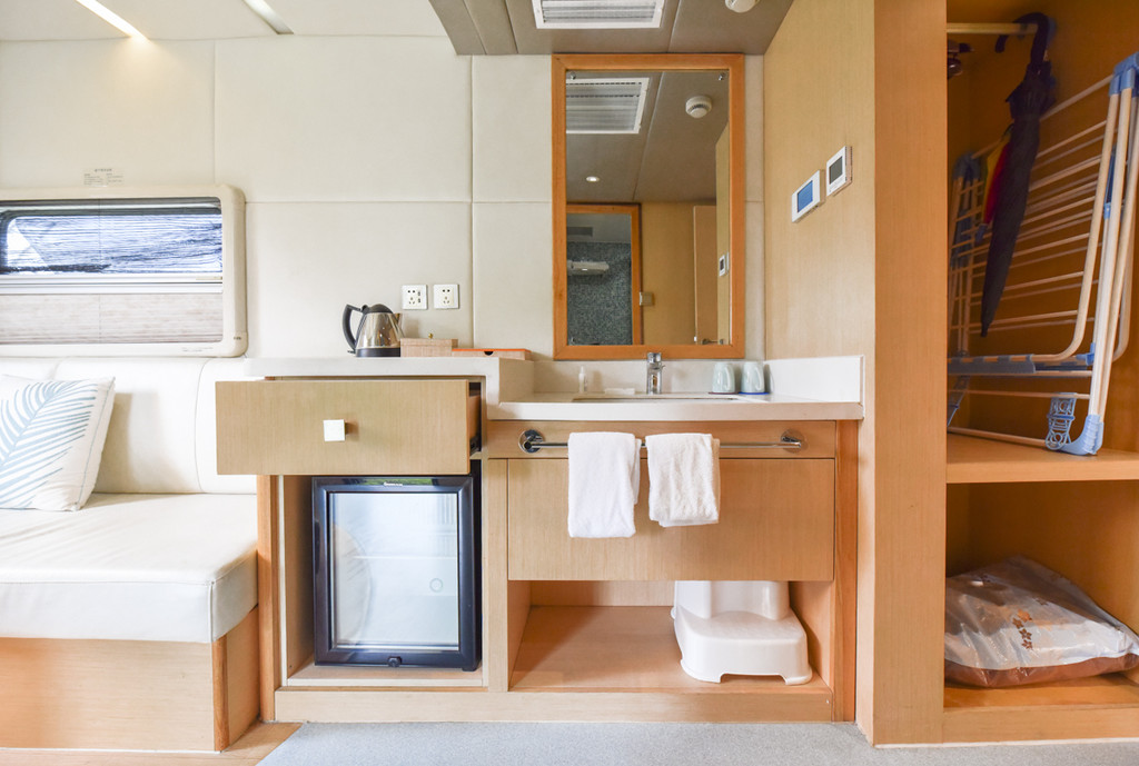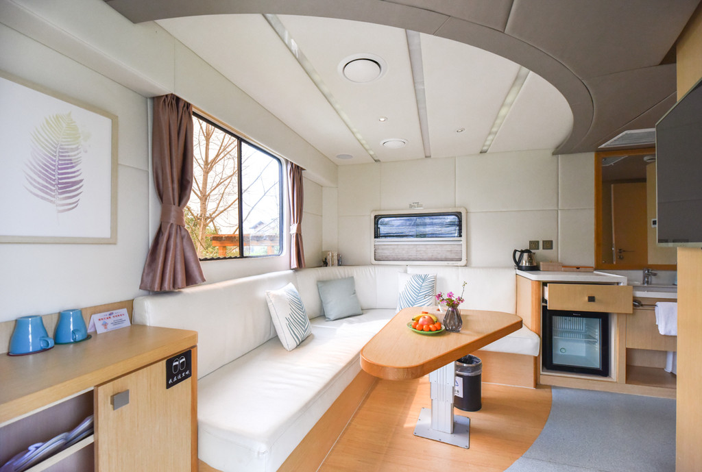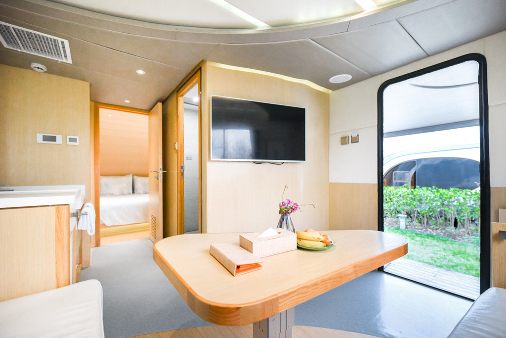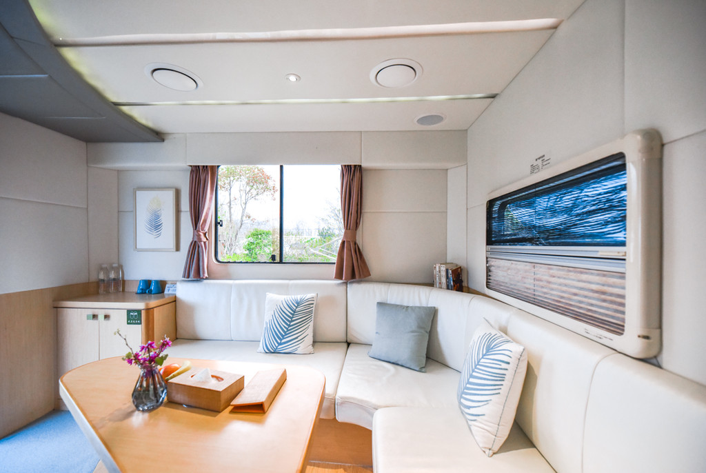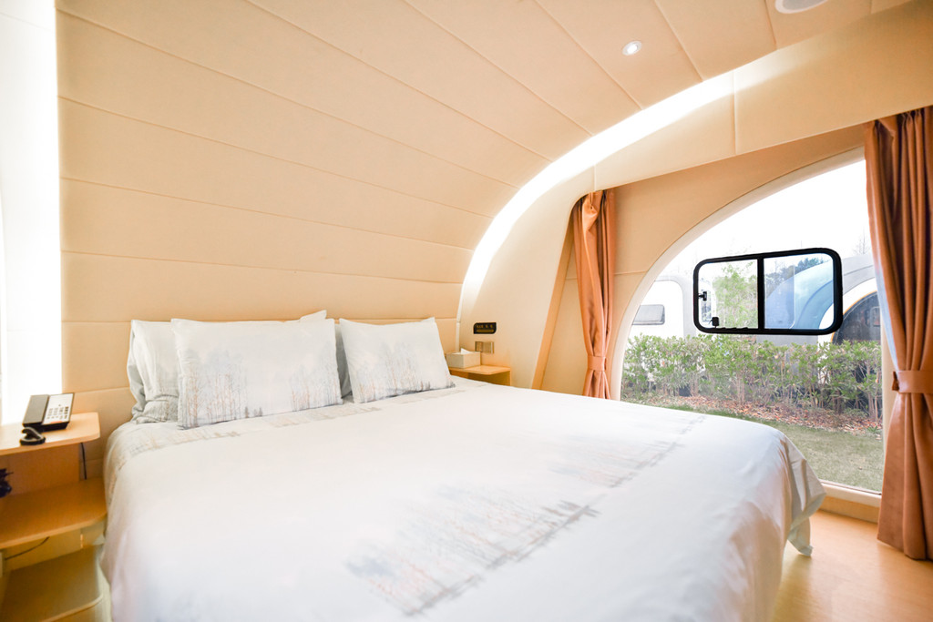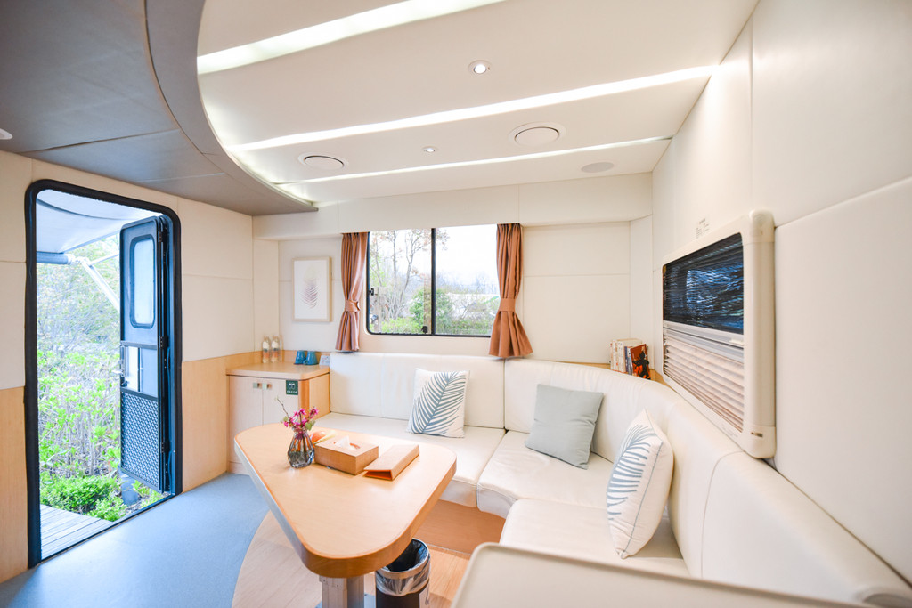 营地房车分为10米房车(亲子房,两床)和7米房车(情侣闺蜜房,大床)两种。两种房车内均设有多功能桌、时尚沙发、衣帽柜;配套无线网络设备、小米数字电视及游戏手柄;卫浴设施采取干湿分离布局。有两个卧室一个客厅,适合一家三口居住,同时主卧还配备了一扇3.7平米的全景式观景天窗,可以享受躺在床上看星星的乐趣。