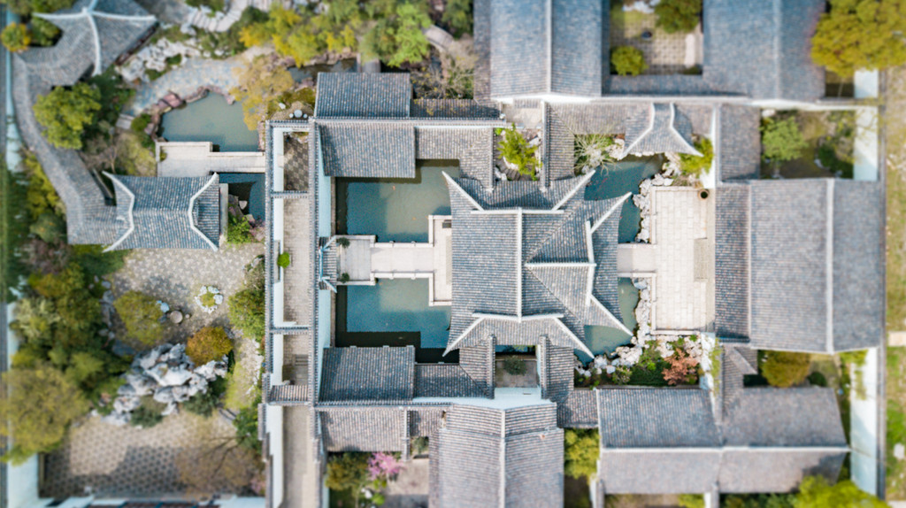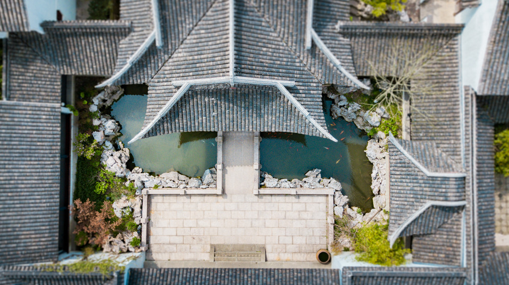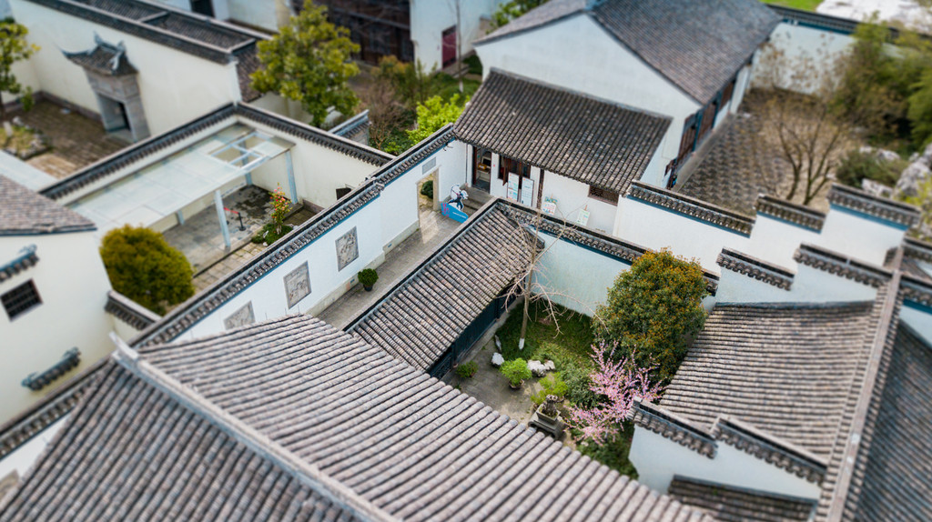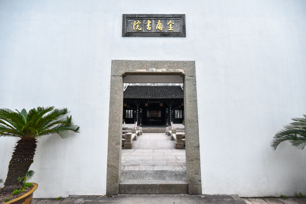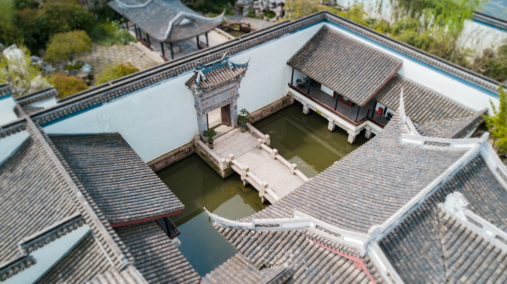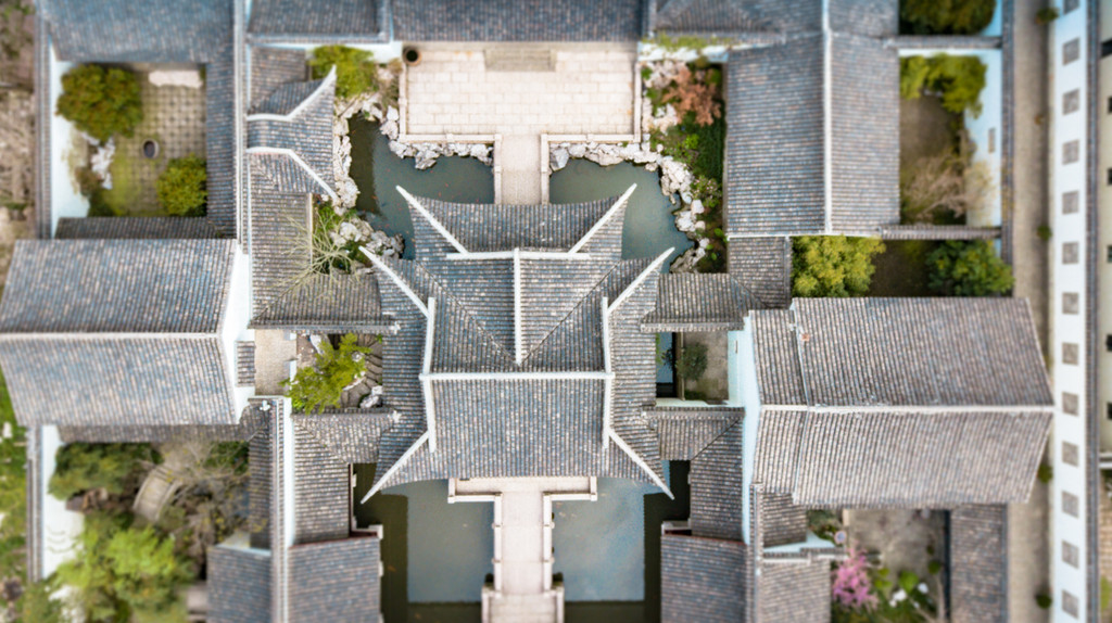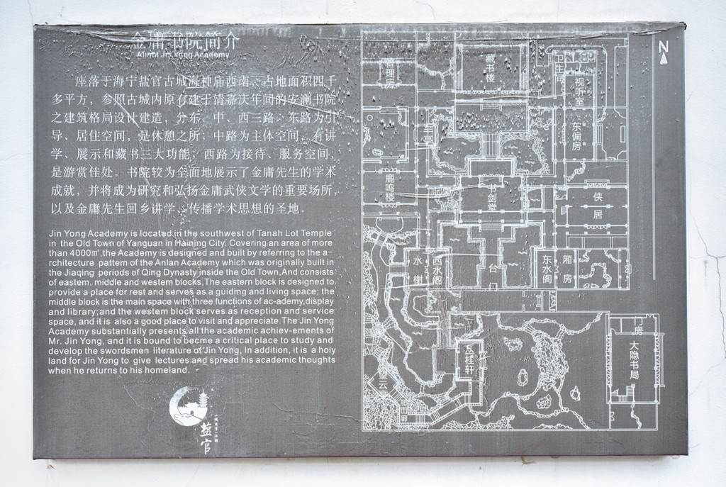 航拍视角下,2008年开工、2010年落成的金庸书院,建筑布局参照清朝最负盛名的经学家阮元在盐官创办的安澜书院建造。俯瞰之下,建筑大体中轴对称,院落、廊道、甬道融合,合围一处水池,像极了 江南 园林风格造诣。不过,粉墙瓦黛、烽火马头墙、格窗、砖木石雕、门罩、窗楣、照壁等这些元素,却是正经八百的徽派建筑特色。为何如此?接着往下说。