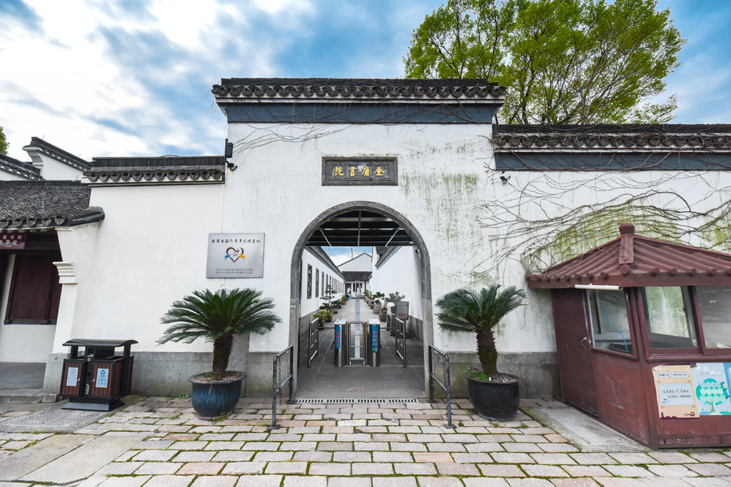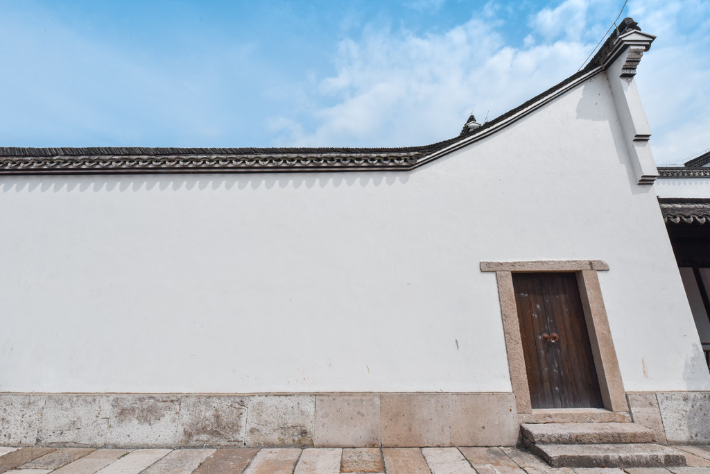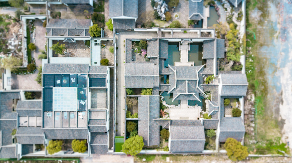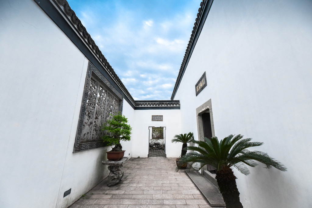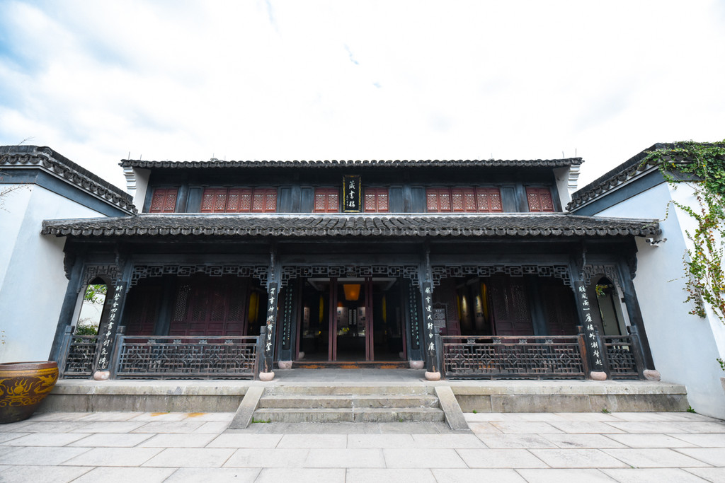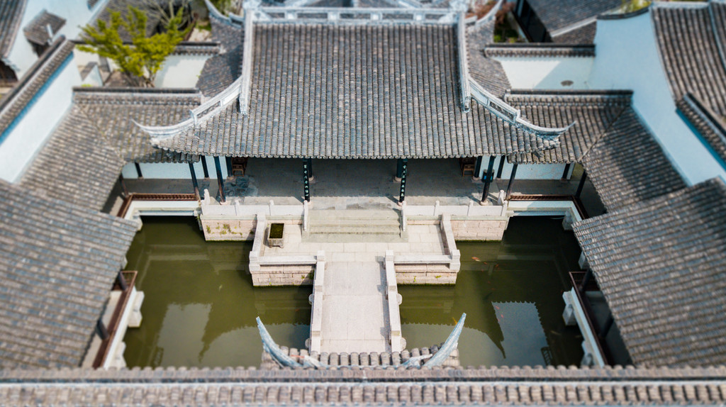 航拍视角下,2008年开工、2010年落成的金庸书院,建筑布局参照清朝最负盛名的经学家阮元在盐官创办的安澜书院建造。俯瞰之下,建筑大体中轴对称,院落、廊道、甬道融合,合围一处水池,像极了 江南 园林风格造诣。不过,粉墙瓦黛、烽火马头墙、格窗、砖木石雕、门罩、窗楣、照壁等这些元素,却是正经八百的徽派建筑特色。为何如此?接着往下说。