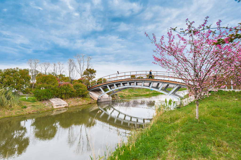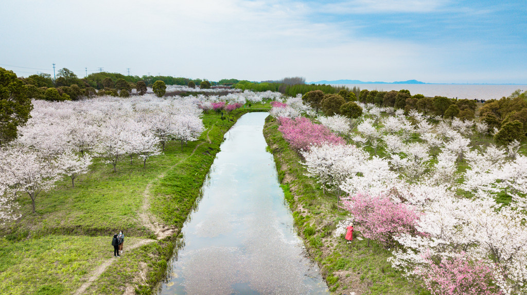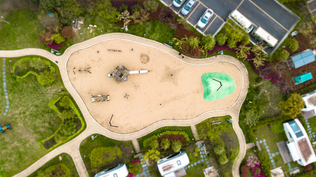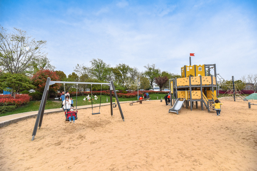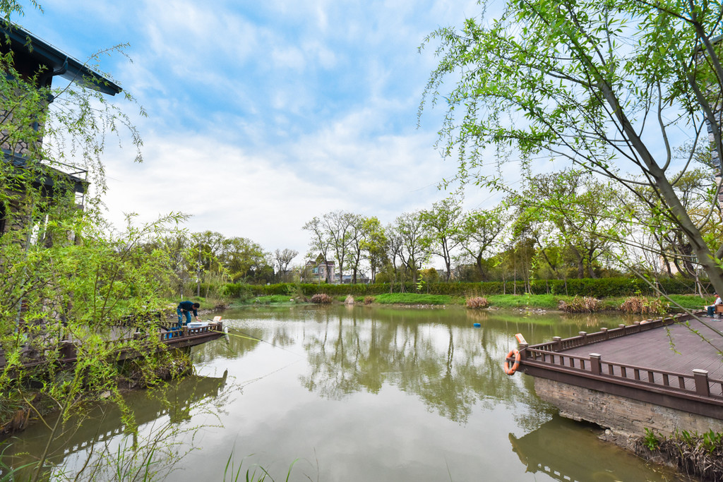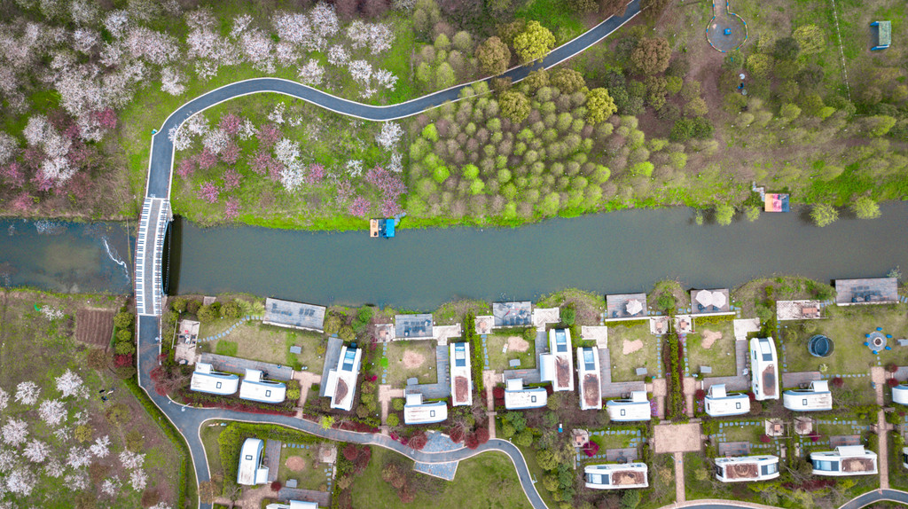 无人机视角下,白色如雪,粉色温馨,春风撩过,樱花落洋洋洒洒,这或许就是天生丽质的烂漫,酥化女人心的“美物”。金黄色沙地乐园、白色房车、五彩步桥、蓝色垂钓台,纵横交错镶嵌在绿草茵茵的绿毯上,一派生机盎然。很难想象,同样是临水而居,五千多年的良渚文化也在这繁衍生息。时光如逝水,水未干涸,人以千秋万代。