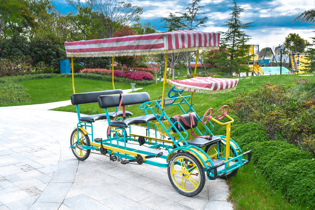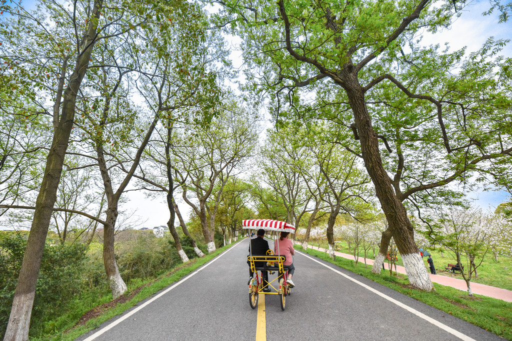 从百里钱塘生态绿带进入,可以租赁到双人观光脚踏车,一路骑行数里,不仅可达樱花林,也可行驶在笔直参天的古树林。也是很不错的体验。