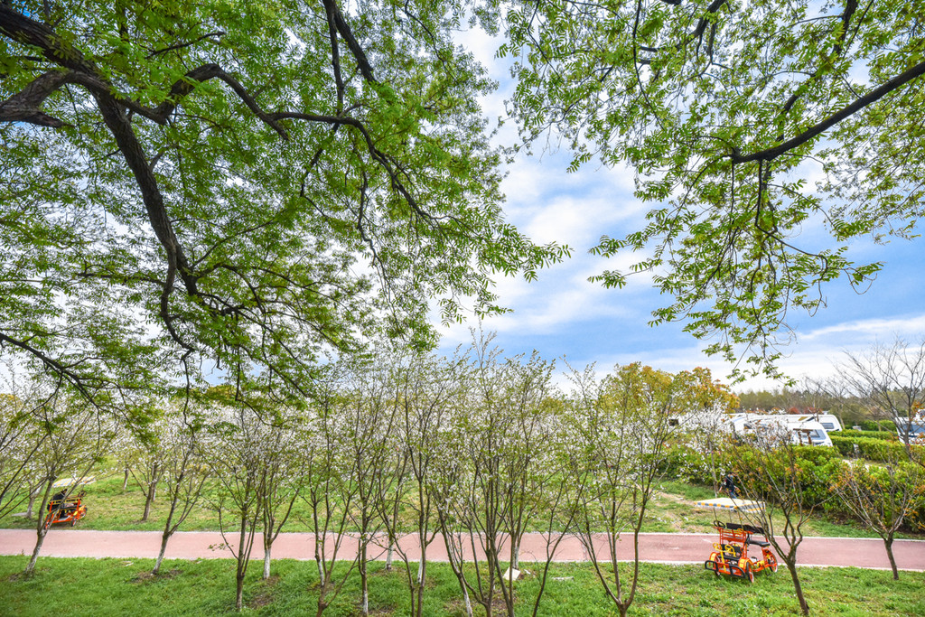 盐官观潮绿带,名副其实的绿野仙踪,古木参天,树荫婆娑。暖风习习,无论是骑行或漫步,都令人心旷神怡。疫情之后,心绪飞扬。好不容易在这如诗如画的风景中,无论做什么,人也格外精神焕发,朝气蓬勃。宅家云旅游、云赏花,终不如亲眼目睹、亲密接触。就是坐在樱花树下,躺在绿荫草地,都是“神仙”日子。