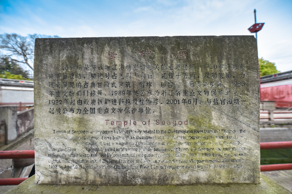 海神庙,不是古 罗马 神话里的海神波塞冬、尼普顿。它是国家级重点文物保护单位。建于清代雍正八年(1730年),这是座祀浙海之神的神庙。如海洪宁静一般,是人对大自然海潮祈福保平安之意。又如 福建 沿海一带,建有妈祖庙一样,当地人祈福渔民出海顺利、平安归来、庇佑沿海百姓安居 乐业 。不过海神,不比妈祖这般形象。妈祖是历史上确有其人其事,后人为了纪念所建,妈祖也被联合国授予 和平 女神,还是 中国 首个信俗类世界遗产。当然两种民间信仰,都是为了祈福泽润生民,一保平安。