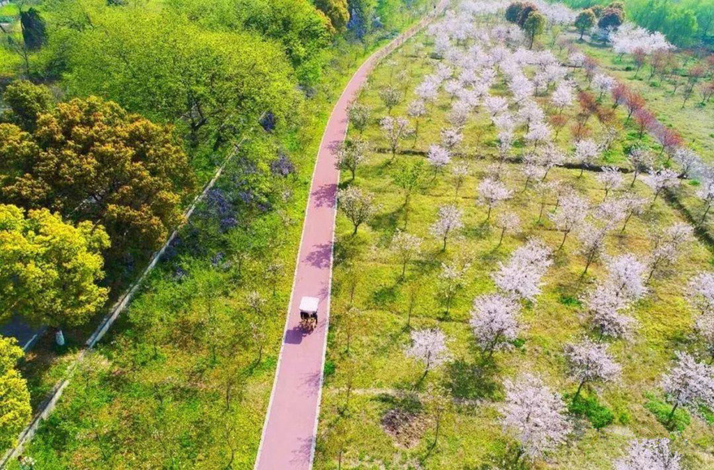 盐官百里钱塘樱花林位于盐官百里钱塘生态绿带内,有一片370亩、250000㎡的樱花林,这里种植了6000多株的樱花。此时正是樱花盛开的时令,一片片粉白、粉红的樱花如水墨画般渲染在绿带间,如梦似幻,此情此景,仿如进入人间仙境。