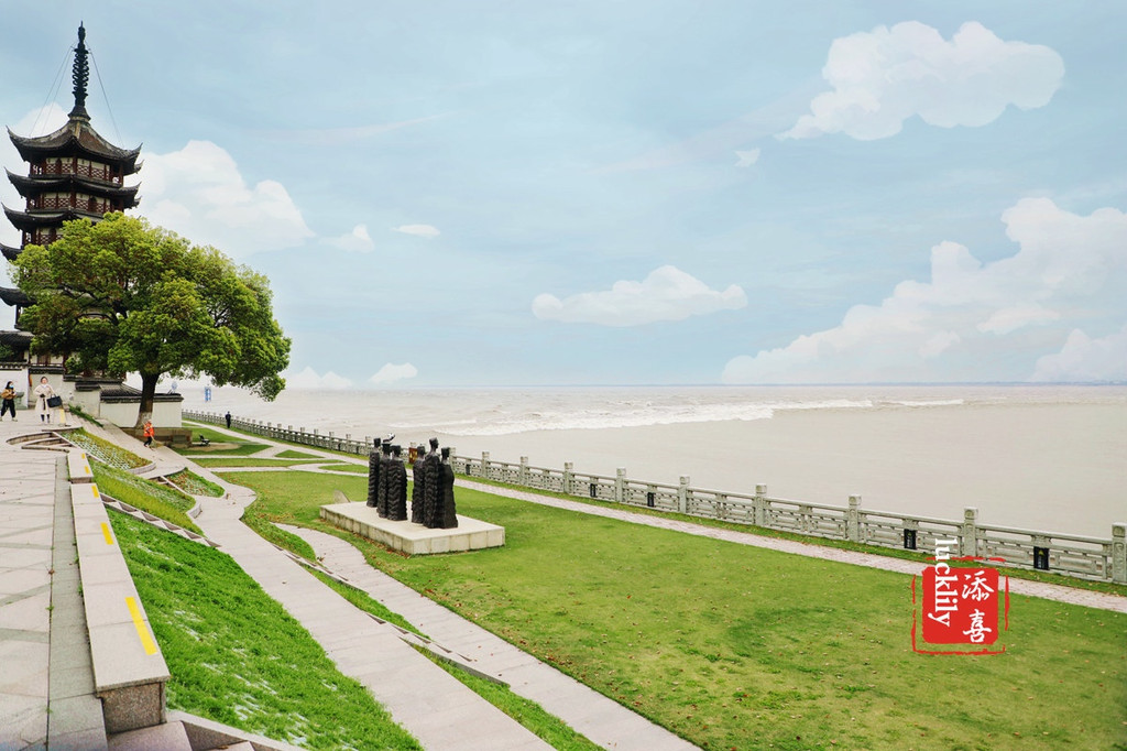 在古镇相领的区域兜兜转转参观了几处景点,实际花费的时间着实不多,最后必去的自是盐官观潮公园了,盐官以观潮出名,很多人都以为钱江潮一年只有一次,那真是错了,钱江潮水是天天都有的,只是每天潮水到达的时间不同。每次潮起的场景都很壮观,当然每年农历八月十八前后几天会是全年钱江潮涌气势最为磅礴的时段。