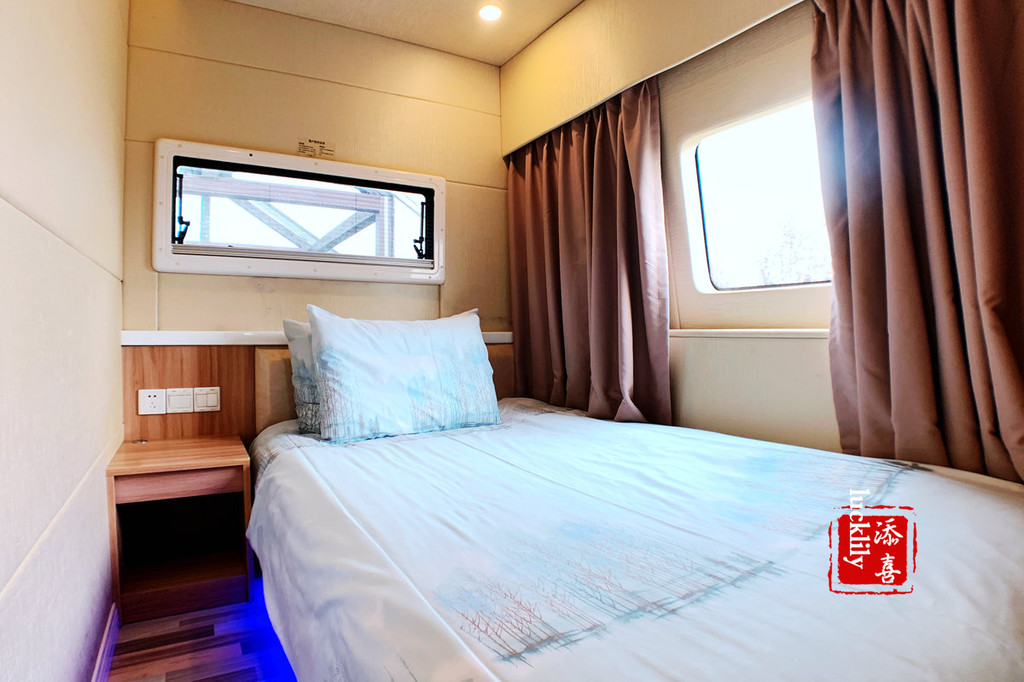 我们的房车真的很棒,有两个卧室,主卧的床顶是带有窗缦的天窗,晚上躺在床上就能看到星空,特别的浪漫。客厅中有宽敞的环形沙发,茶几上精心的放置了鲜花和欢迎果盘,柜子有儿童书籍,卡通凳子,还有儿童上卫生间可以用的小梯凳,洗漱用品都是开元酒店集团的统一标配,不过会多一套儿童牙具,鞋柜里也会多一双儿童拖鞋,难怪娃娃俨然一副车主的感觉,瞬间骄傲了起来,那一夜小主人睡得很香。
