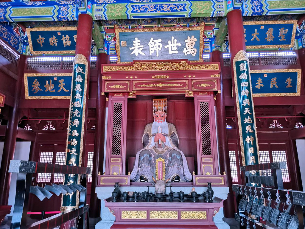 殿内,“万世师表”的匾额十分醒目,鲜亮的建筑风格也让人心情愉悦。孔子作为古代良师的代表性人物,几千年来,受世人敬仰。