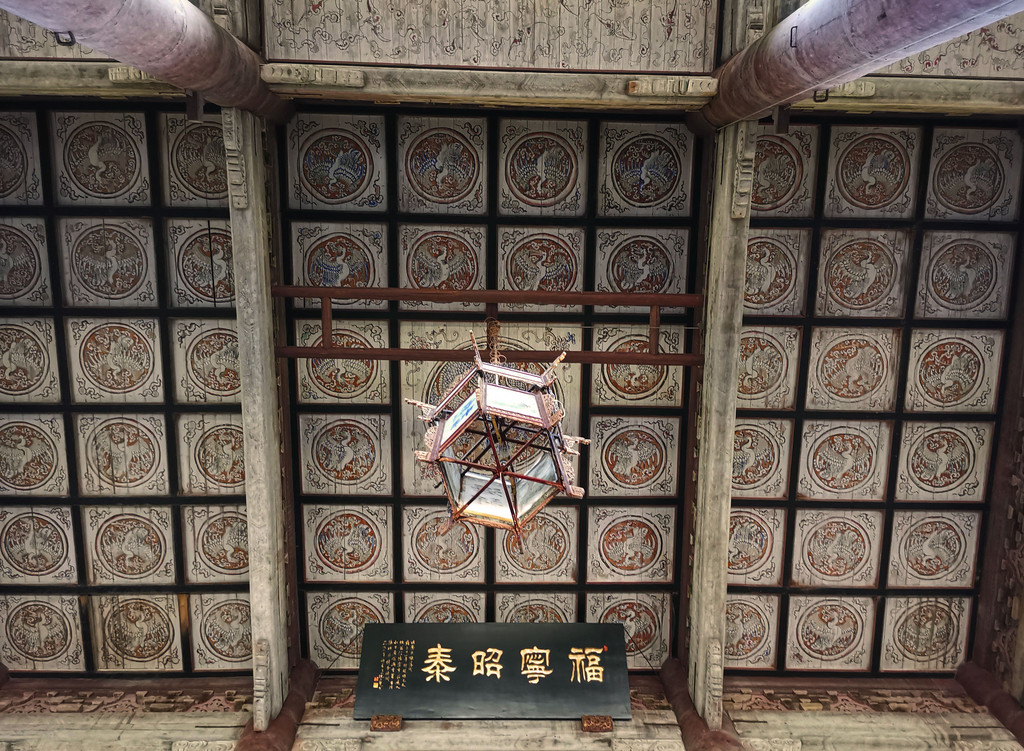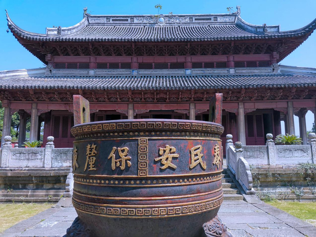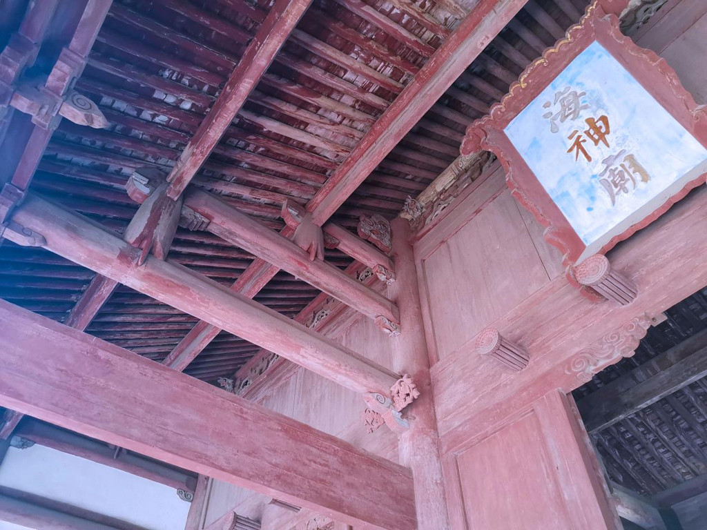 殿内匾额高悬,抬头望去,“九九归一”的团龙彩绘布满拱顶,又为这座海神庙增添了不少皇家威严。古朴的木质建筑让这座宫殿的历史显得更沧桑厚重。