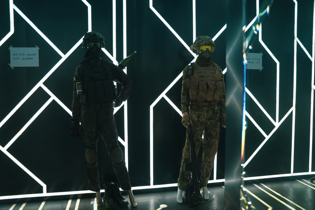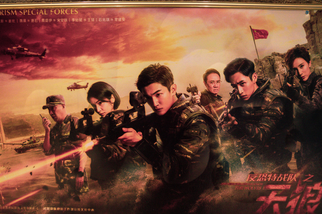 电视剧《反恐特战队之天狼》海报,拍摄点还陈列着当初摄制时所用的服装道具。