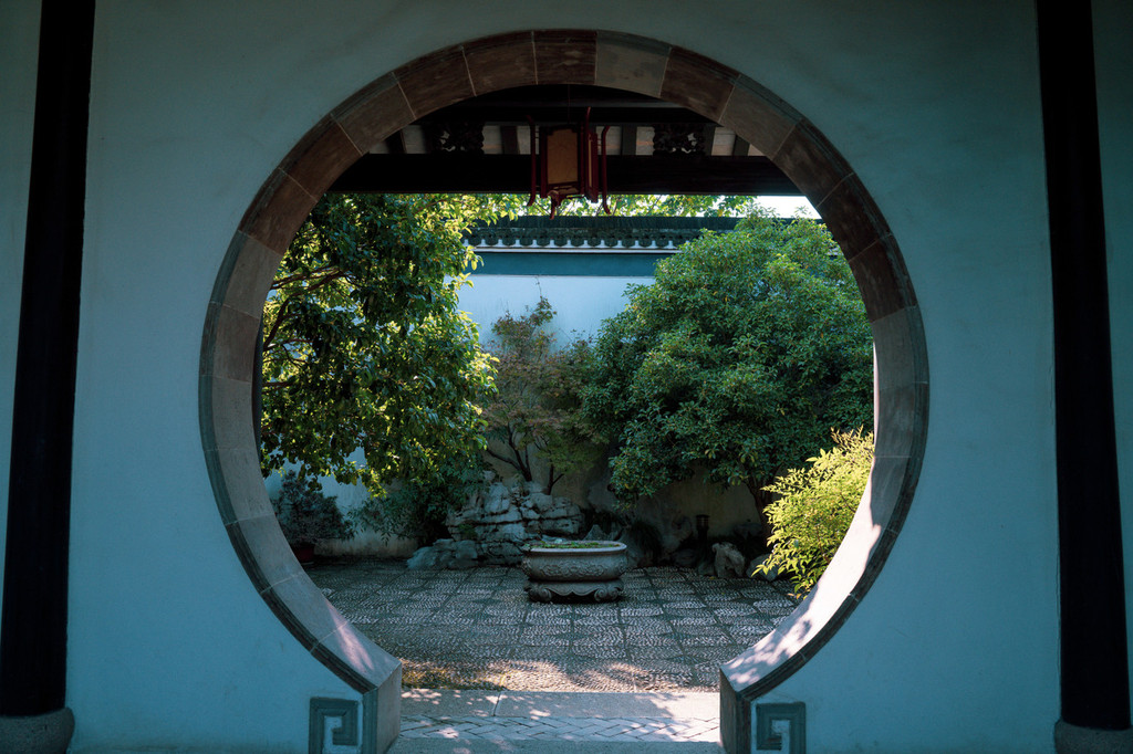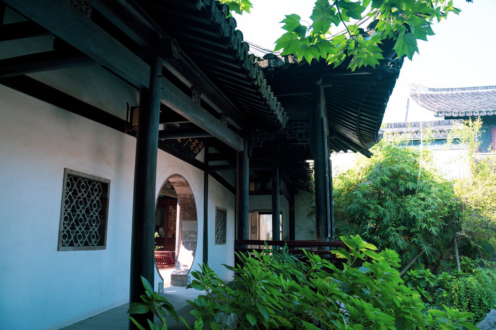 最喜欢的就是这一扇月门,门中漏景宛若一幅小画,白墙映着假山枫叶,幽静秀美,意趣天然。