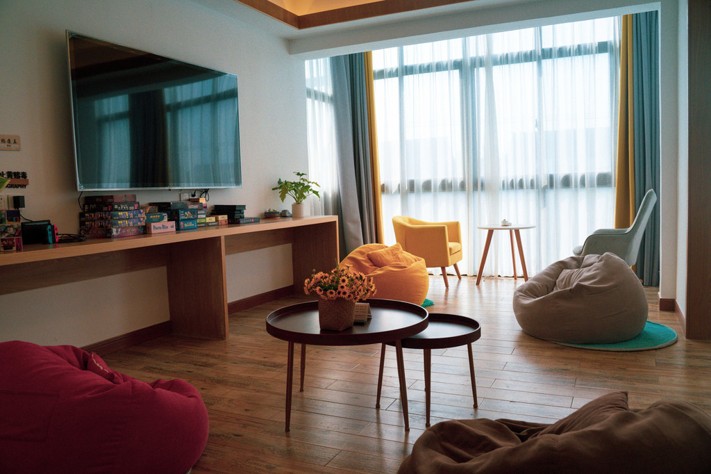 这里还有一家高舍派对民宿。不妨叫上三五好友,租一栋独栋别墅。庭院里微风徐徐,耳边涛声阵阵,打着瞌睡消磨过一个下午。也可以一起泡在ktv里,玩玩桌游打打x-box,夜晚在星空下组织一次烧烤。
