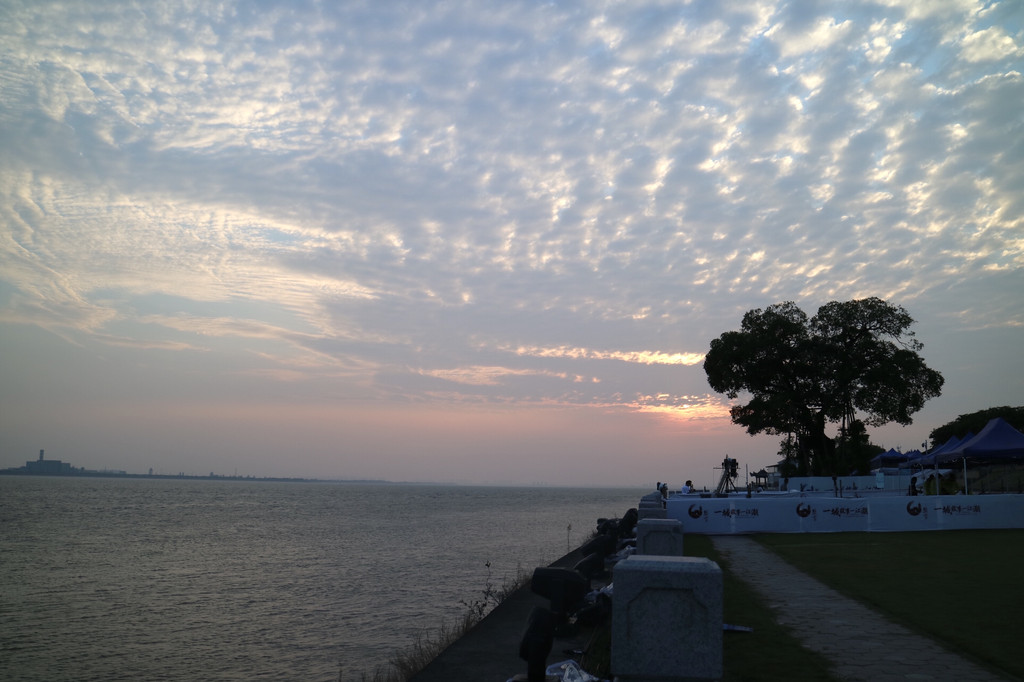 观潮公园曲径通幽,亭台楼阁,杨柳依依,我们无意观赏,放下行李直奔江边。钱塘潮分为碰头潮、一线潮和回头潮,而一线潮是钱塘潮之精华片段,为历代文人所称颂,可谓未见潮影,先闻潮声,气势磅礴。观潮公园即是一线潮的最佳观景地。十点多,坝上已经人山人海,争占最佳位置等候奇观到来,真是“江干上下十余里间,珠翠罗绮溢目,车马塞途”。今天潮水大概是12点40分到达这里,往后大概每天延迟三十分钟。