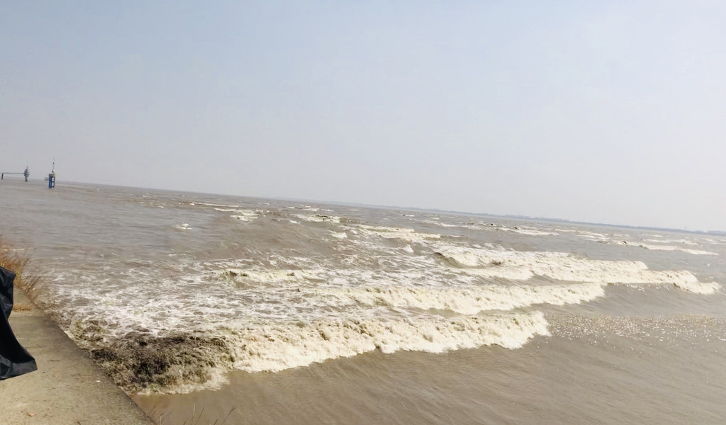 今天东潮和南潮是在堤边交叉汇合,裹着黑乎乎的泥沙往西涌去,江面黑如染缸。