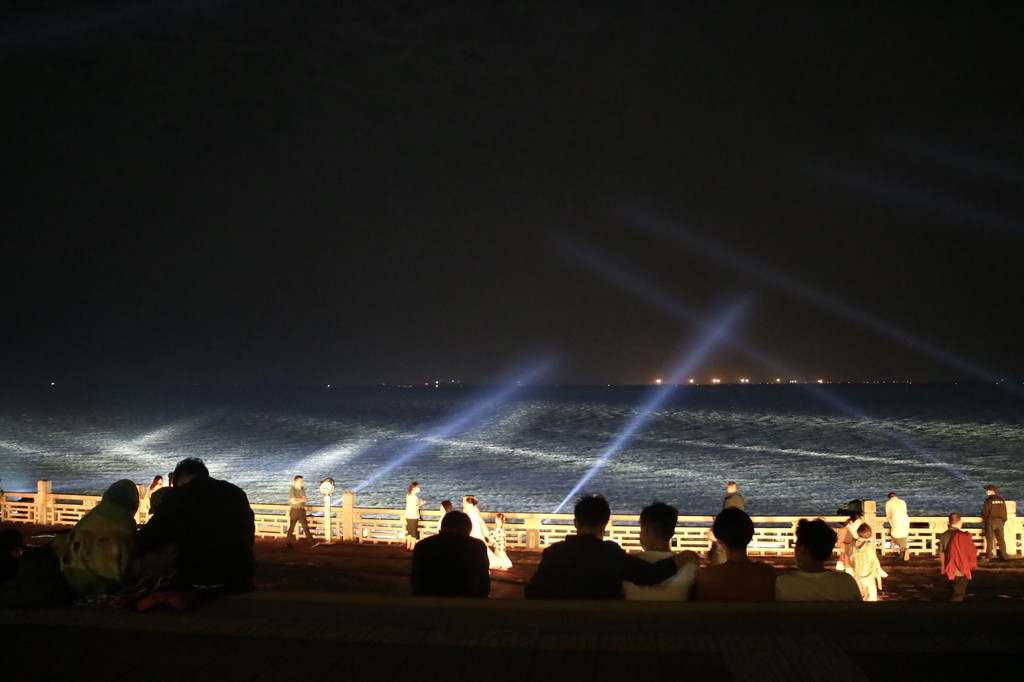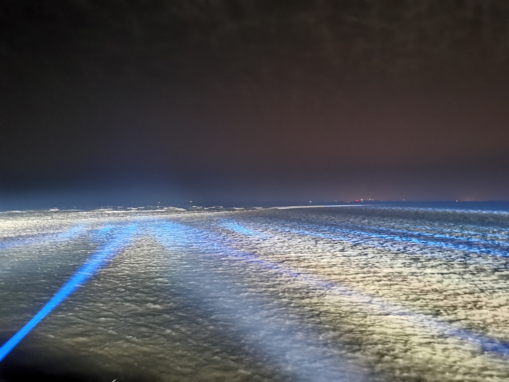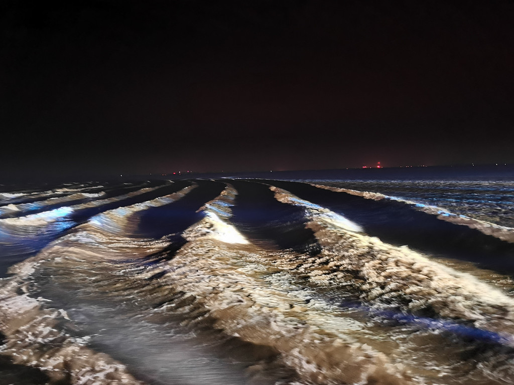 浪脚齐整,线条分明,像群龙舞动,像姑娘摇曳的百褶裙,美到词穷。录下视频都无法传递夜潮的美妙。还是请君亲临其境吧。