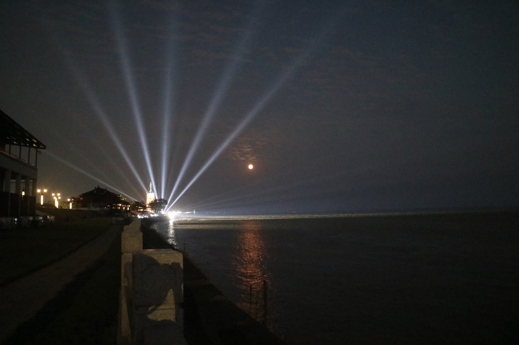 渐渐的人群开始有了躁动的声响,由远及近,23:57分,“潮来啦!”重复着白天的万马奔腾,惊艳到我的是这斑斓的色彩,是日潮无法比及的,在灯光的粉饰下,江面秒变天然的调色盘,深浅浓淡恰到好处。