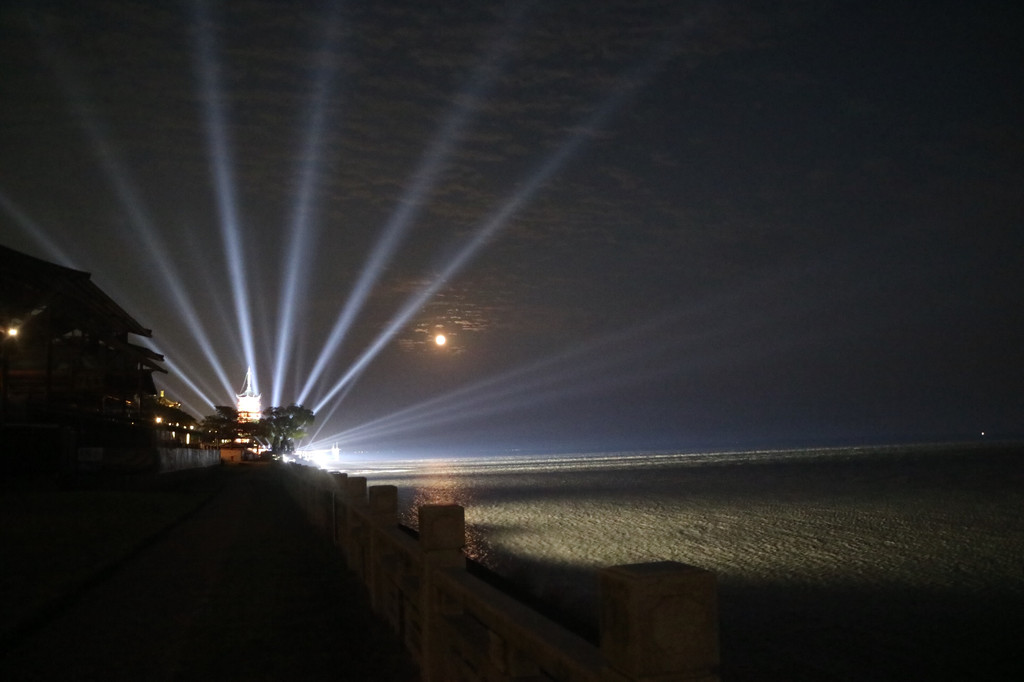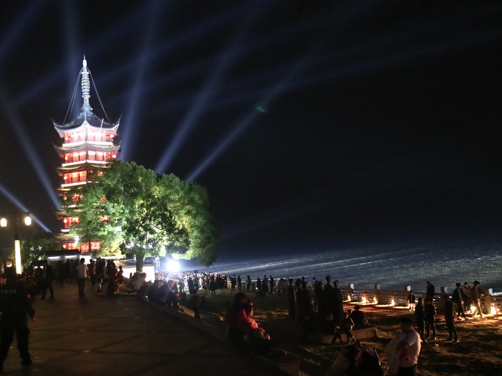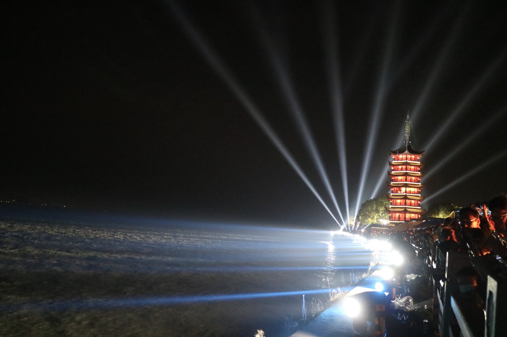在追光灯的照耀下,占鳌塔和江面一改白日的素面朝天,粉墨登场。