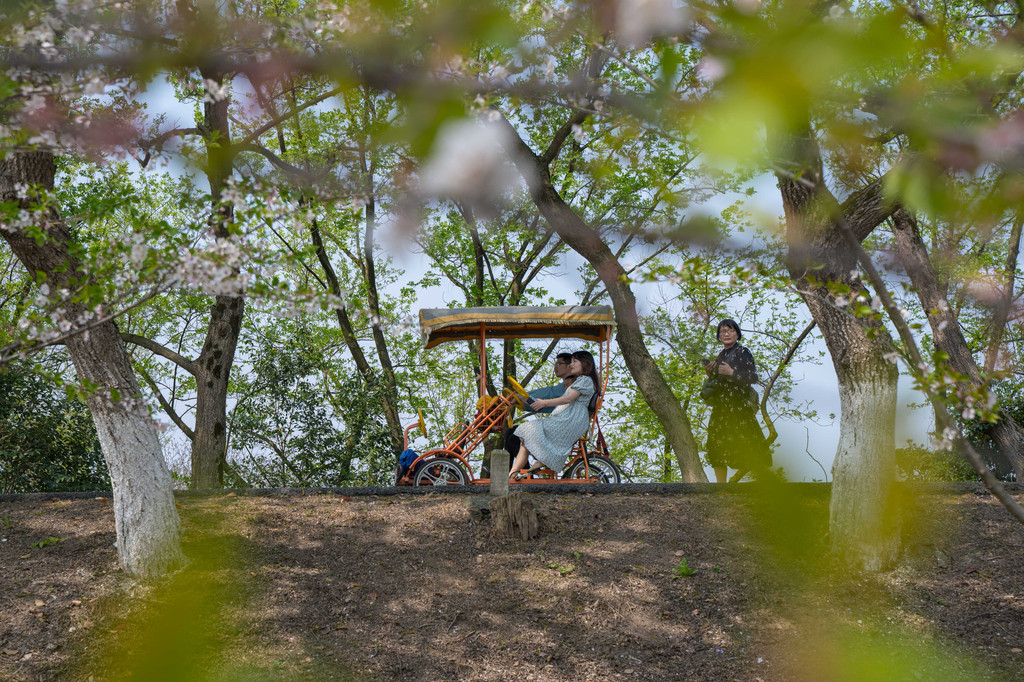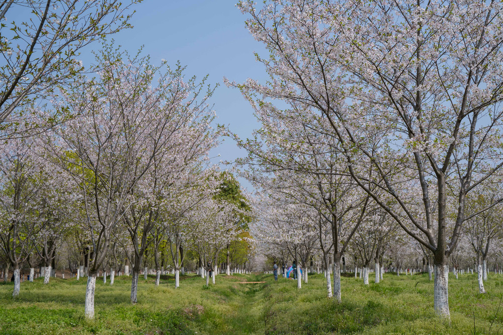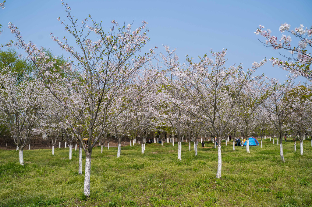 阳春三月,海宁百里钱塘樱花园几千株樱花也如同这天气般开得灿烂。