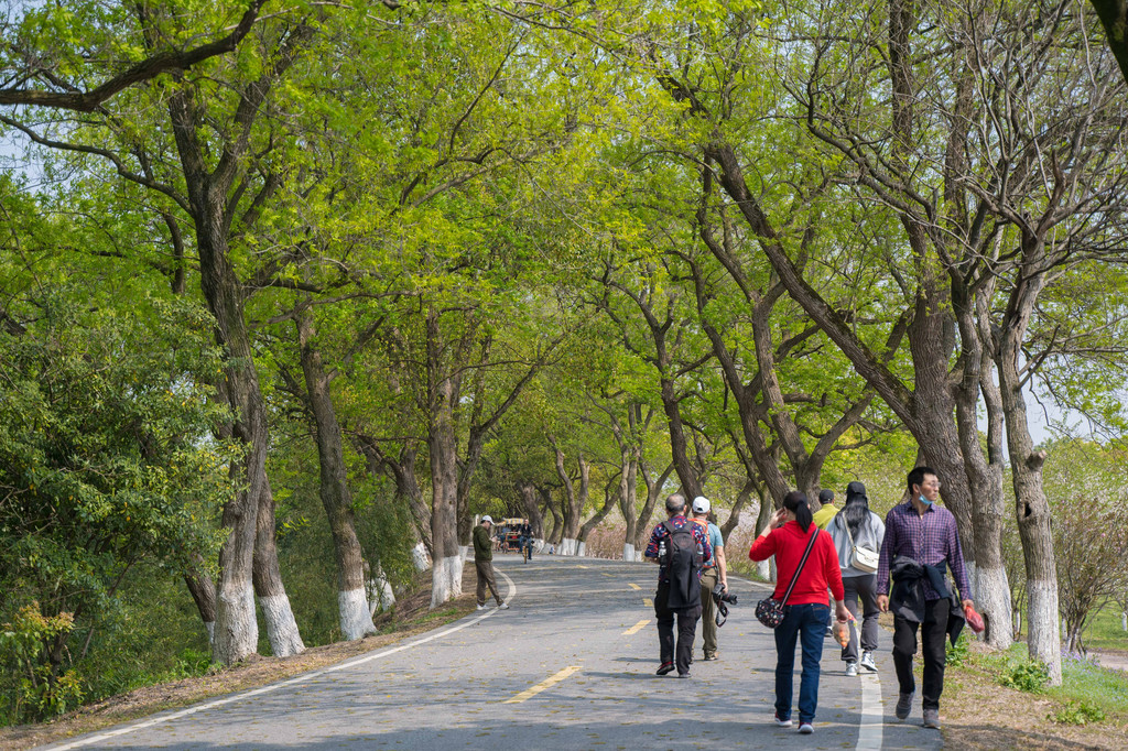 从观潮公园自驾来到百里钱塘一号入口处,这里便是芳草青青房车基地的入口处,从这里可以沿着江边的绿道一直向里前行,房车基地便在百花深处。绿道两旁的苍天大树将整个马路都遮盖起来,阳光也只能撒下些许的光斑,在这里,时间足够的话,漫步前行或是骑上单车,迎着和煦的春风,都是非常不错的交通选择。