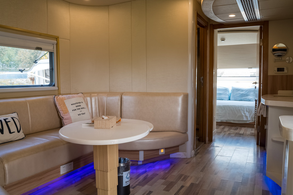 芳草青青房车营地,这里的房车都有不同的区域,不同的区域也会有相对应的名字,而名字都是一些星座,比如双子座、射手座、玉兔座等等。 房车整体线条流畅,黑白极简风。从外观来看颇具未来感。内饰则自带五星属性:大大的双人床,时尚的沙发衣帽柜,干湿分离的宽敞卫浴空间。除了大屏幕液晶电视外,房车还配备无线网络。此外,房车外部还有可移动式露台,可以坐庭院里喝咖啡看风景。
