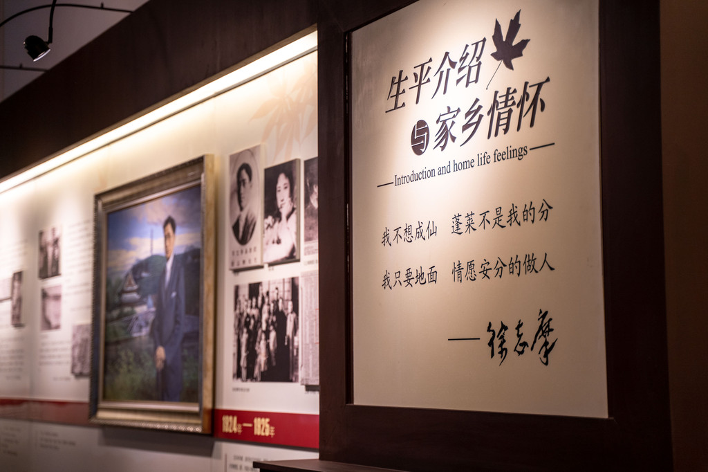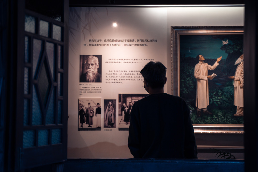 走过天井,进入正厅,我选择先看左边的资料陈列厅。这里的照片、文字展示的是诗人的家人。前半厅主要是介绍诗人的出身、家世,以及与他的情感对象——原配妻子张幼仪、爱慕对象林徽因、后任妻子陆小曼。