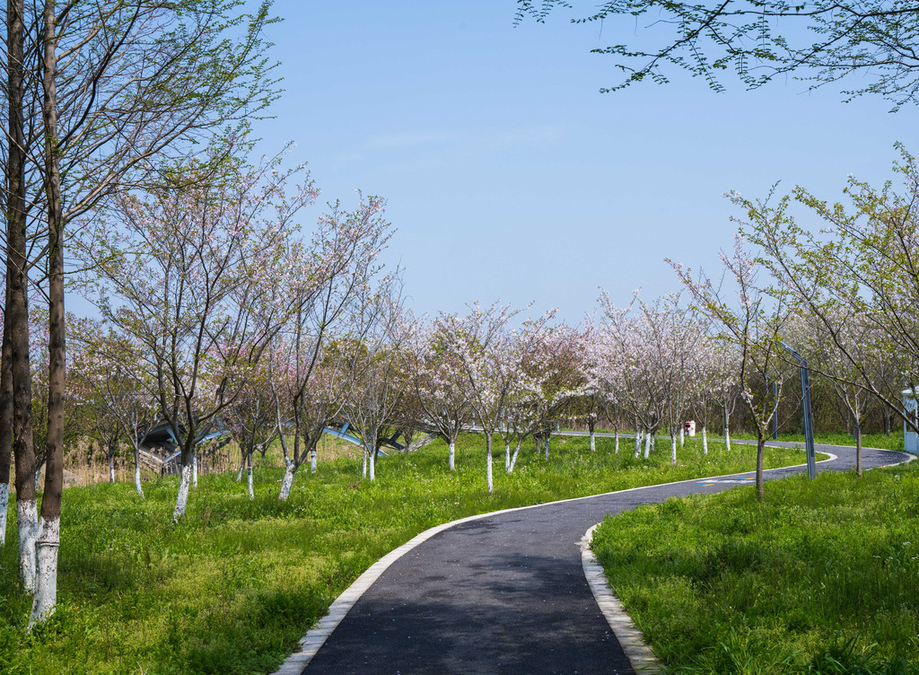 在樱花盛开的季节,一片片粉白、粉红的樱花如水墨画般渲染在绿带间,如梦似幻,此情此景,仿如进入人间仙境。生态绿带内的彩色骑行道穿梭于樱花林内,租上一辆观光自行车与她在这樱花大道上闻香骑行,一定是一件无比幸福的事情。风,轻轻的拂来,花,点点的飘曳。在静肃的樱花丛林中,阵阵若有若无的清香弥散开来,初春变得温润而亲切,空气变得空灵而清新,沁染着樱花的淡泊与宁静,又仿佛让人陶醉在田园幻想曲,悠扬旋律的梦境中。