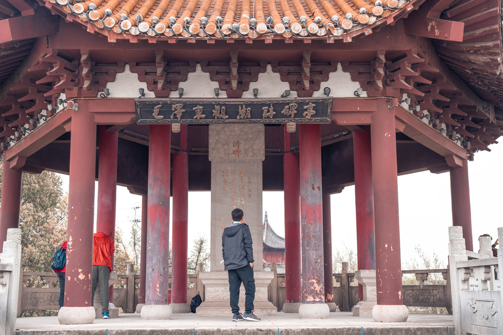 毛泽东观潮诗碑纪念亭,正对着钱塘江而建,诗碑外纪念亭为两层楼高,柱体为朱砂红,橙色的琉璃瓦,久经风雨的纪念亭早已斑驳,不过让人看着却格外的有历史沧桑感。海宁天天可观潮,盐官月月有大潮,每月农历初一至初六,十五至二十均为大潮日,全年有150多个观潮佳日。