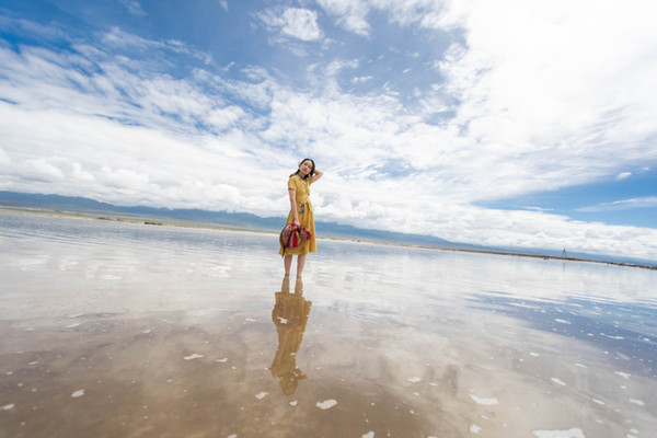 可能由于命好,所以茶卡盐湖天气特别棒,本来计划在茶卡盐湖里面玩2个小时,结果不知不觉就玩了快4个小时,果然景色好的地方总让人流连忘返,作为网红打卡地,自然也少不了各种拍,姑娘们穿上了各种亮色的裙子,在茶卡盐湖里面各种拗造型。