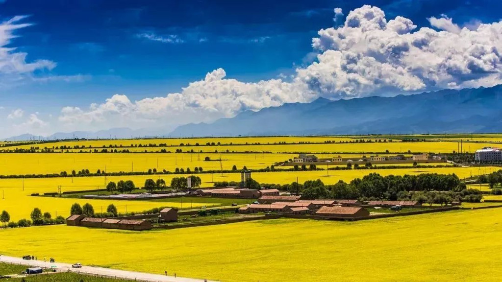 村落人家坐落其中,与那望不到尽头的黄灿灿交相呼应,天上的云块儿分外绵白,色彩清新鲜明如油画,就像被遗落在人间的仙境。