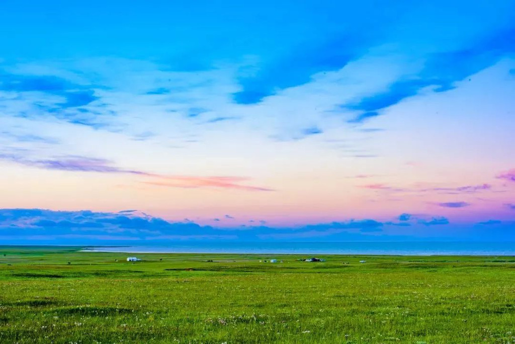 黎明破晓之时,静立在青海湖畔,蓝紫色梦幻的天空飘着灰蓝云朵,天际依稀看得到黄白残月,耳边充斥着风与湖水纠缠发出的白噪音,轻快悦耳。