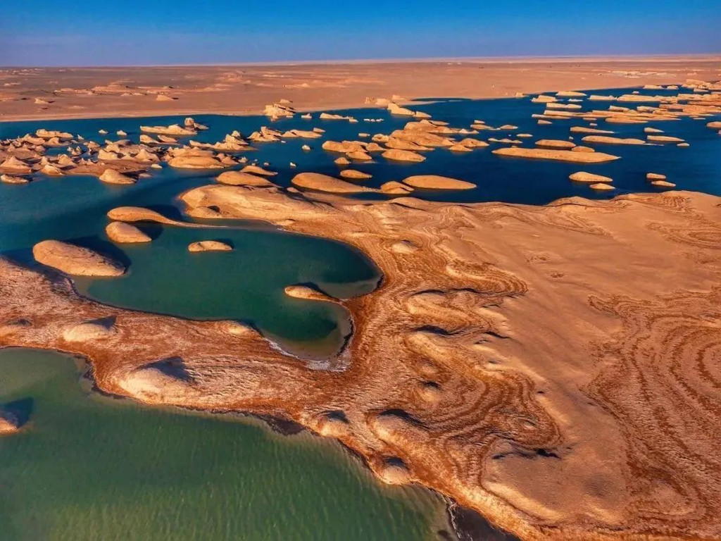奇异的雅丹地貌,坐落于湖泊之上,一座一座山包孤岛,在湖面傲慢的伸展躯体,无所畏惧风的侵蚀。