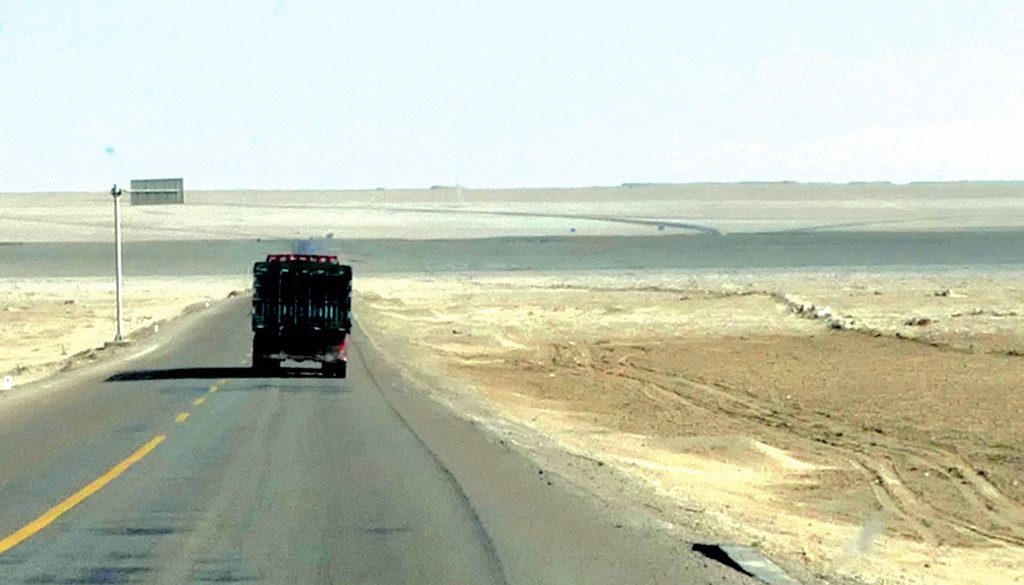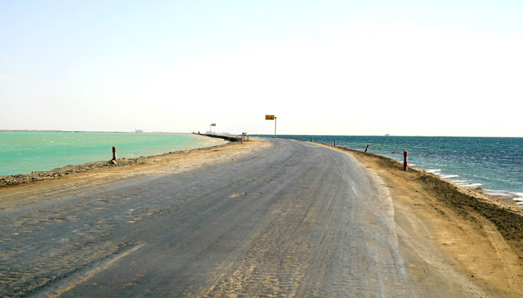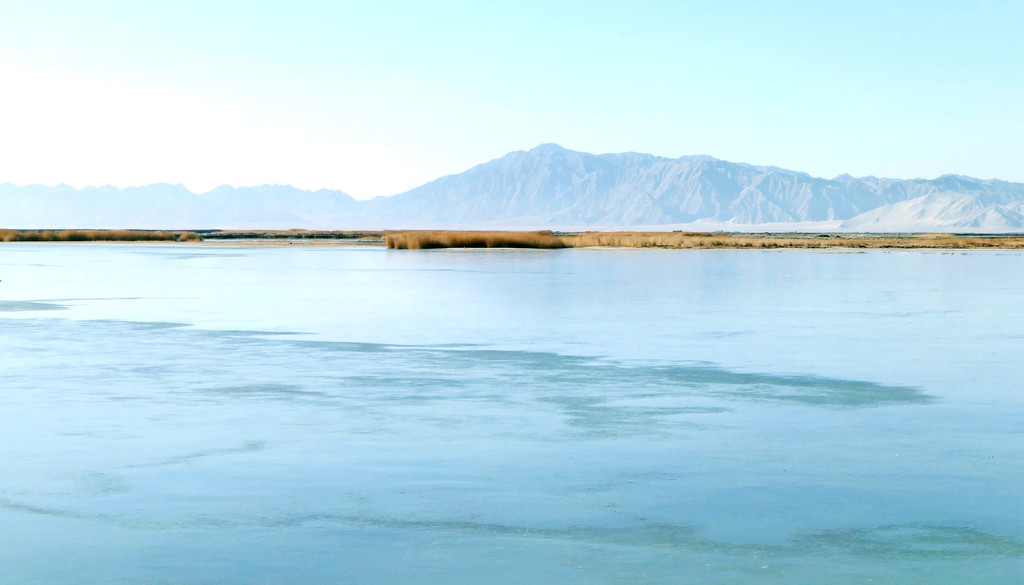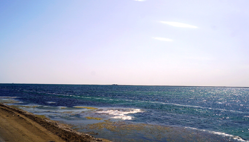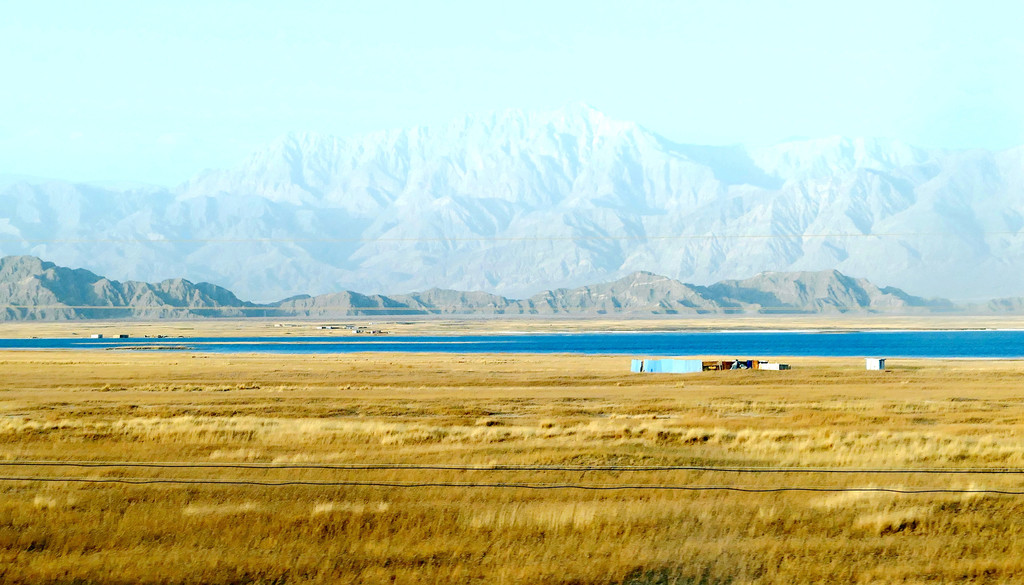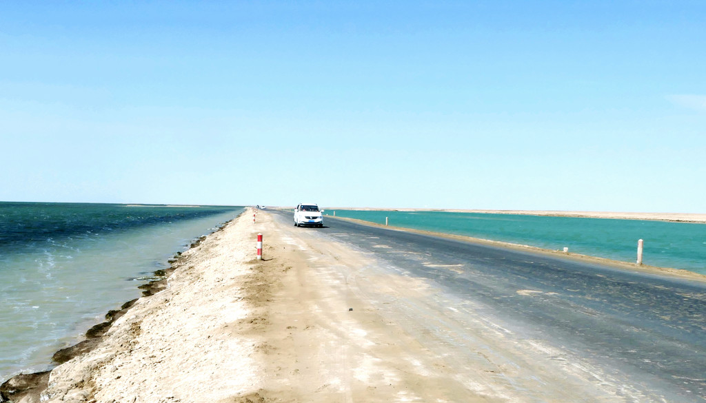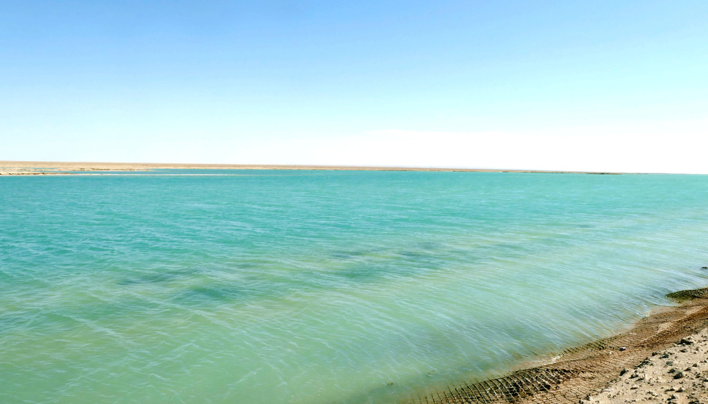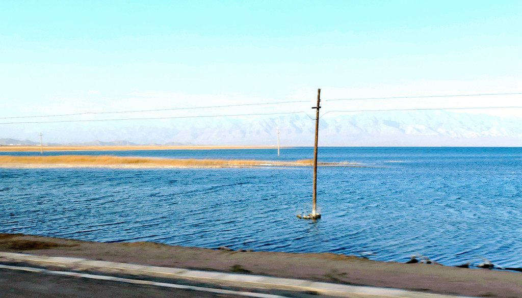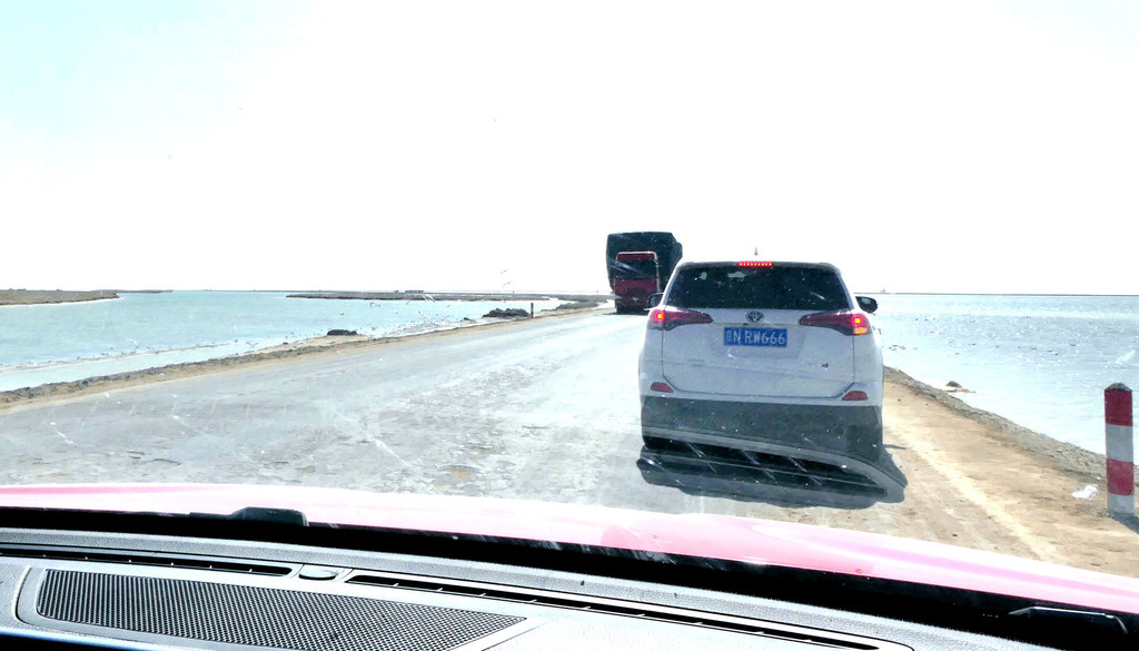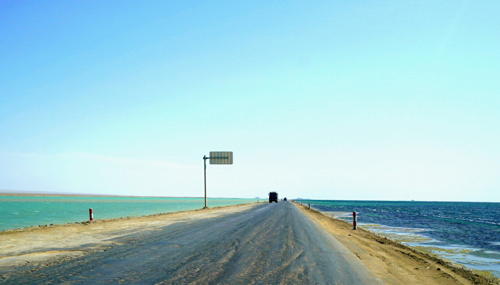 13:03终于看到了湖水,我们此刻已驶抵西台吉乃尔湖之南湖。国道从湖泊北侧的边缘地带穿湖而过,形成一段总长约为7公里的“水上公路”,它将湖面分割成为一大一小的两片水域:南侧是湖泊主体,水域辽阔,一望无际,北侧的湖面相对狭小,呈长条状,对岸景物清晰可见。