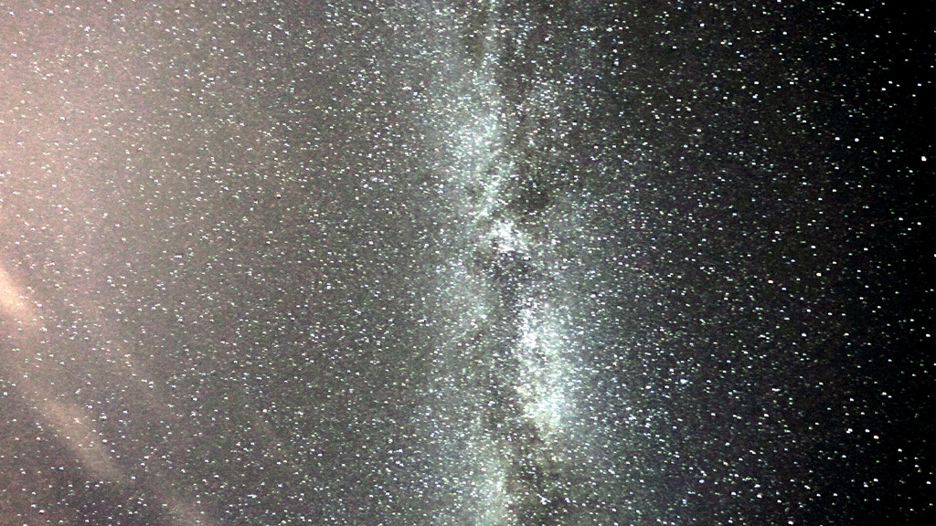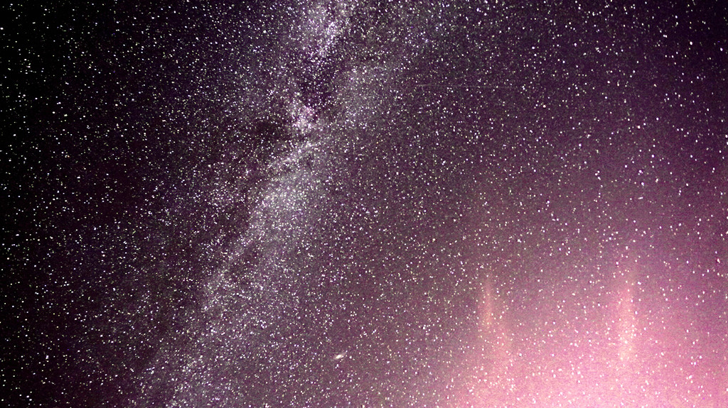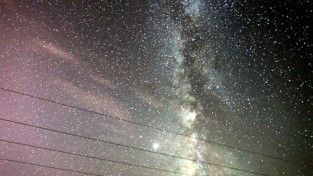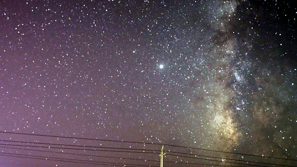 饭后两人驾车出城,沿国道G215(红格线)行驶到除去路边几盏路灯已是再无其它照明之处,然而,出乎意料,就是这几盏孤灯也能让大柴旦的星空变得跟厦门相差无几。失望之余干脆下国道,驱车驶入茫茫荒野,一直开到关闭车灯就几乎伸手不见五指的地方,X.J.试着将头探出车外,突然听他大喊“果然是有星空”。这个地方除去远方柴旦镇上的灯火以及附近1~2公里以外高速公路上偶然经过的车灯,就再也没有任何照明。下车后抬头仰望,满眼的星光灿烂,久违的银河也十分清晰地出现在眼前。赶忙架设起三脚架,使用长焦、长时间曝光拍下了几张照片。然而,荒野的夜晚实在是太冷,我们衣服没穿够,不敢久留,只是呆了大约20分钟就匆匆收队撤离。回到宾馆查看照片,这一趟的夜晚出动还真算是没有白忙,星空拍摄效果不错,照片中的银河也比肉眼所见更加清晰。