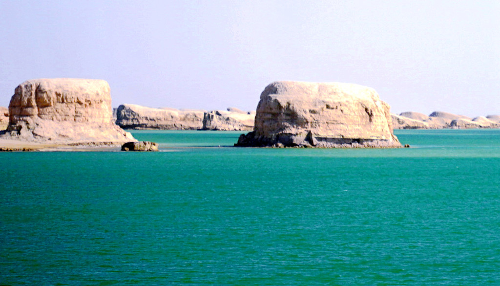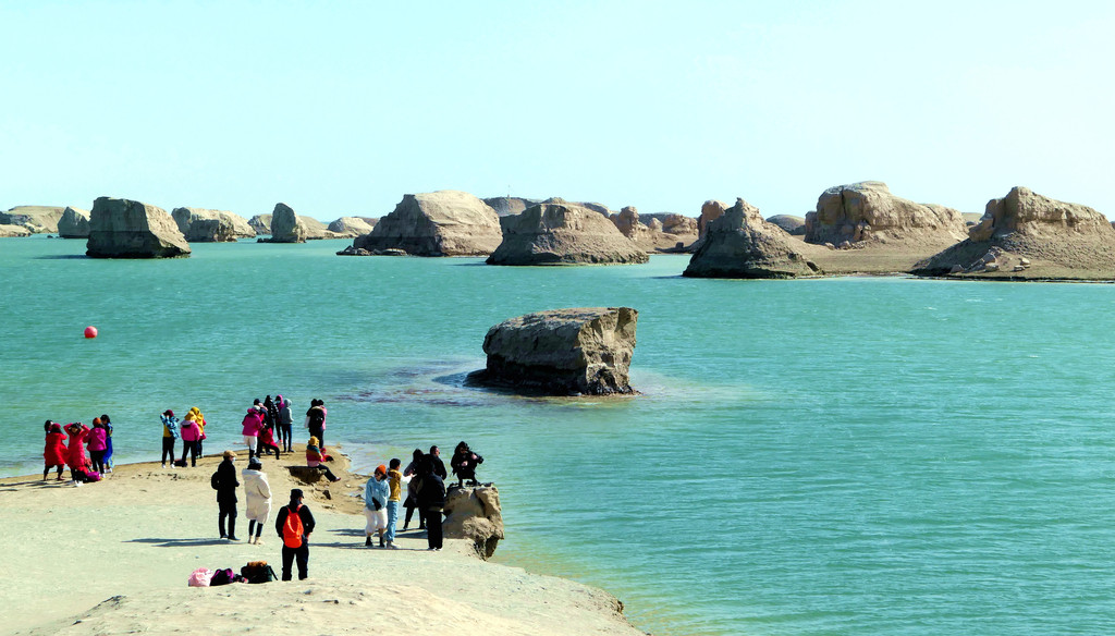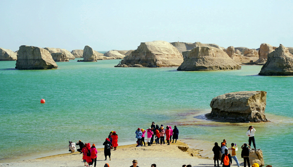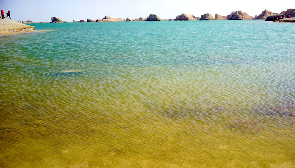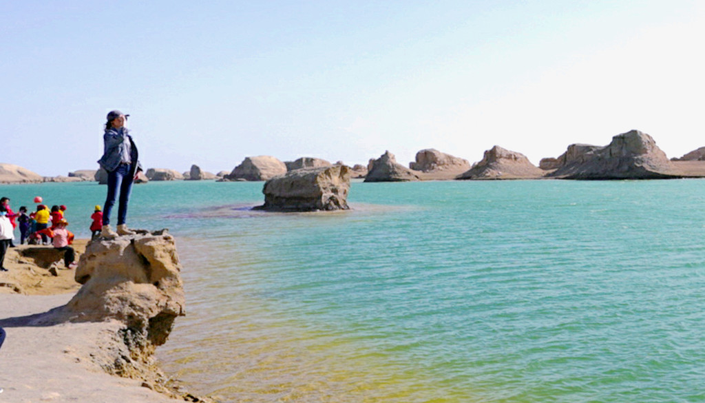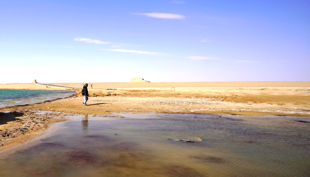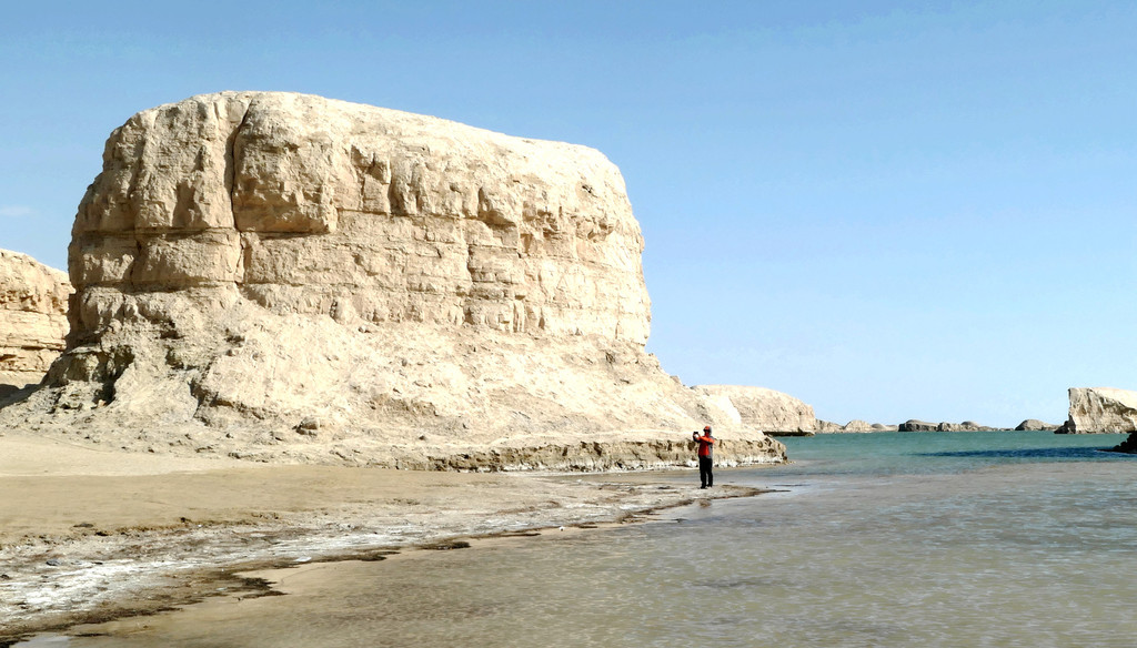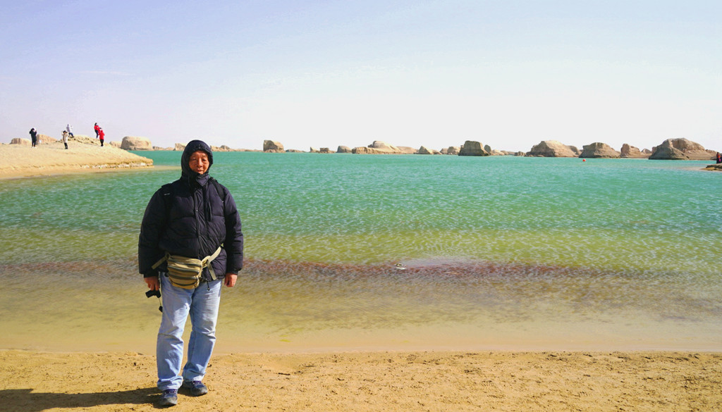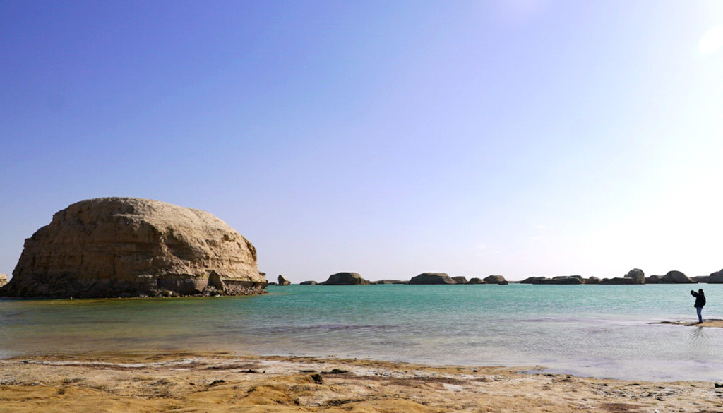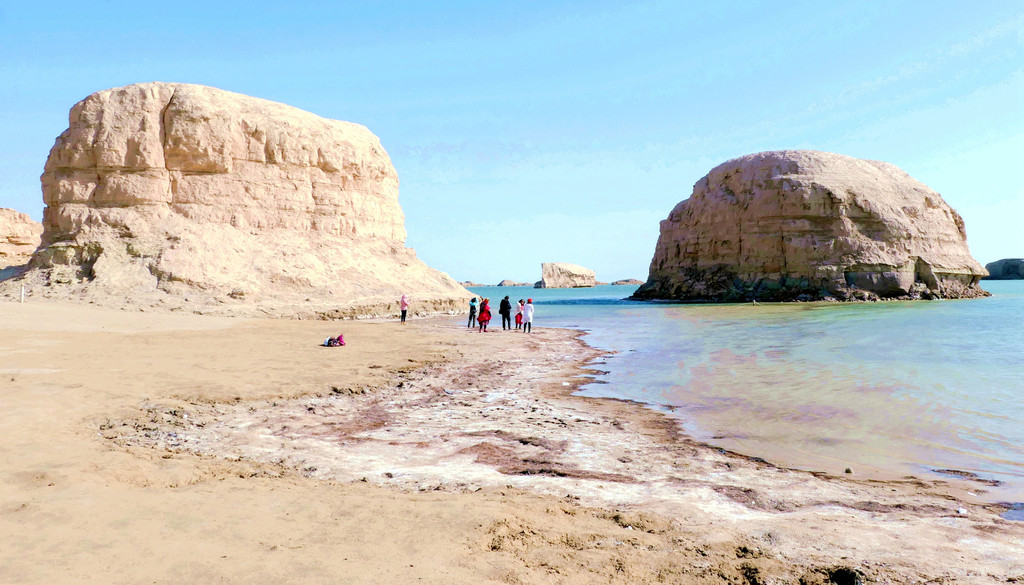 望海台码头相距蓬莱仙岛约2公里,我们一路观景、拍照,总计是走了半小时左右。行走中突然发现,不知是什么原因,视野中的几乎全部雅丹(土丘)都是扎堆浸泡在湖水之中,干旱陆地反倒是一望无际,十分平坦,只是偶尔可见几座挺立的孤峰。游人也是极少选择徒步,广阔天地之间,高大土丘脚下,偶尔才能看见少数几个人影出没,面对苍茫天地,人影显得十分渺小。