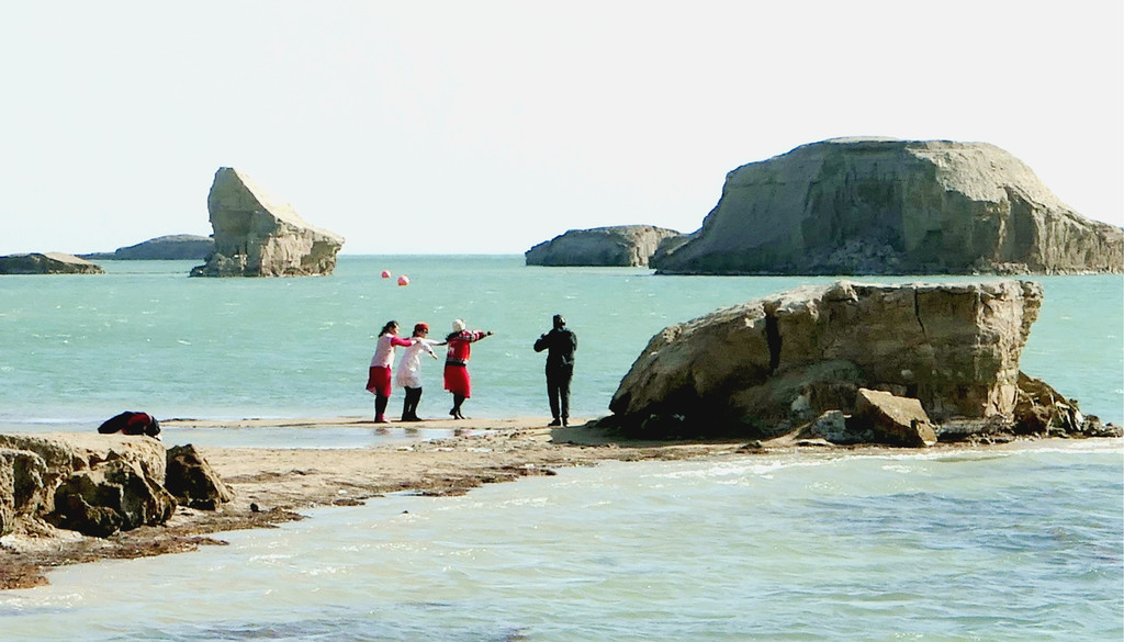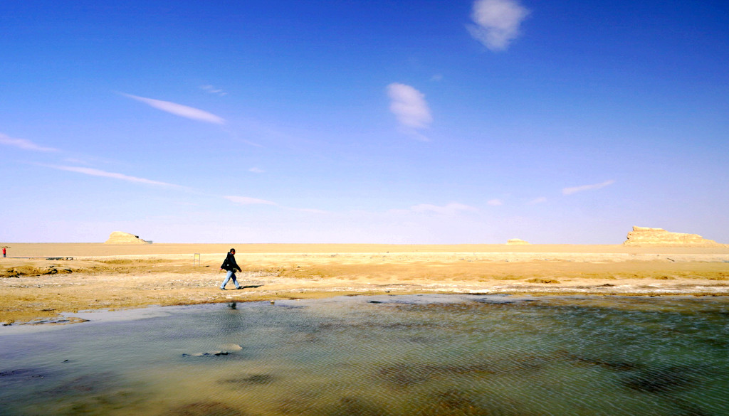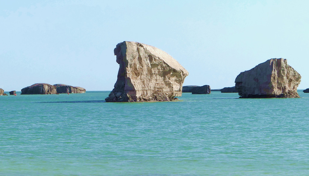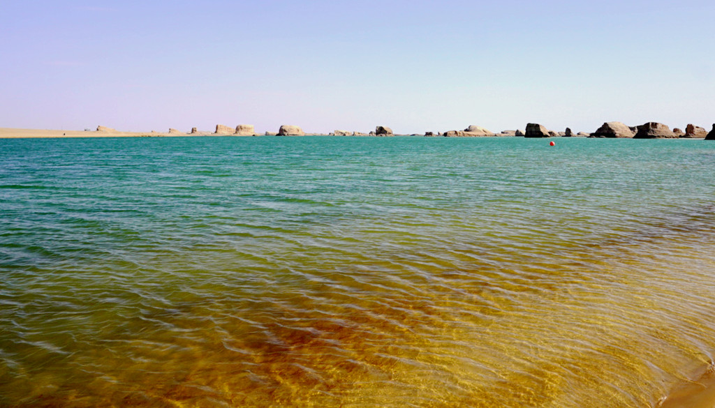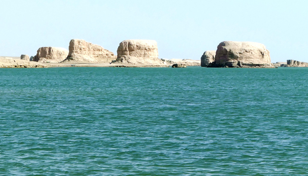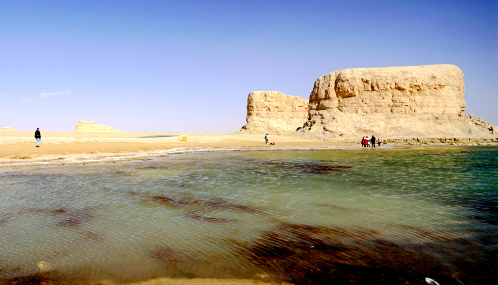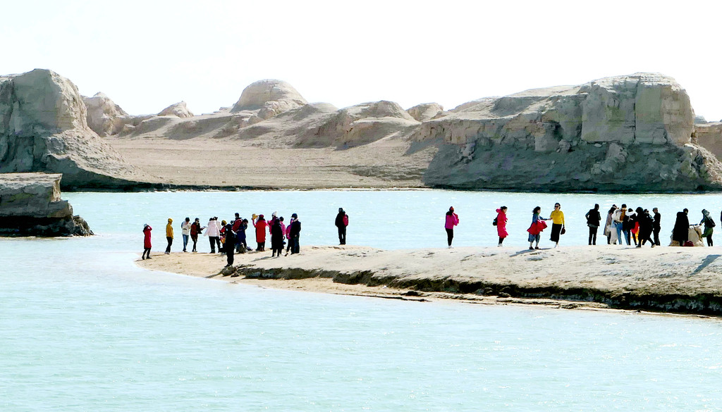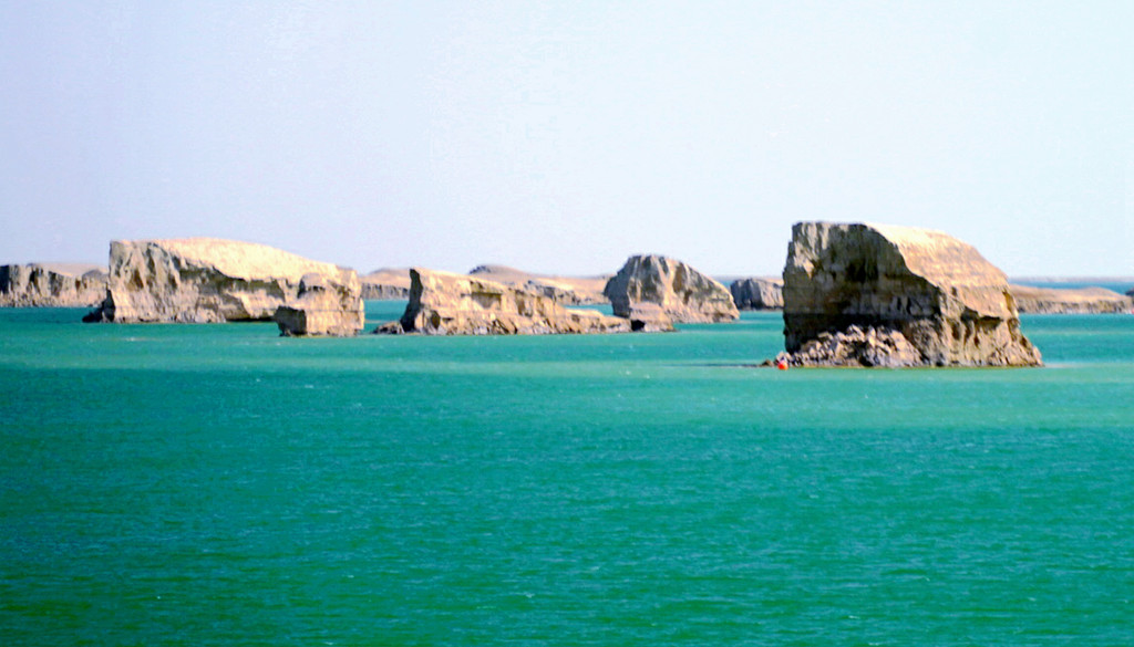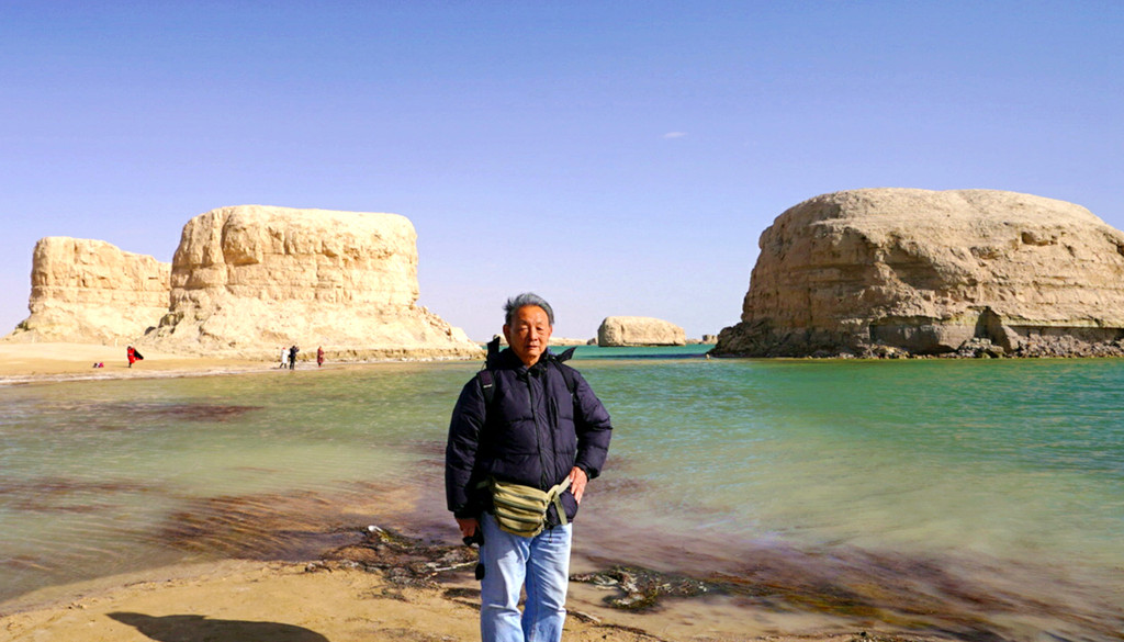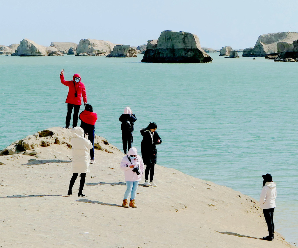 望海台码头相距蓬莱仙岛约2公里,我们一路观景、拍照,总计是走了半小时左右。行走中突然发现,不知是什么原因,视野中的几乎全部雅丹(土丘)都是扎堆浸泡在湖水之中,干旱陆地反倒是一望无际,十分平坦,只是偶尔可见几座挺立的孤峰。游人也是极少选择徒步,广阔天地之间,高大土丘脚下,偶尔才能看见少数几个人影出没,面对苍茫天地,人影显得十分渺小。