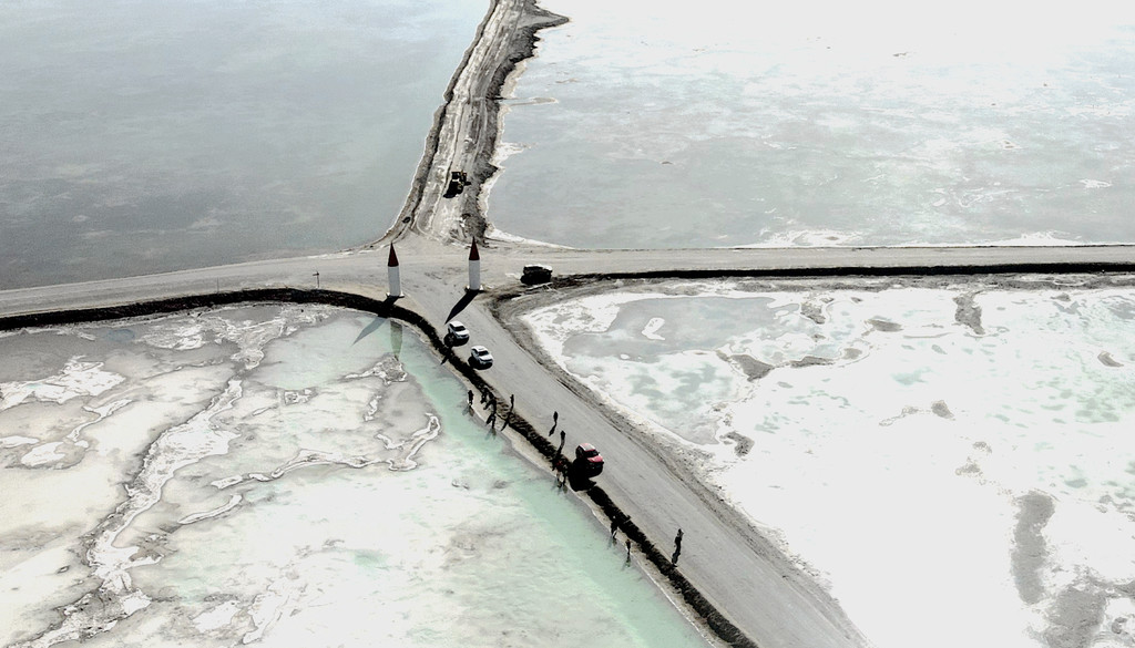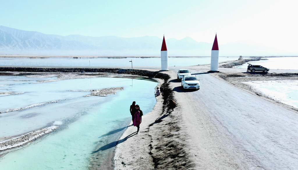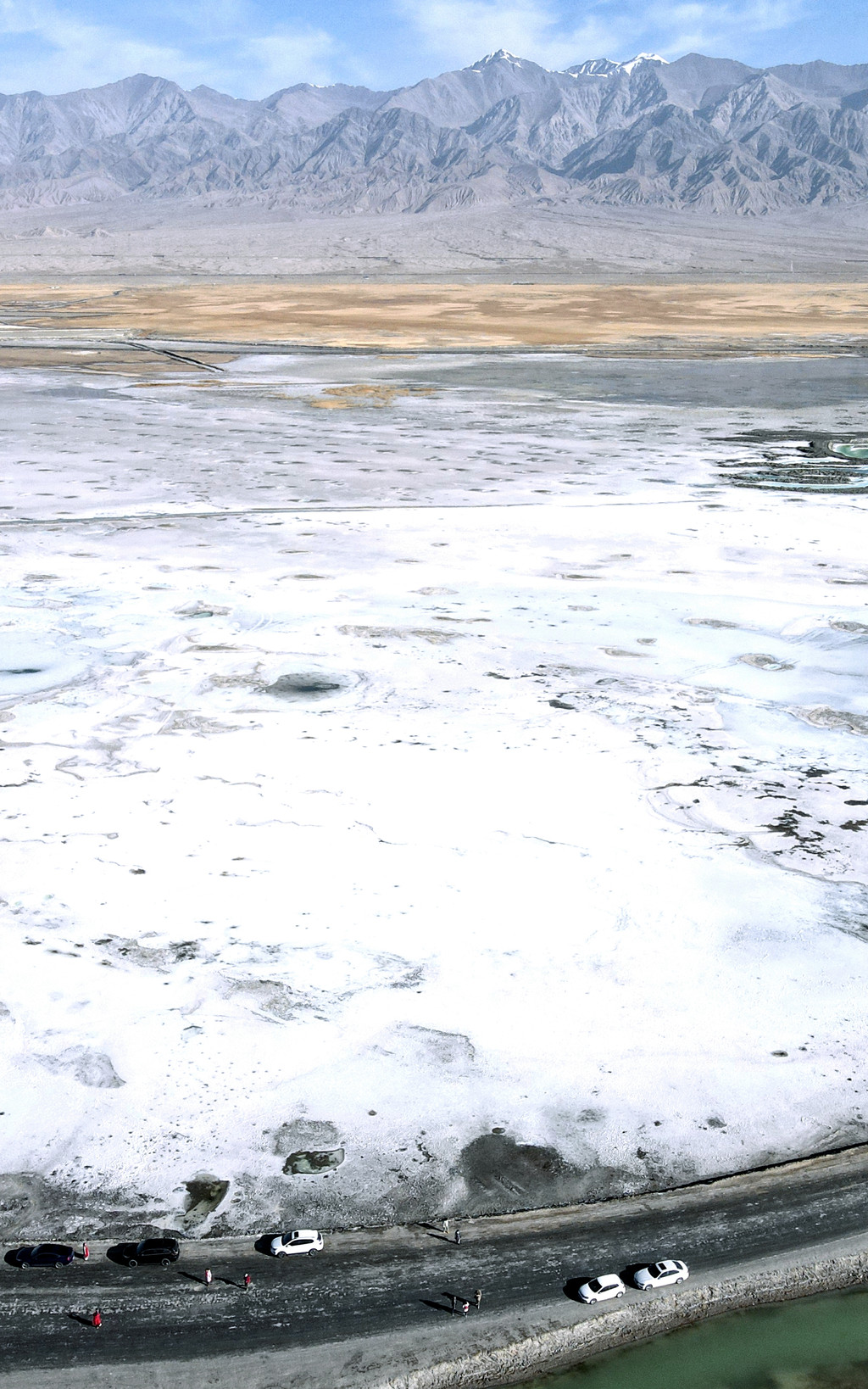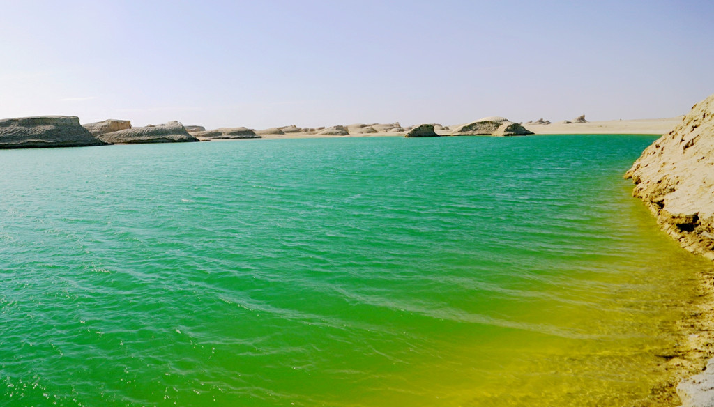 继续前行,10:39抵达真正的翡翠湖区入口,两根火箭状的立柱就是入口的标志,它提醒我们,这一路的曲径迂回,至此已算是渐入佳境。路边湖水的含盐浓度显然也是“再上一个台阶”,不仅是湖面上已经不见芦苇生长,湖底也已堆满了洁白的盐晶。众多盐丘聚集出水,又在湖面上形成一道道的盐埂,不同区块的湖水也呈现出不同色调的绿色。