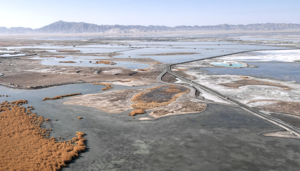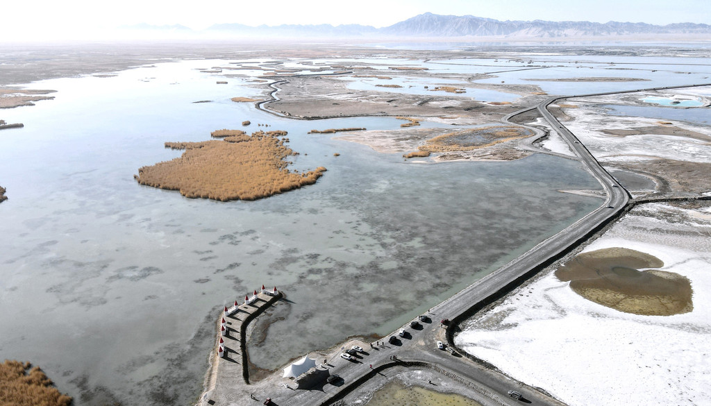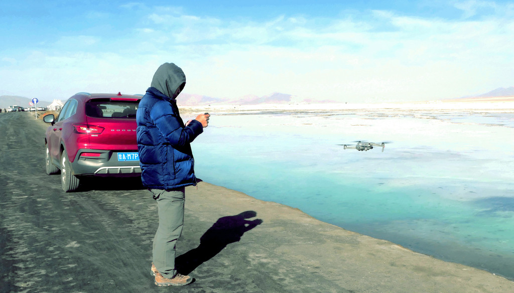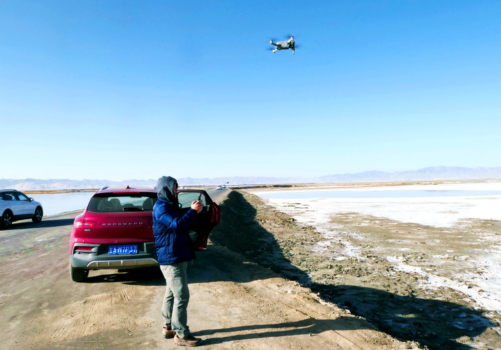 X.J.在此处放飞无人机,高空图像清晰地展现我们此刻所站立的T形路口,也清晰地表明,被T形路分割开的三片水面确实风光迥异。不过,从高空看到的大柴旦湖主体水面却是跟我们在地面所见差异颇大,高空鸟瞰的画面表明,这片湖水其实并非“天水苍茫”,而是被道路与芦苇群落分隔成为数块不同的湖区。芦苇群落也并非是长条状,而是成团、成片,占据了这一带湖区的相当部分面积。