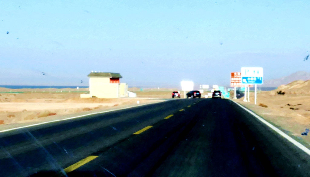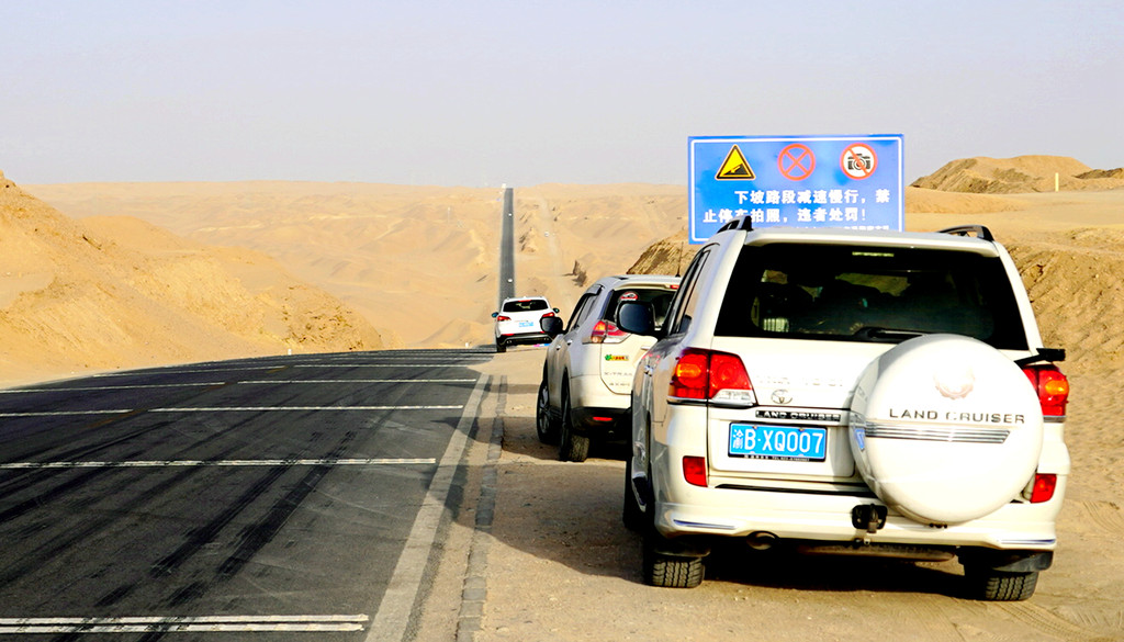 这一路段上总共是有两处“U型天路”,17:51又通过第二处“天路”,它的跨度比前一处小,凹陷也较浅,然而,“登天”的感觉依旧十分明显。交警也在谷底设置了安全警示,“禁止停车,严禁在路面拍照”,我们也是循规蹈矩,缓行通过,没有停车。