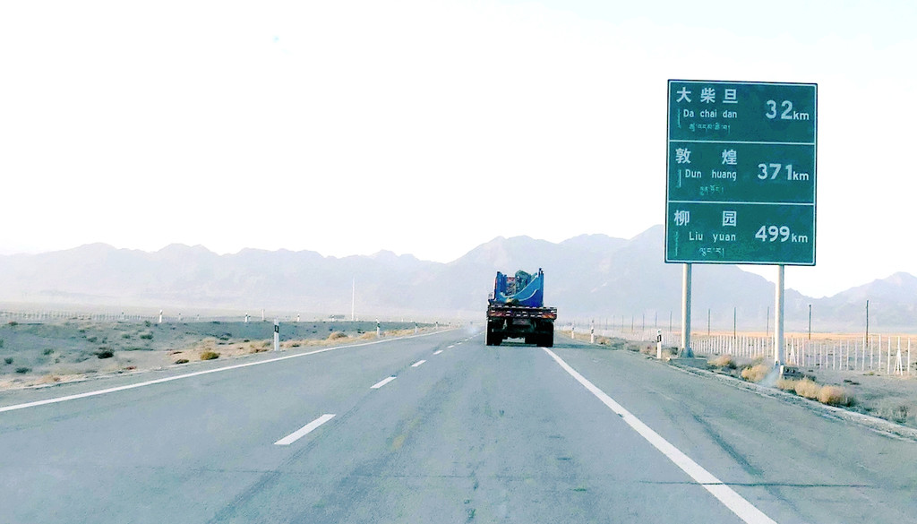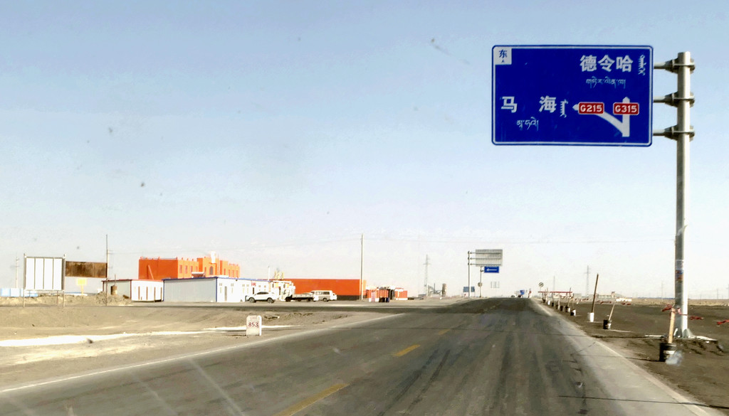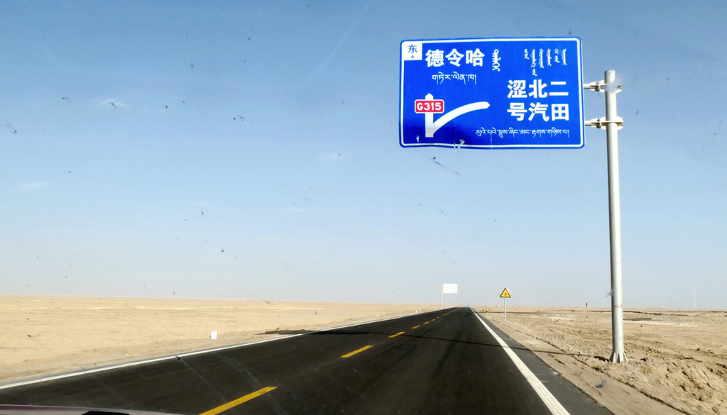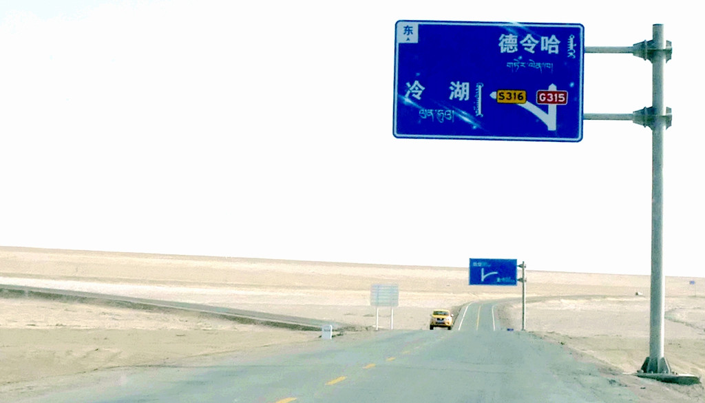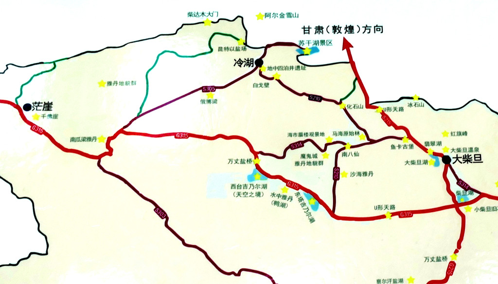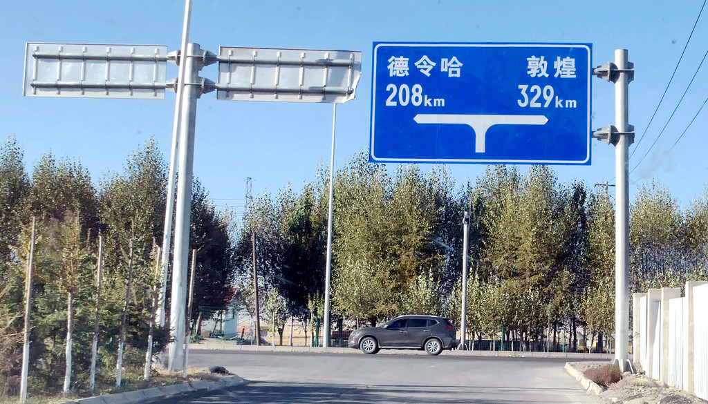 出城后上国道G315(西莎线),按照两天前从敦煌过来时所走的道路逆行,10:42驶经三岔路口,从这里右拐是省道S303,通向格尔木(360公里),我们沿国道G315继续直行,驶向黄瓜梁。