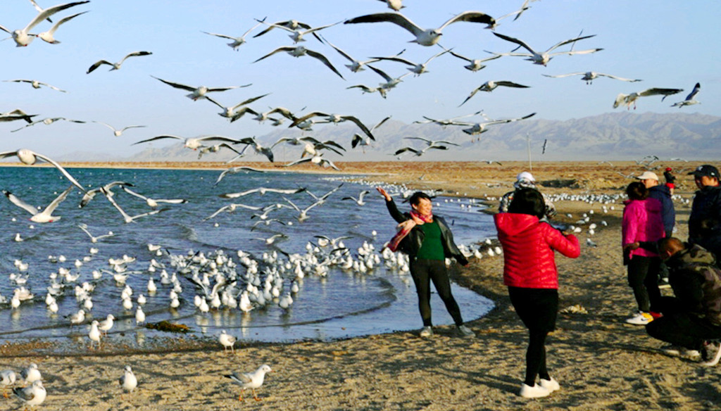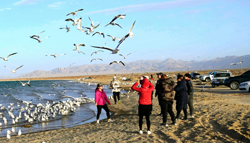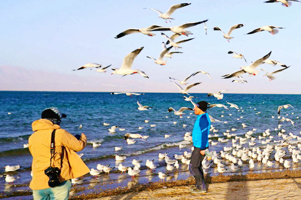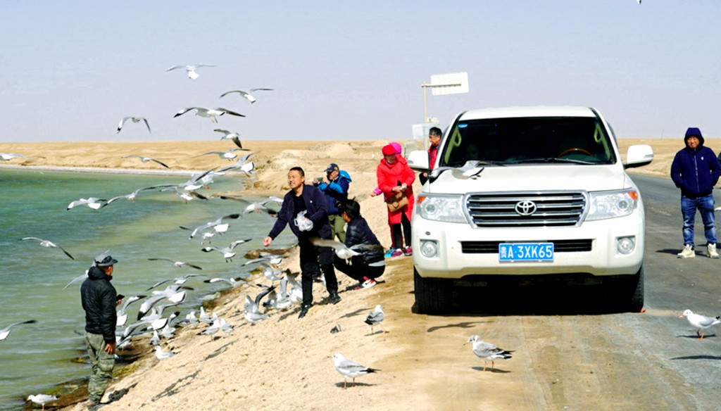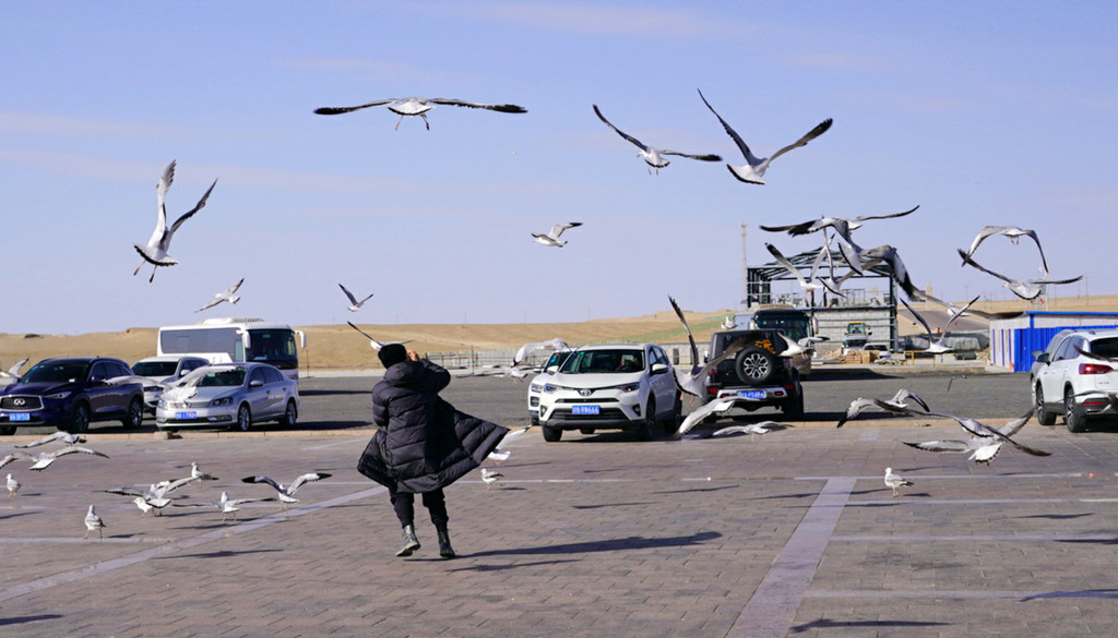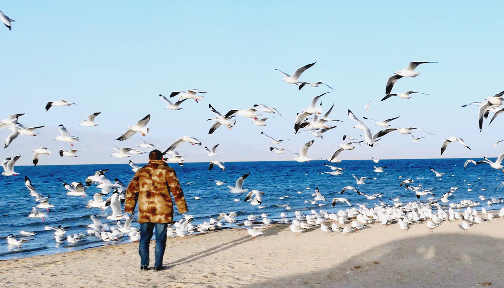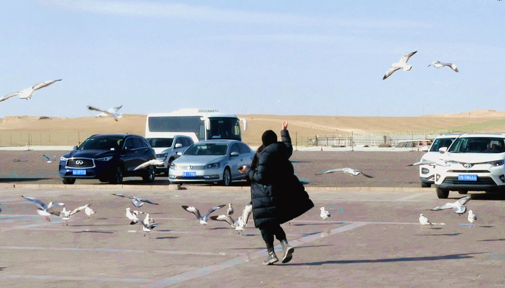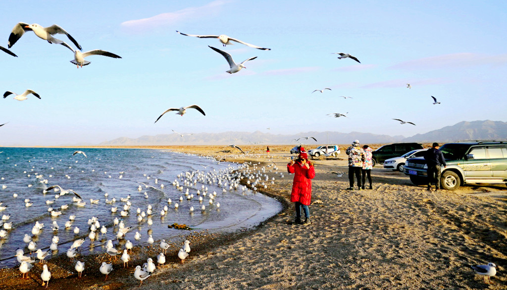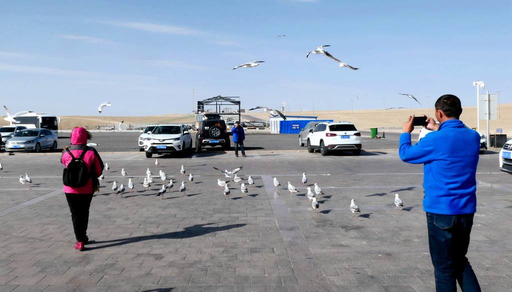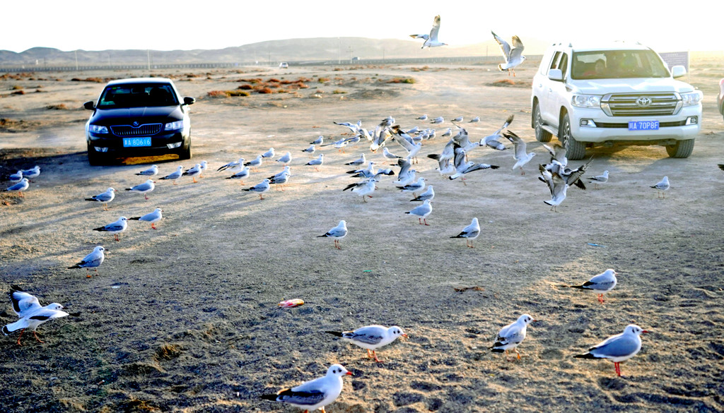 驱车抵近湖畔,看到路边停靠着一长溜的汽车,这里有一大群不怕人的海鸥,正在争抢路人投喂的食物。我们早上多买了两份肉夹馍,此刻也正好派上用场,立马下车参与其中,将自己的午餐大部分都喂了海鸥。