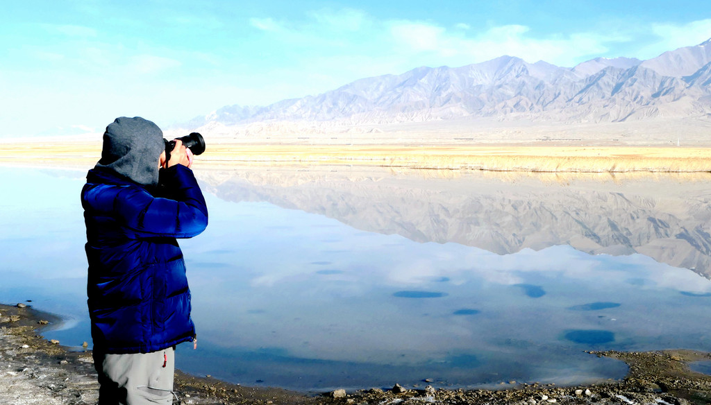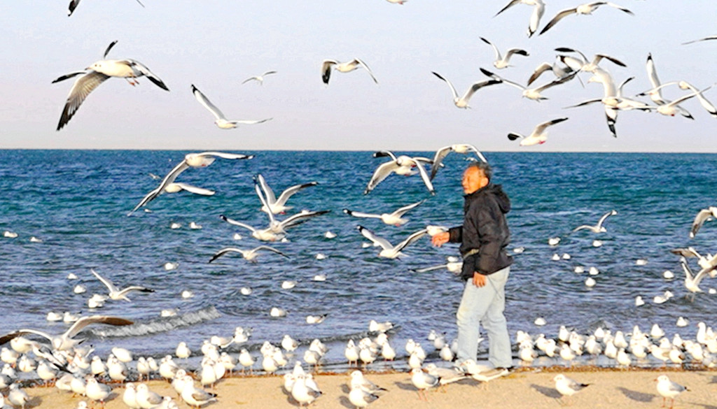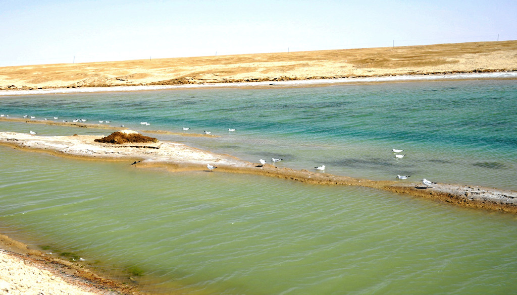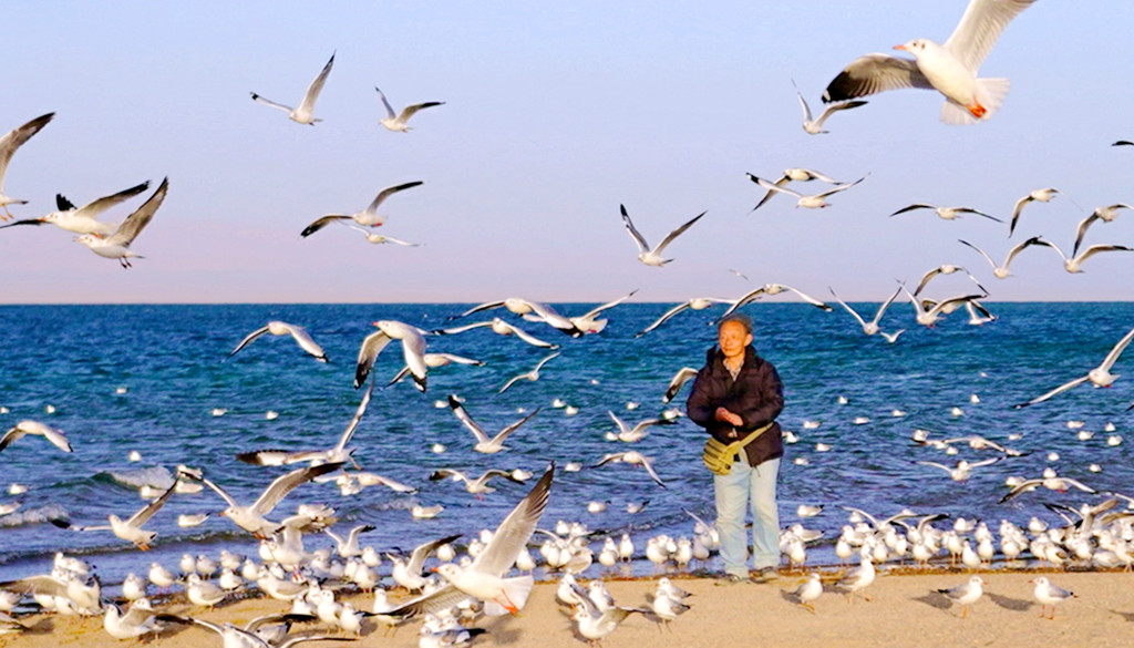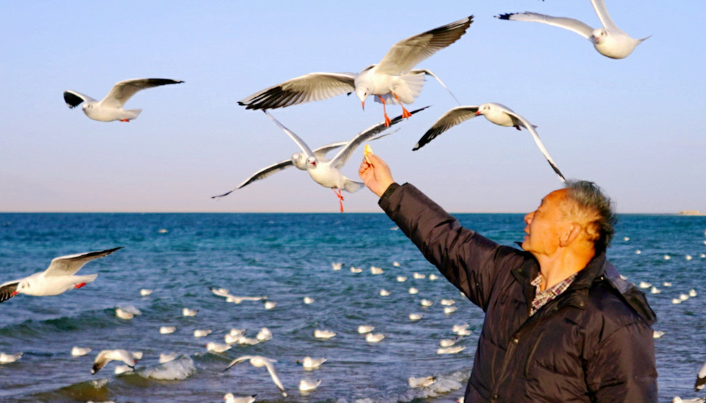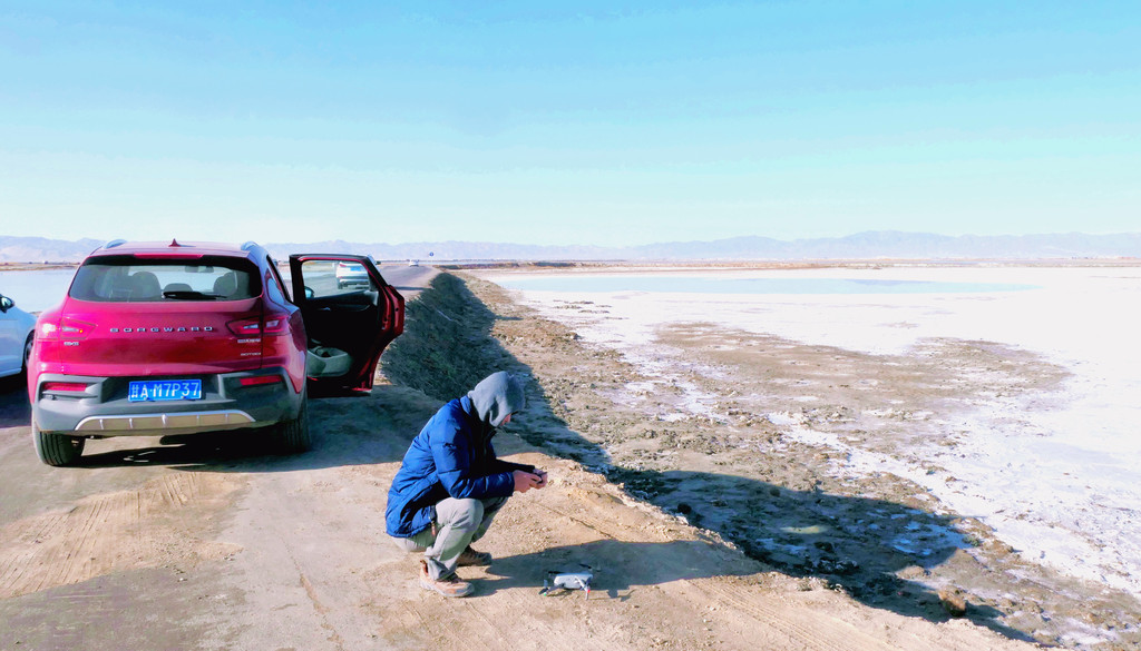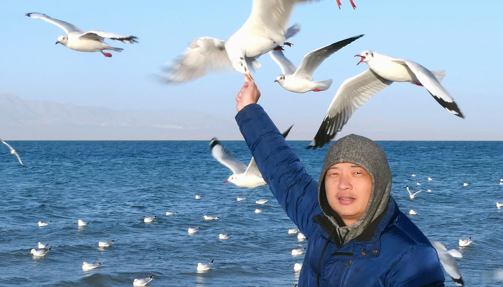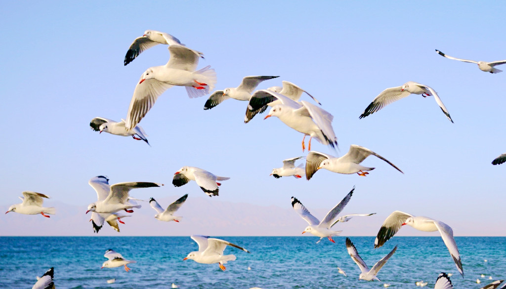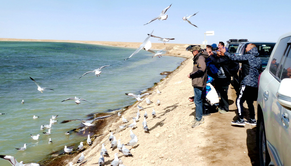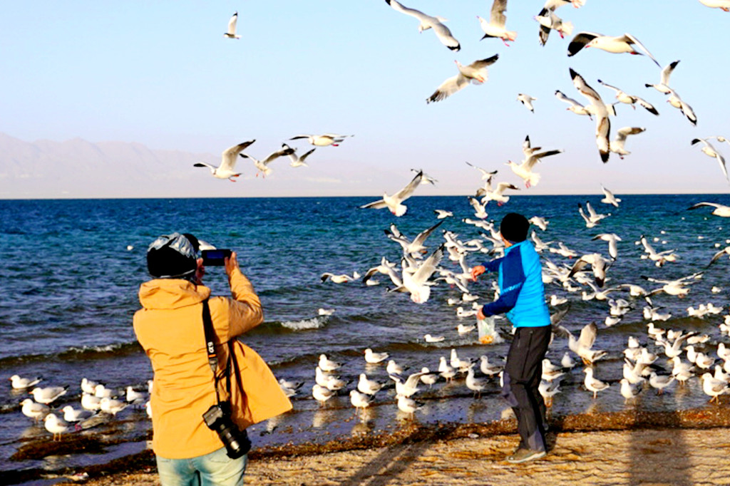 驱车抵近湖畔,看到路边停靠着一长溜的汽车,这里有一大群不怕人的海鸥,正在争抢路人投喂的食物。我们早上多买了两份肉夹馍,此刻也正好派上用场,立马下车参与其中,将自己的午餐大部分都喂了海鸥。