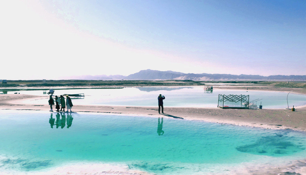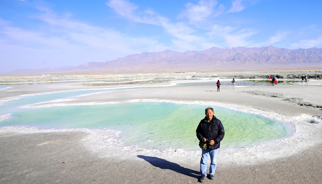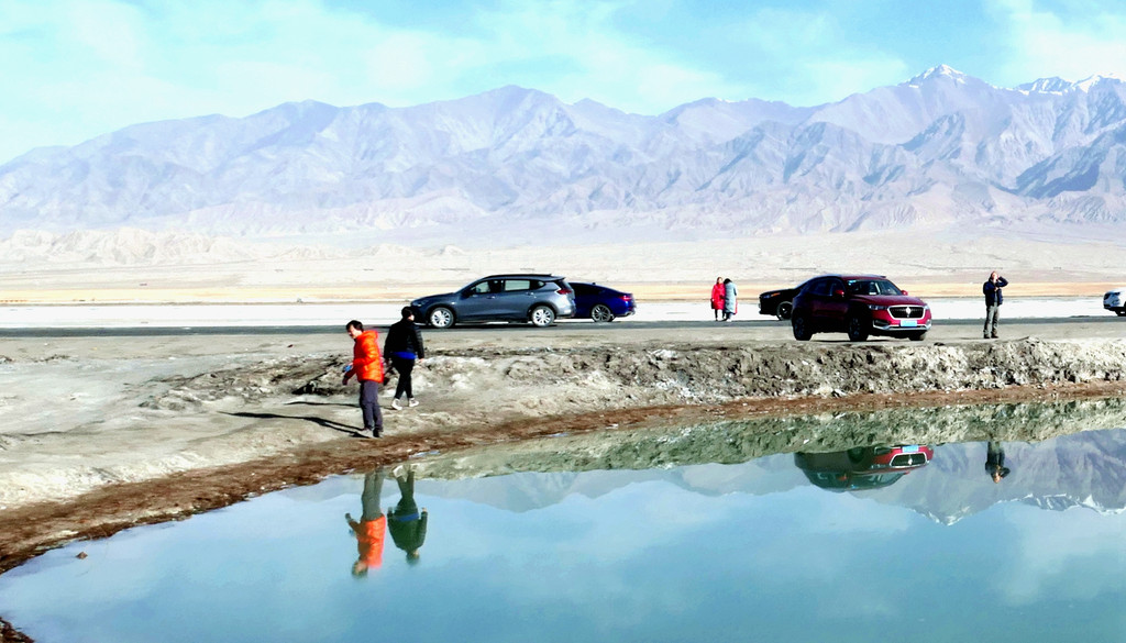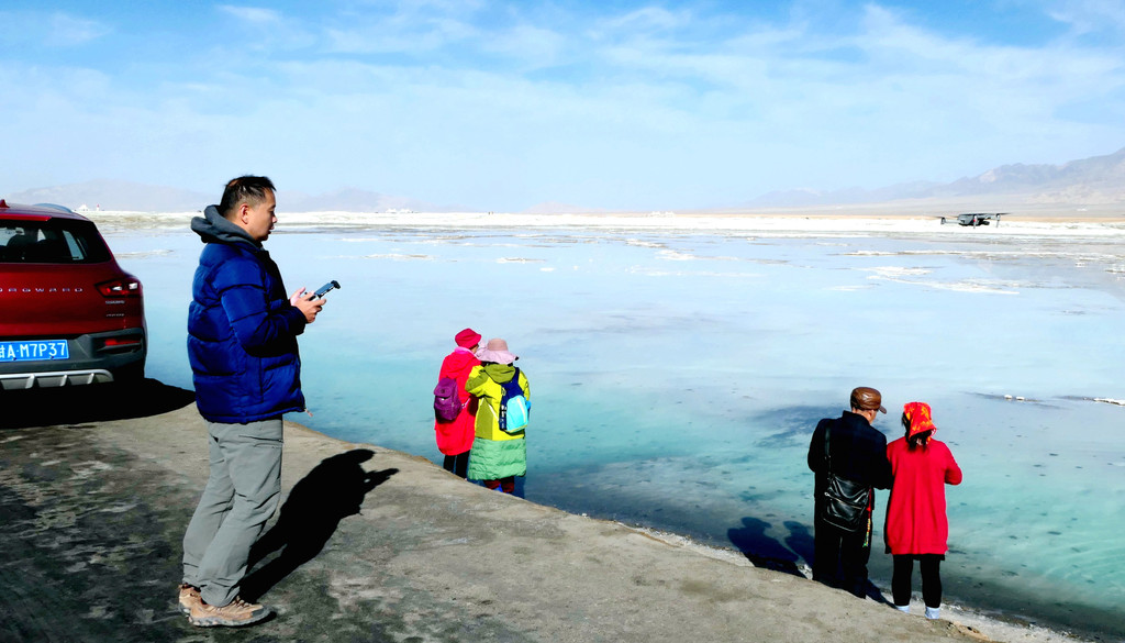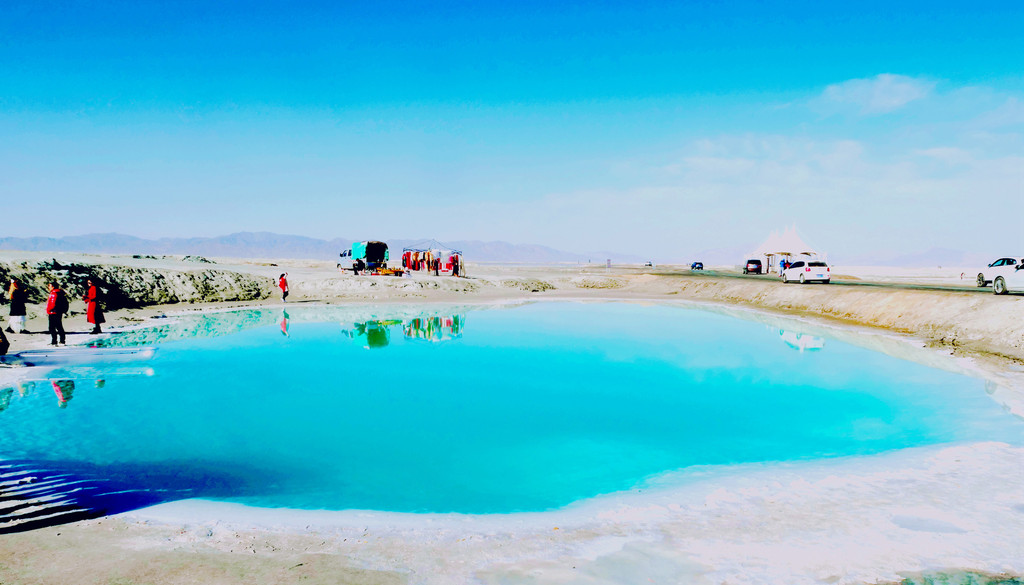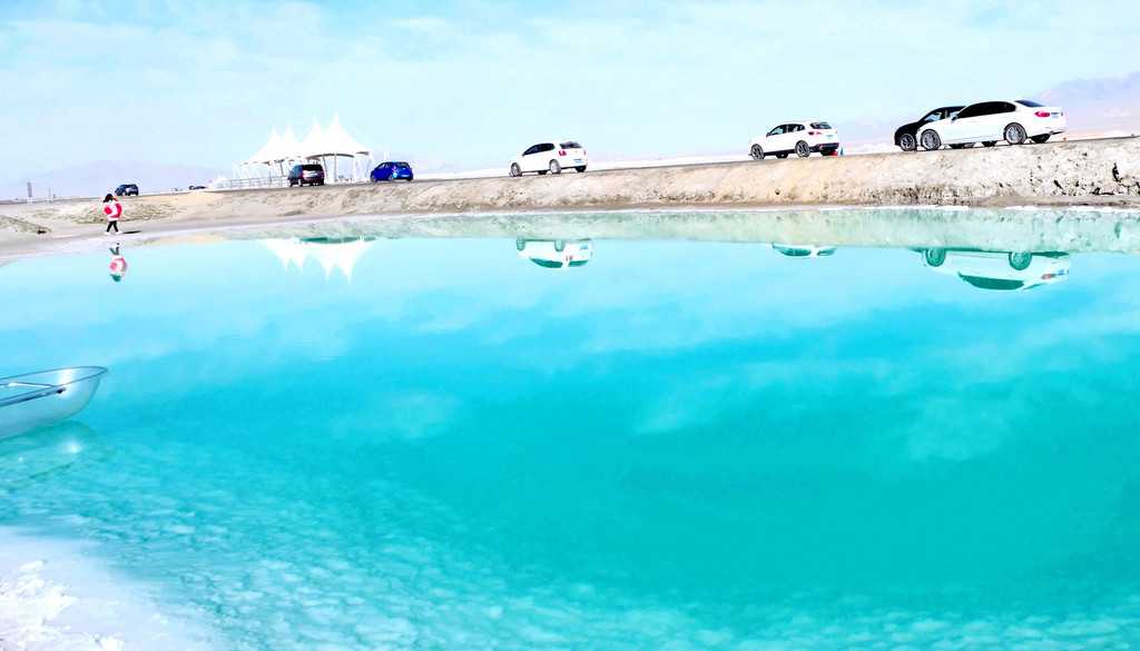 10:45进入真正的翡翠湖区域,刚刚驶抵路口就看到一汪碧蓝的湖水,小湖面积不大,但却晶莹剔透,湖底全为洁白的盐晶,湖面上倒映着蓝天白云,景色堪称绝佳。这片水域也是整个翡翠湖景区内最受欢迎的打卡景点,湖边有专门出租艳丽服饰的摊位,湖面上也停靠着一只全透明的塑料小船,游人可以付费划入湖心留影,我们也在此处拍下“到此一游”。