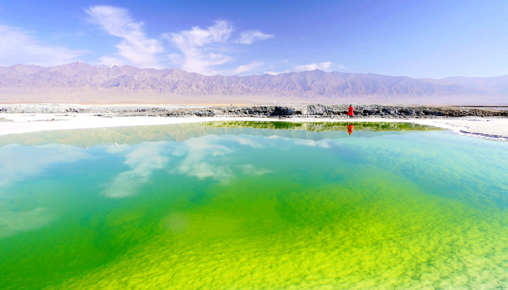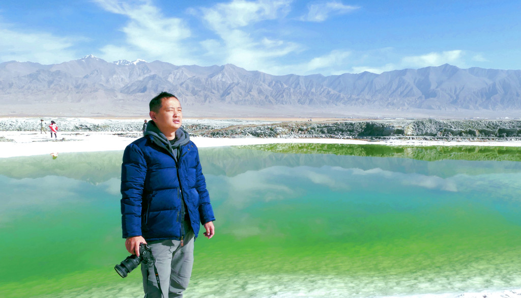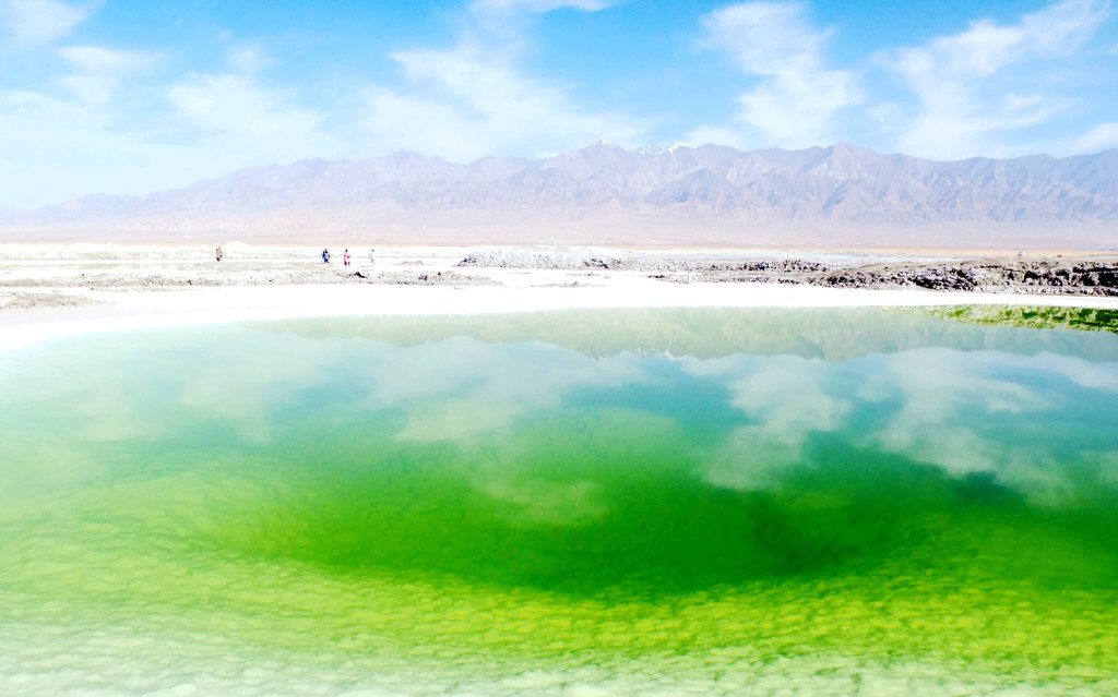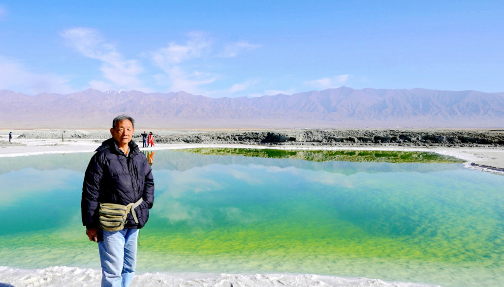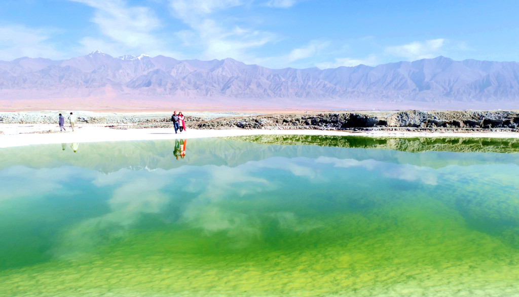 10:45进入真正的翡翠湖区域,刚刚驶抵路口就看到一汪碧蓝的湖水,小湖面积不大,但却晶莹剔透,湖底全为洁白的盐晶,湖面上倒映着蓝天白云,景色堪称绝佳。这片水域也是整个翡翠湖景区内最受欢迎的打卡景点,湖边有专门出租艳丽服饰的摊位,湖面上也停靠着一只全透明的塑料小船,游人可以付费划入湖心留影,我们也在此处拍下“到此一游”。