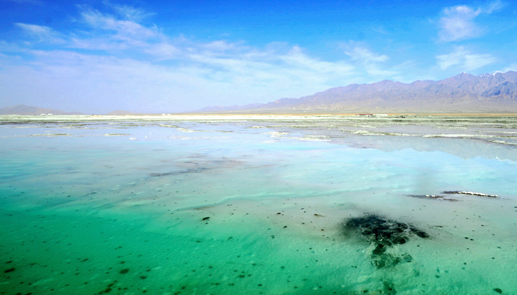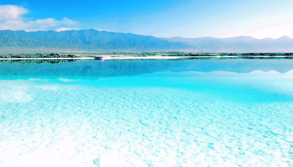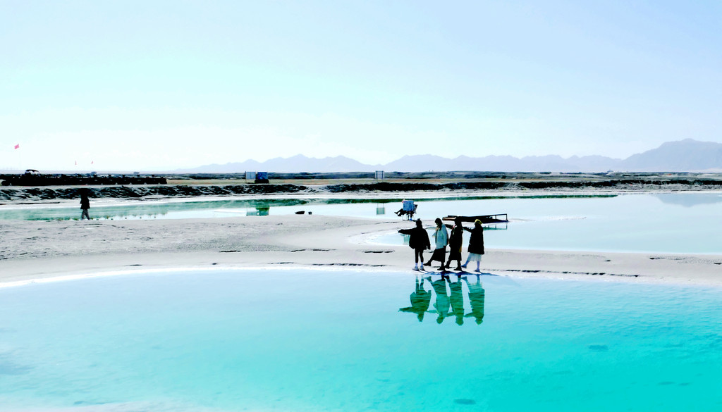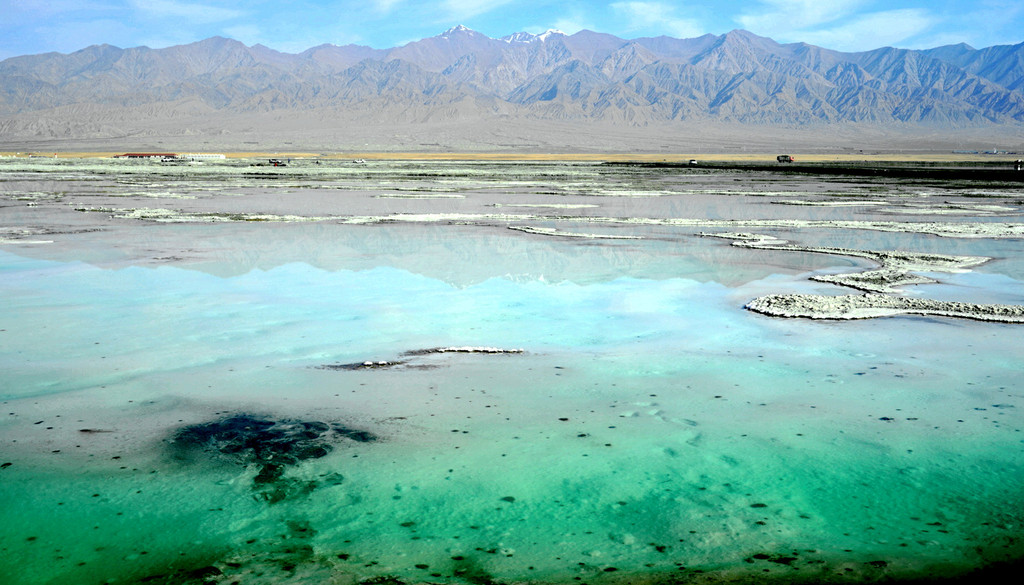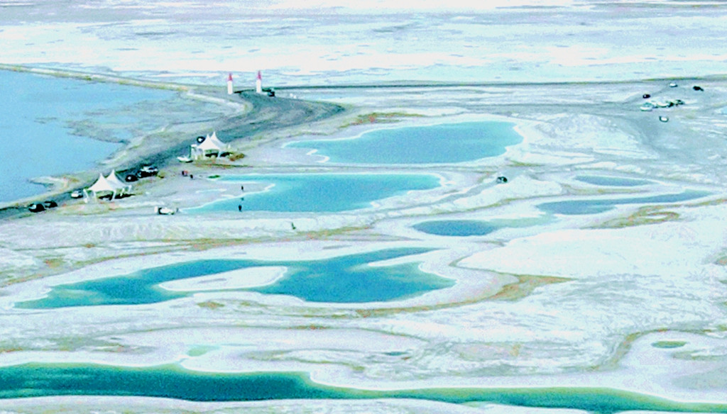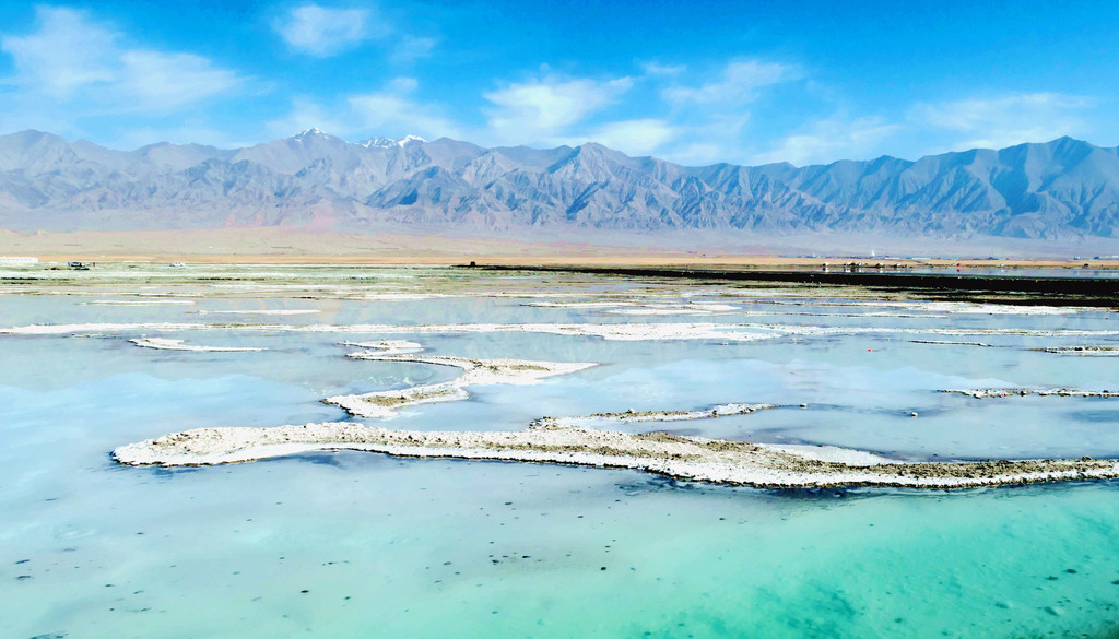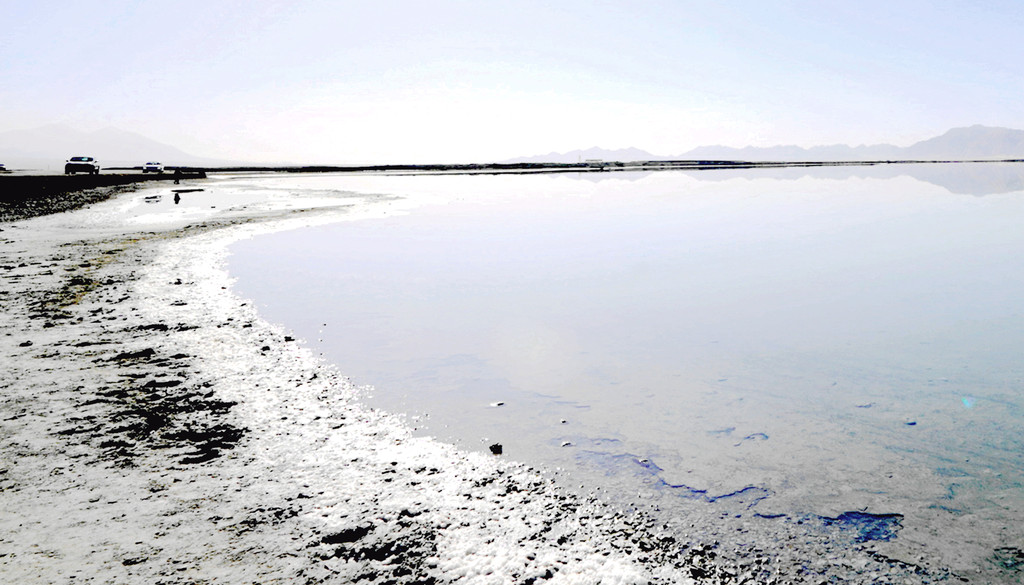 接下来的景点又是另外一番摸样,路边的湖水变成为只是一种颜色,那就是清澈、纯净的蓝色。湖底遍是洁白盐晶,正午时分日照强烈,湖底盐晶反射阳光映衬湖水的蓝色,又让湖面散发出乳白、微蓝、浅蓝、湛蓝、碧蓝等不同色调的光芒,景色也是堪称一绝。