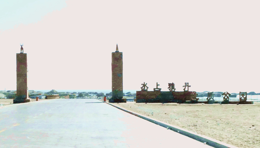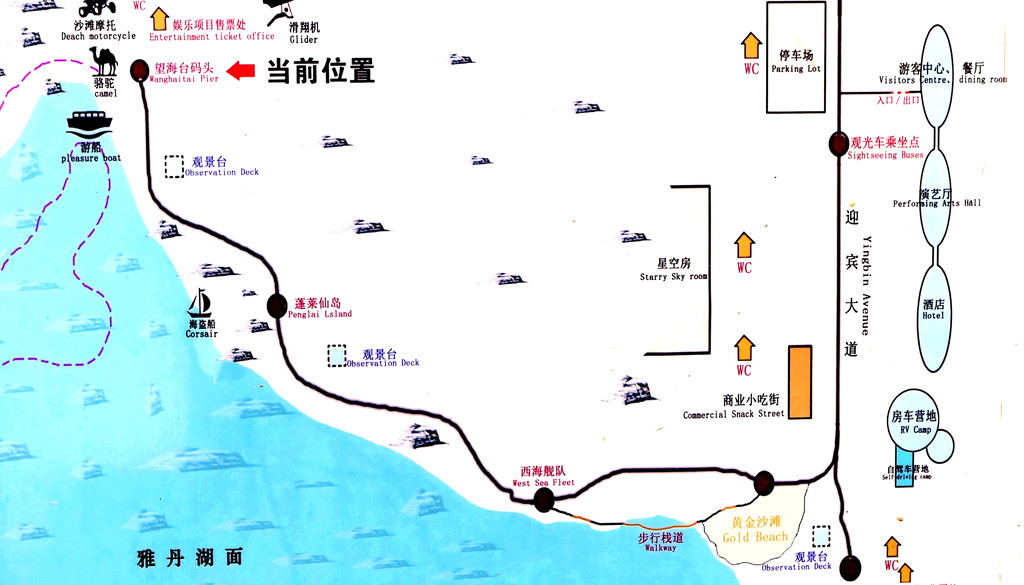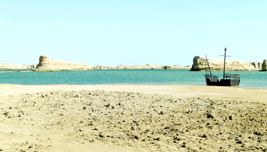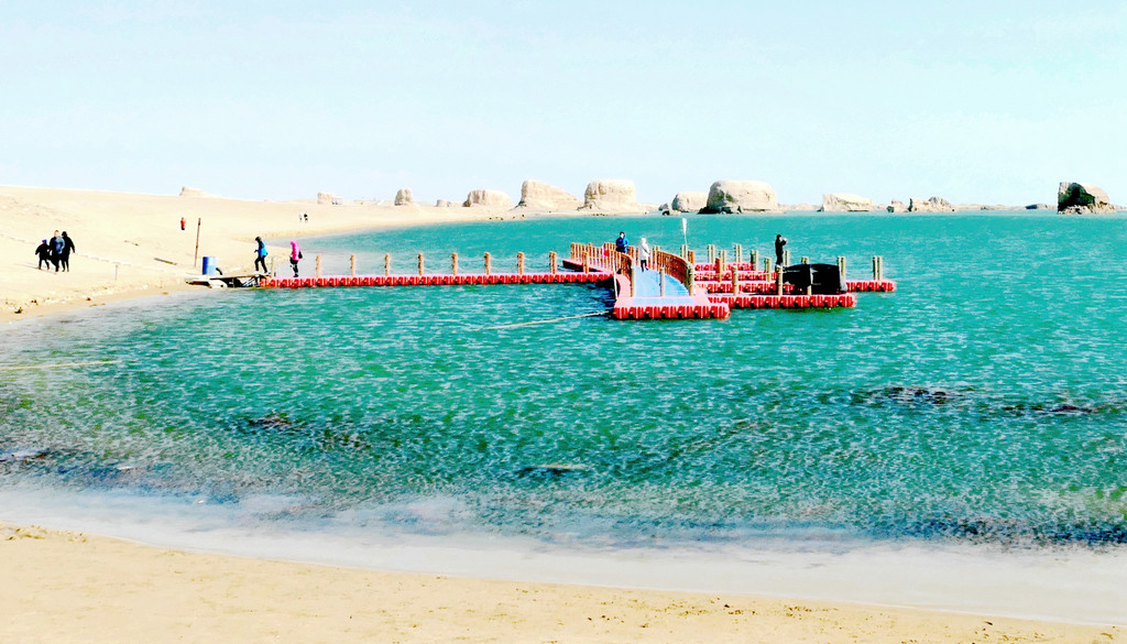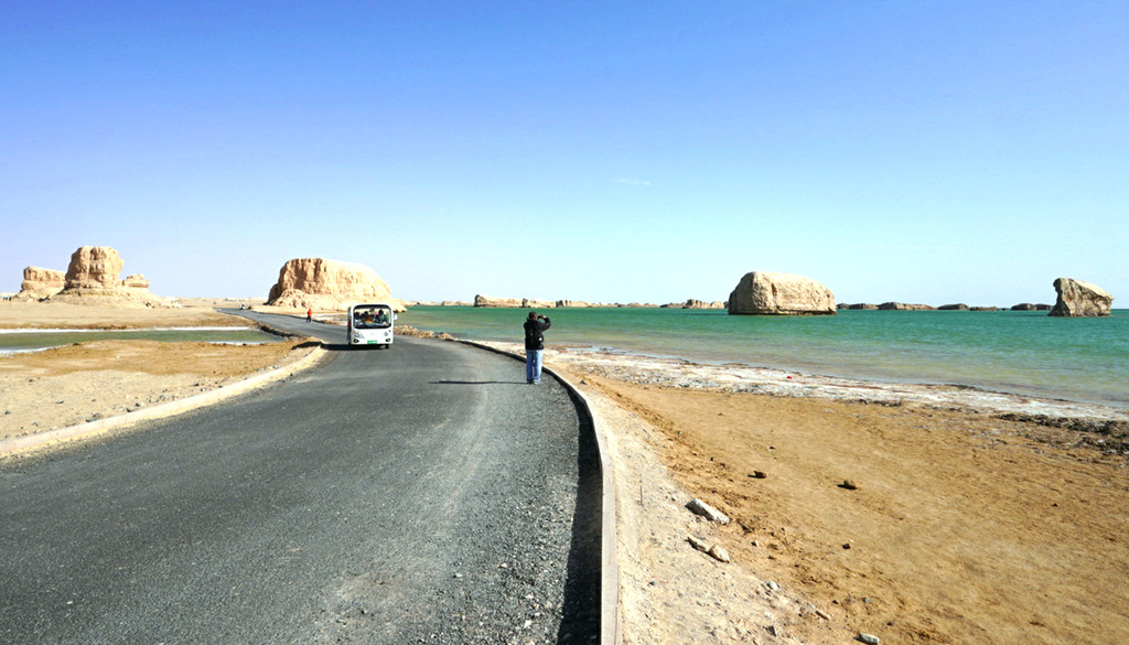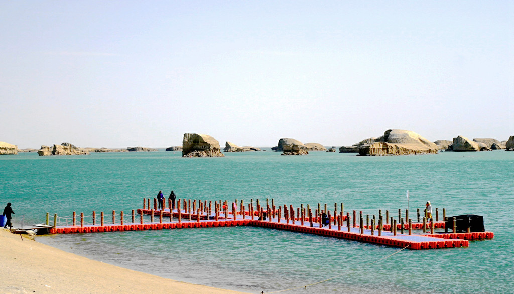 14:50登上观光车,中间不停(因为没人要求下车),大约10分钟后抵达终点“望海台码头”。此处的湖畔有座游艇码头,但却并无游艇停靠,路边的标志牌上显示附近还有沙漠车、骑骆驼、滑翔机等各种旅游服务项目,但此刻也都是不见踪影,估计是因旅游淡季的缘故。从这里出发可以徒步进入雅丹深处,然而,乘车过来的绝大多数游客都是下车后只在附近转转,然后又再乘车折返游客中心。