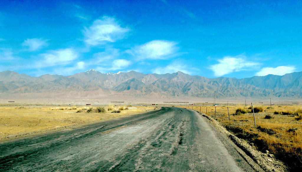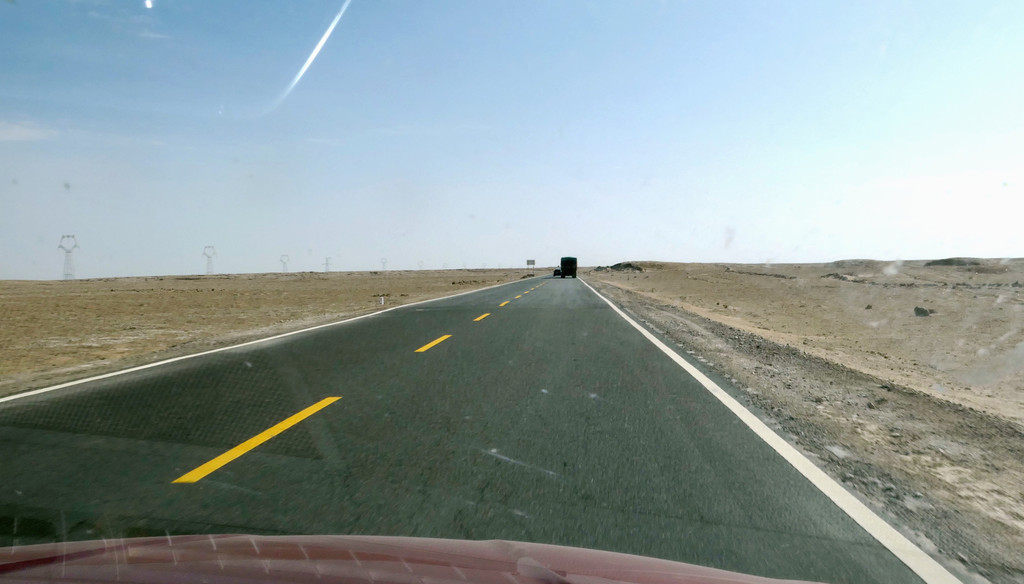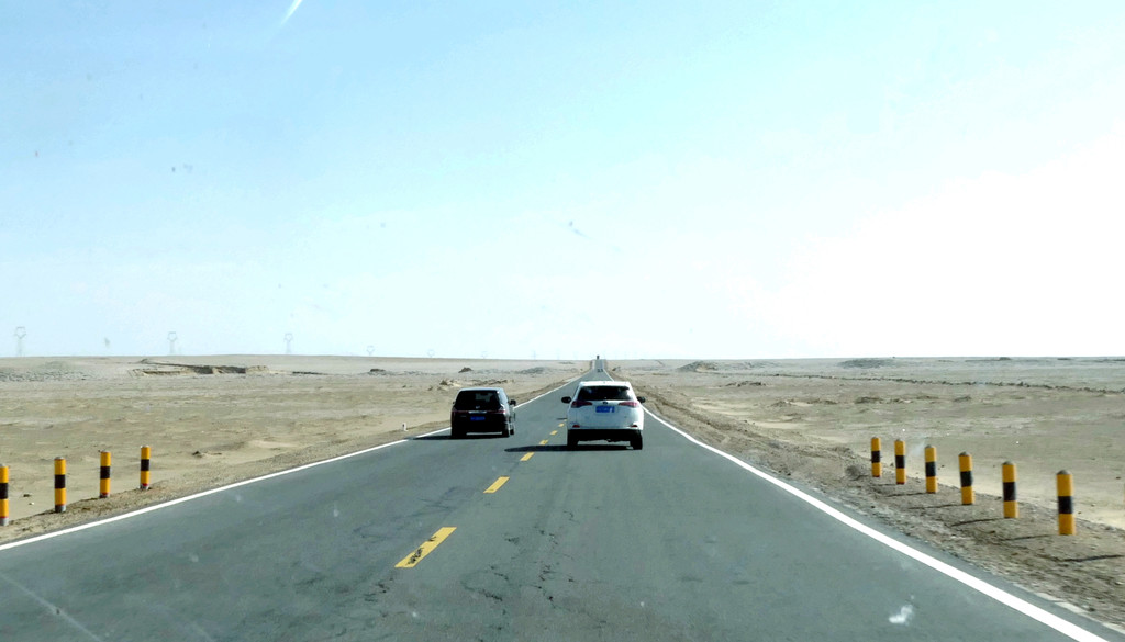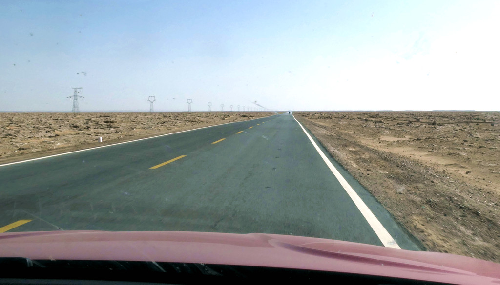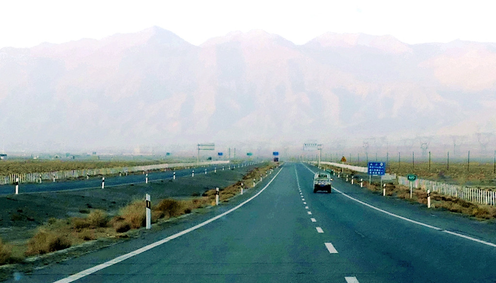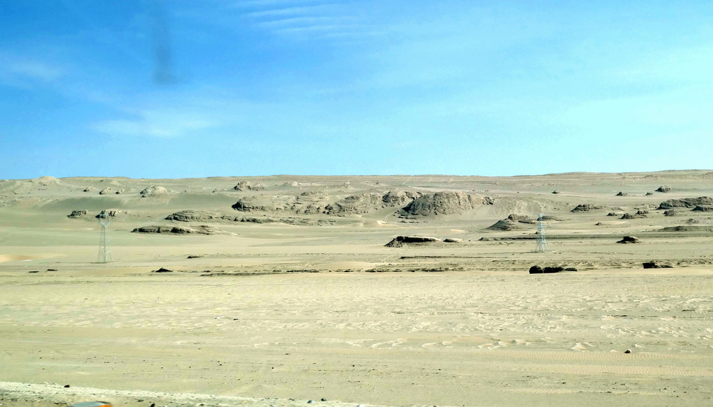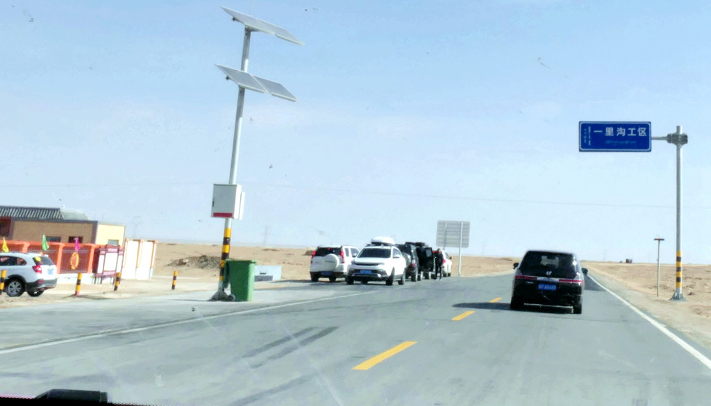 “一里沟工区”过后又是一马平川,除去一眼望不到头的国道以及一座又一座的路边高压电塔,其他就只有万里无云的蓝天和广袤无垠的戈壁,这也正是我们今天一路走来所最常看到的景色。