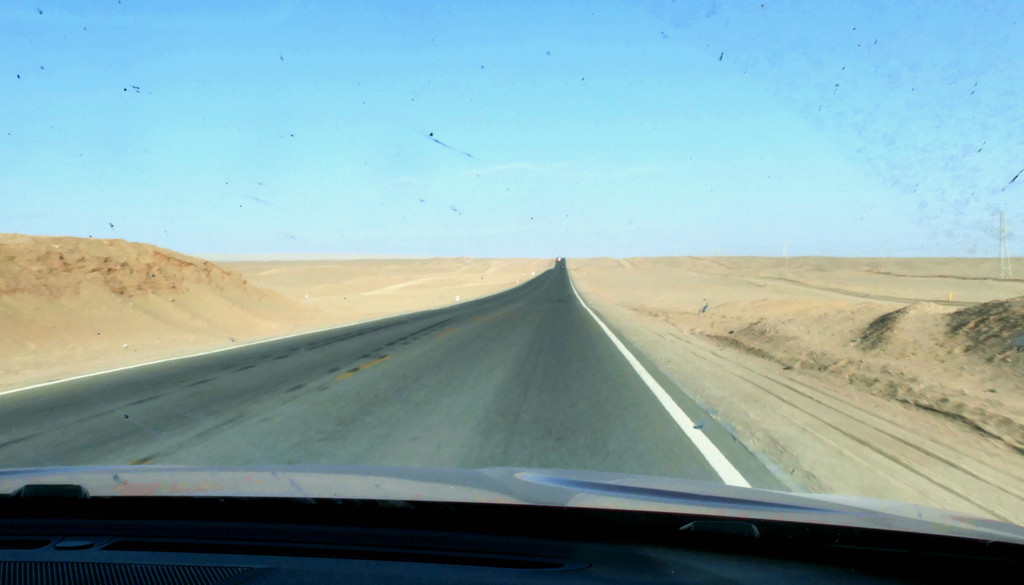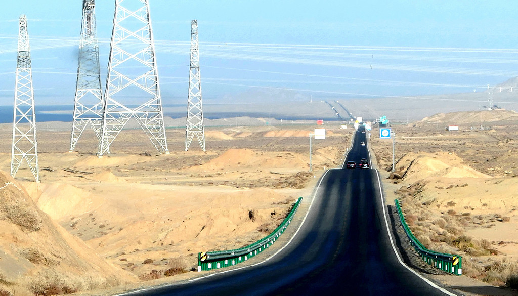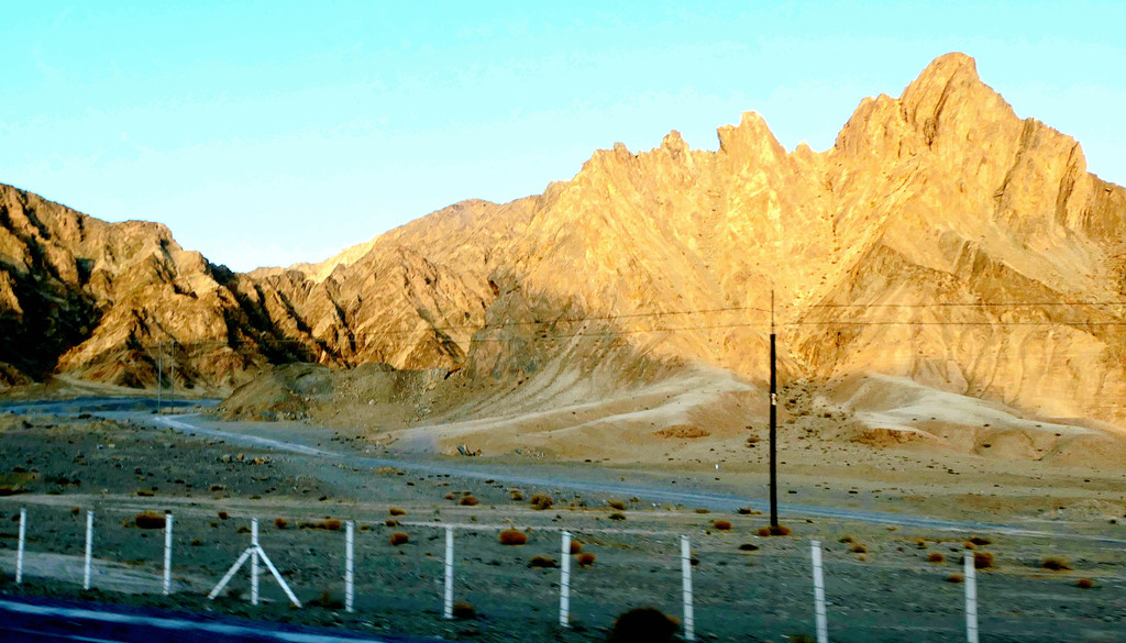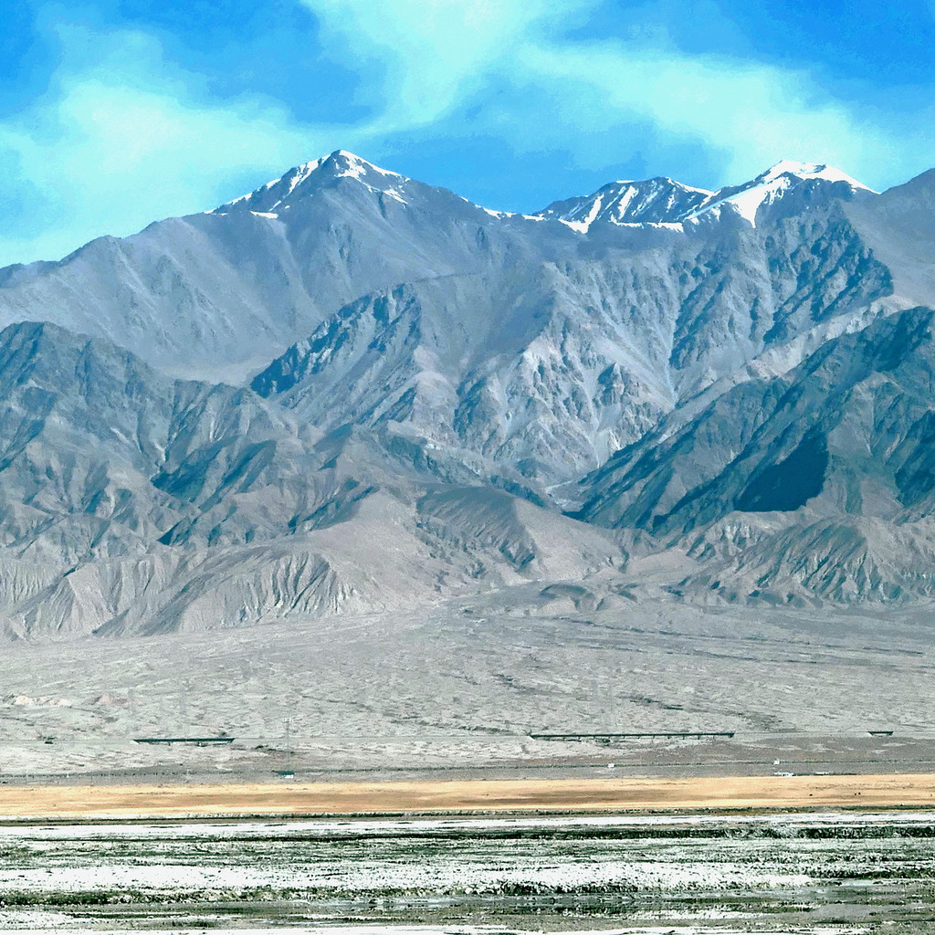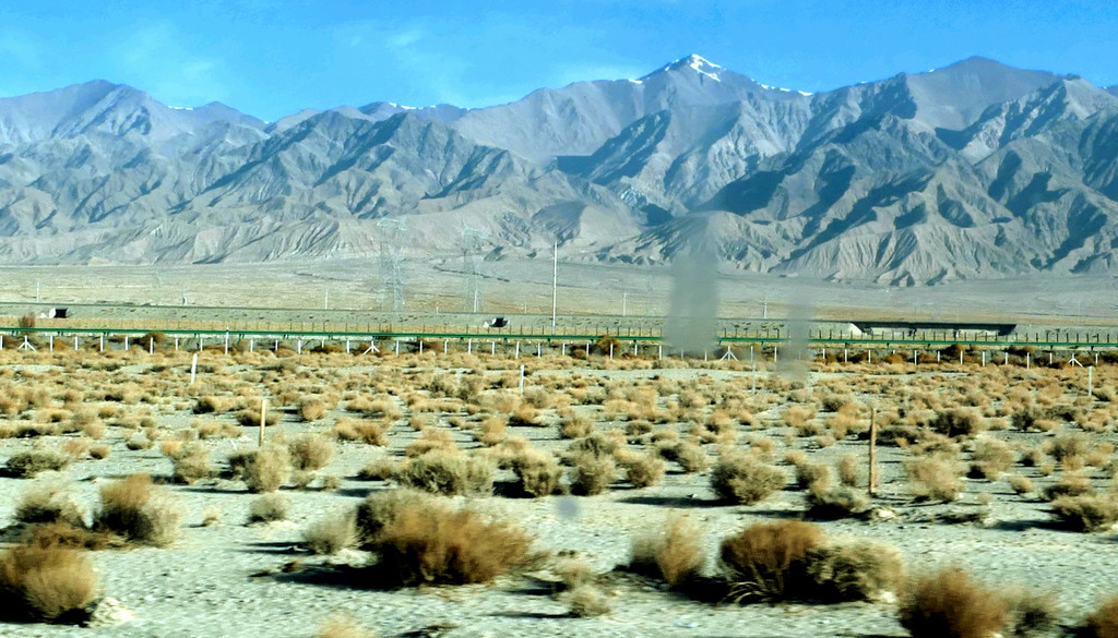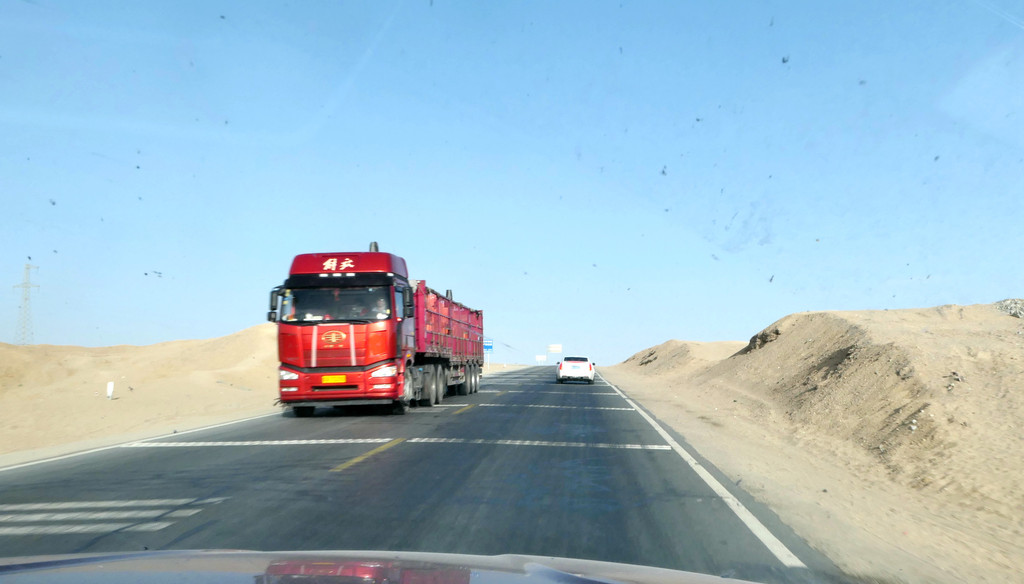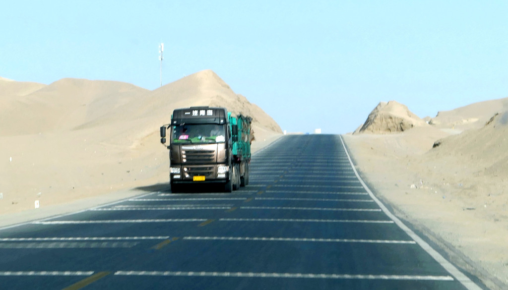 “一里沟工区”过后又是一马平川,除去一眼望不到头的国道以及一座又一座的路边高压电塔,其他就只有万里无云的蓝天和广袤无垠的戈壁,这也正是我们今天一路走来所最常看到的景色。