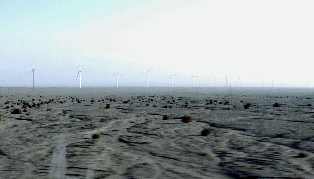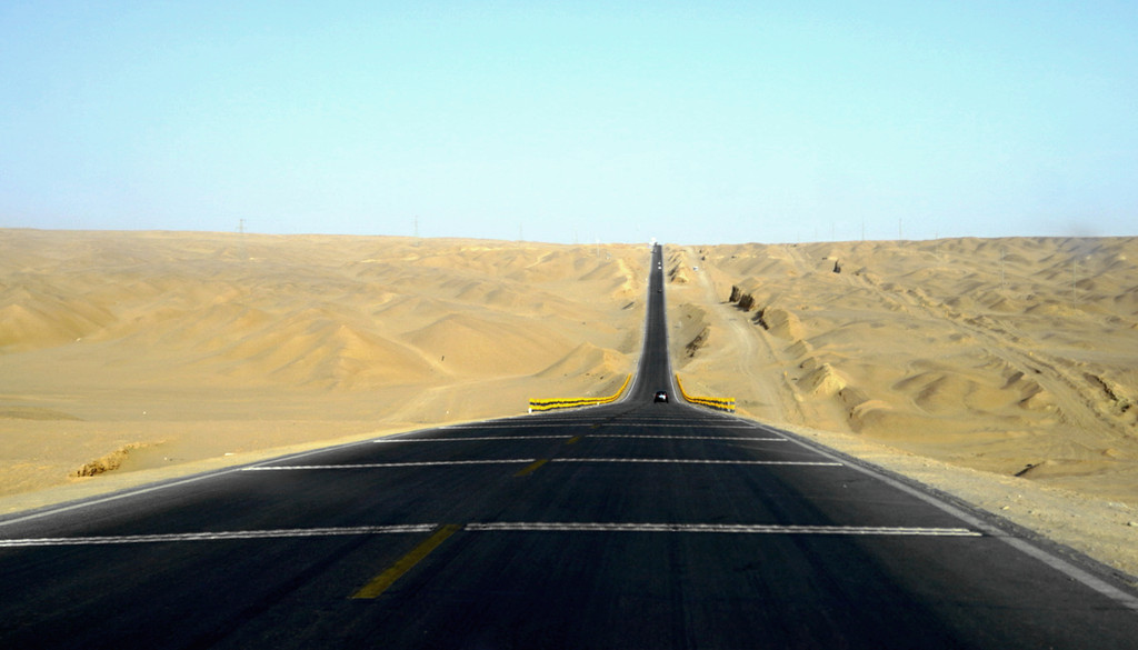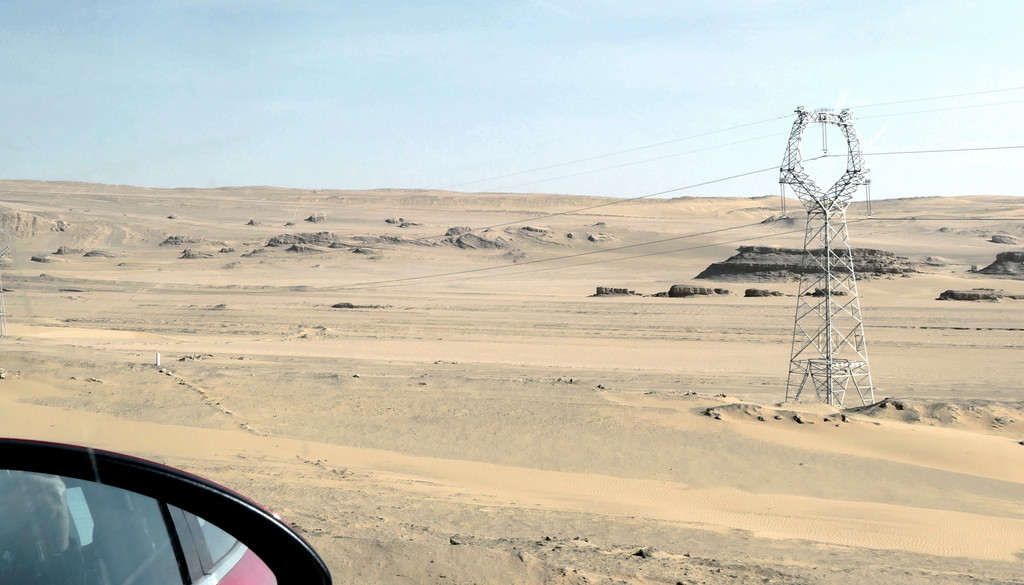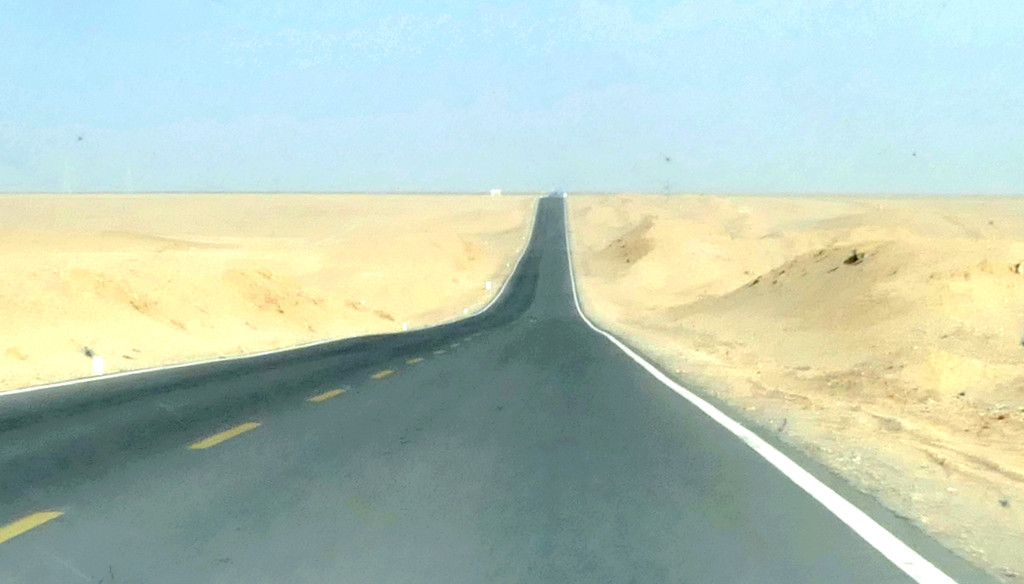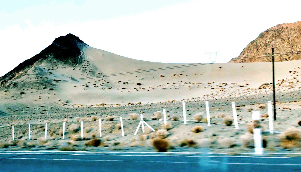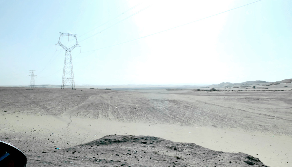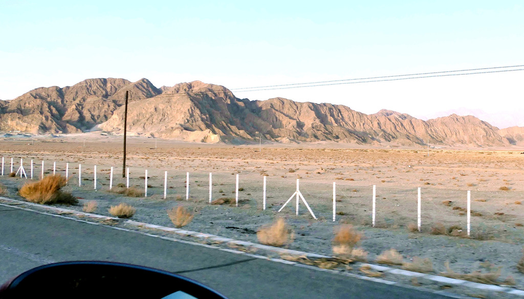 “一里沟工区”过后又是一马平川,除去一眼望不到头的国道以及一座又一座的路边高压电塔,其他就只有万里无云的蓝天和广袤无垠的戈壁,这也正是我们今天一路走来所最常看到的景色。