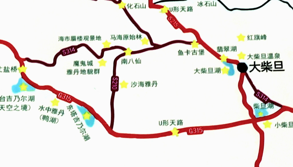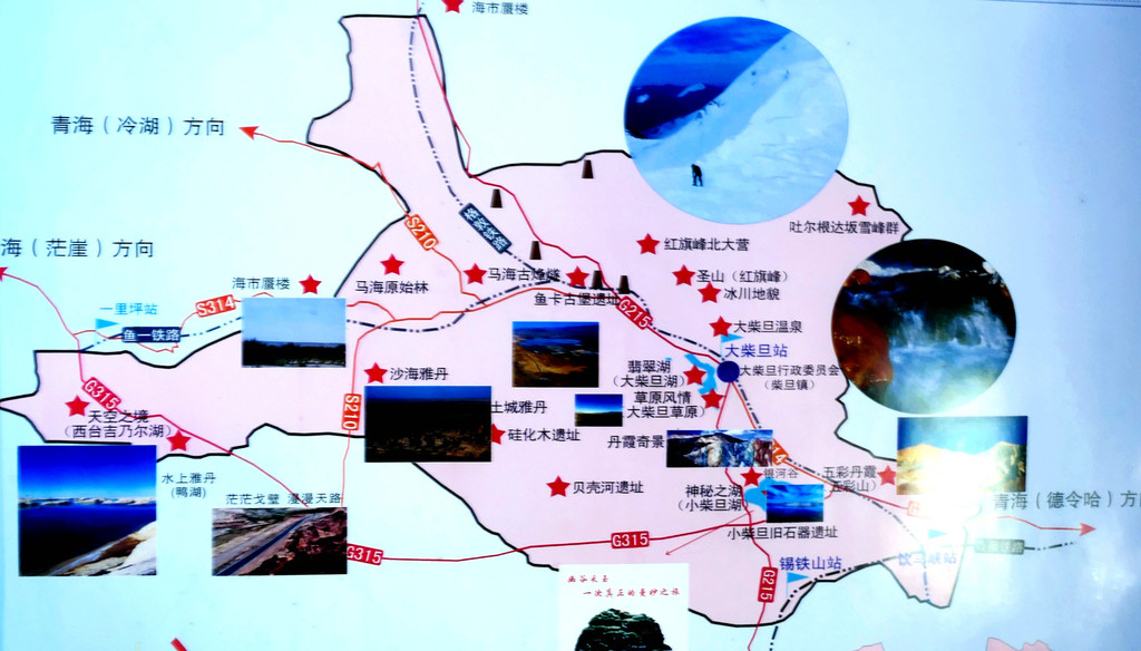 11:32离开景区,11:49重返大柴旦城区,依旧是选择人民路上的那家湖南餐厅吃午饭,昨晚人满为患,此刻却是冷冷清清,因为还不到当地的饭点。据这家饭店老板说,大柴旦地理偏西,当地人的午餐时刻大多都是在13:30左右。就餐时看到餐厅内有张大柴旦旅游景点分布图,顺手拍下。