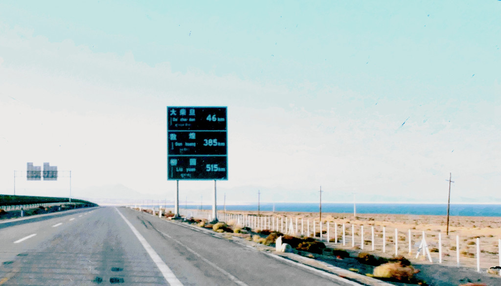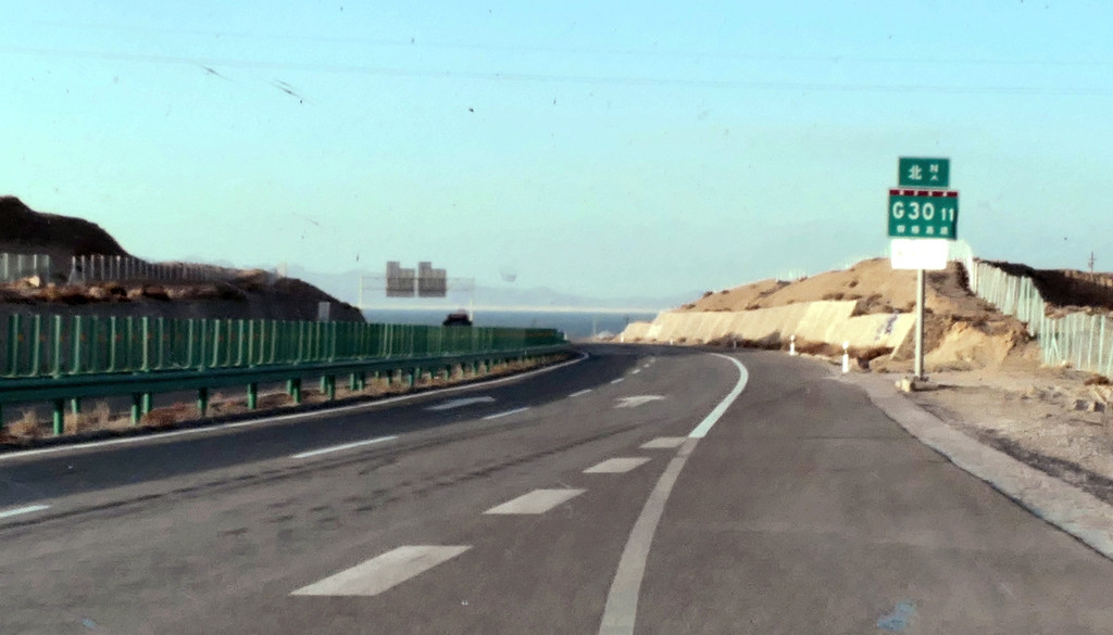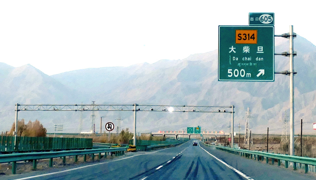 18:11驶经“小柴旦”停车区,此处左前方的远处显露出大片蓝色水面,那便是小柴旦湖。继续向前,驶抵“小柴旦交通枢纽”,国道G315与柳格高速G3011在此处交汇,我们离开G315,转入柳格高速,向柳园方向行驶,此处距离“大柴旦”还有46公里。高速路口居然未设收费站,我们既无需缴费,也无需取卡,只是按照路标的指引,先向右,再向左,拐了几个弯,莫名其妙就上了高速。